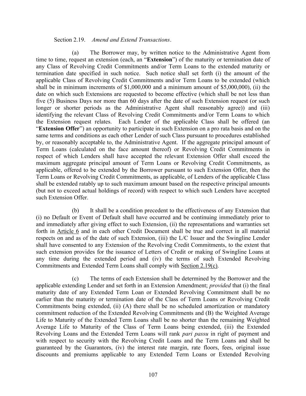 107 Section 2.19. Amend and Extend Transactions. (a) The Borrower may, by written notice to the Administrative Agent from time to time, request an extension (each, an “Extension”) of the maturity or termination date of any Class of Revolving Credit Commitments and/or Term Loans to the extended maturity or termination date specified in such notice. Such notice shall set forth (i) the amount of the applicable Class of Revolving Credit Commitments and/or Term Loans to be extended (which shall be in minimum increments of $1,000,000 and a minimum amount of $5,000,000), (ii) the date on which such Extensions are requested to become effective (which shall be not less than five (5) Business Days nor more than 60 days after the date of such Extension request (or such longer or shorter periods as the Administrative Agent shall reasonably agree)) and (iii) identifying the relevant Class of Revolving Credit Commitments and/or Term Loans to which the Extension request relates. Each Lender of the applicable Class shall be offered (an “Extension Offer”) an opportunity to participate in such Extension on a pro rata basis and on the same terms and conditions as each other Lender of such Class pursuant to procedures established by, or reasonably acceptable to, the Administrative Agent. If the aggregate principal amount of Term Loans (calculated on the face amount thereof) or Revolving Credit Commitments in respect of which Lenders shall have accepted the relevant Extension Offer shall exceed the maximum aggregate principal amount of Term Loans or Revolving Credit Commitments, as applicable, offered to be extended by the Borrower pursuant to such Extension Offer, then the Term Loans or Revolving Credit Commitments, as applicable, of Lenders of the applicable Class shall be extended ratably up to such maximum amount based on the respective principal amounts (but not to exceed actual holdings of record) with respect to which such Lenders have accepted such Extension Offer. (b) It shall be a condition precedent to the effectiveness of any Extension that (i) no Default or Event of Default shall have occurred and be continuing immediately prior to and immediately after giving effect to such Extension, (ii) the representations and warranties set forth in Article 6 and in each other Credit Document shall be true and correct in all material respects on and as of the date of such Extension, (iii) the L/C Issuer and the Swingline Lender shall have consented to any Extension of the Revolving Credit Commitments, to the extent that such extension provides for the issuance of Letters of Credit or making of Swingline Loans at any time during the extended period and (iv) the terms of such Extended Revolving Commitments and Extended Term Loans shall comply with Section 2.19(c). (c) The terms of each Extension shall be determined by the Borrower and the applicable extending Lender and set forth in an Extension Amendment; provided that (i) the final maturity date of any Extended Term Loan or Extended Revolving Commitment shall be no earlier than the maturity or termination date of the Class of Term Loans or Revolving Credit Commitments being extended, (ii) (A) there shall be no scheduled amortization or mandatory commitment reduction of the Extended Revolving Commitments and (B) the Weighted Average Life to Maturity of the Extended Term Loans shall be no shorter than the remaining Weighted Average Life to Maturity of the Class of Term Loans being extended, (iii) the Extended Revolving Loans and the Extended Term Loans will rank pari passu in right of payment and with respect to security with the Revolving Credit Loans and the Term Loans and shall be guaranteed by the Guarantors, (iv) the interest rate margin, rate floors, fees, original issue discounts and premiums applicable to any Extended Term Loans or Extended Revolving