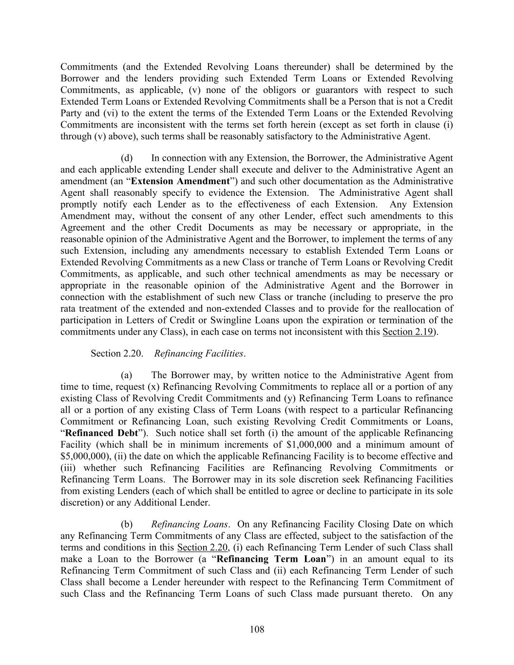 108 Commitments (and the Extended Revolving Loans thereunder) shall be determined by the Borrower and the lenders providing such Extended Term Loans or Extended Revolving Commitments, as applicable, (v) none of the obligors or guarantors with respect to such Extended Term Loans or Extended Revolving Commitments shall be a Person that is not a Credit Party and (vi) to the extent the terms of the Extended Term Loans or the Extended Revolving Commitments are inconsistent with the terms set forth herein (except as set forth in clause (i) through (v) above), such terms shall be reasonably satisfactory to the Administrative Agent. (d) In connection with any Extension, the Borrower, the Administrative Agent and each applicable extending Lender shall execute and deliver to the Administrative Agent an amendment (an “Extension Amendment”) and such other documentation as the Administrative Agent shall reasonably specify to evidence the Extension. The Administrative Agent shall promptly notify each Lender as to the effectiveness of each Extension. Any Extension Amendment may, without the consent of any other Lender, effect such amendments to this Agreement and the other Credit Documents as may be necessary or appropriate, in the reasonable opinion of the Administrative Agent and the Borrower, to implement the terms of any such Extension, including any amendments necessary to establish Extended Term Loans or Extended Revolving Commitments as a new Class or tranche of Term Loans or Revolving Credit Commitments, as applicable, and such other technical amendments as may be necessary or appropriate in the reasonable opinion of the Administrative Agent and the Borrower in connection with the establishment of such new Class or tranche (including to preserve the pro rata treatment of the extended and non-extended Classes and to provide for the reallocation of participation in Letters of Credit or Swingline Loans upon the expiration or termination of the commitments under any Class), in each case on terms not inconsistent with this Section 2.19). Section 2.20. Refinancing Facilities. (a) The Borrower may, by written notice to the Administrative Agent from time to time, request (x) Refinancing Revolving Commitments to replace all or a portion of any existing Class of Revolving Credit Commitments and (y) Refinancing Term Loans to refinance all or a portion of any existing Class of Term Loans (with respect to a particular Refinancing Commitment or Refinancing Loan, such existing Revolving Credit Commitments or Loans, “Refinanced Debt”). Such notice shall set forth (i) the amount of the applicable Refinancing Facility (which shall be in minimum increments of $1,000,000 and a minimum amount of $5,000,000), (ii) the date on which the applicable Refinancing Facility is to become effective and (iii) whether such Refinancing Facilities are Refinancing Revolving Commitments or Refinancing Term Loans. The Borrower may in its sole discretion seek Refinancing Facilities from existing Lenders (each of which shall be entitled to agree or decline to participate in its sole discretion) or any Additional Lender. (b) Refinancing Loans. On any Refinancing Facility Closing Date on which any Refinancing Term Commitments of any Class are effected, subject to the satisfaction of the terms and conditions in this Section 2.20, (i) each Refinancing Term Lender of such Class shall make a Loan to the Borrower (a “Refinancing Term Loan”) in an amount equal to its Refinancing Term Commitment of such Class and (ii) each Refinancing Term Lender of such Class shall become a Lender hereunder with respect to the Refinancing Term Commitment of such Class and the Refinancing Term Loans of such Class made pursuant thereto. On any