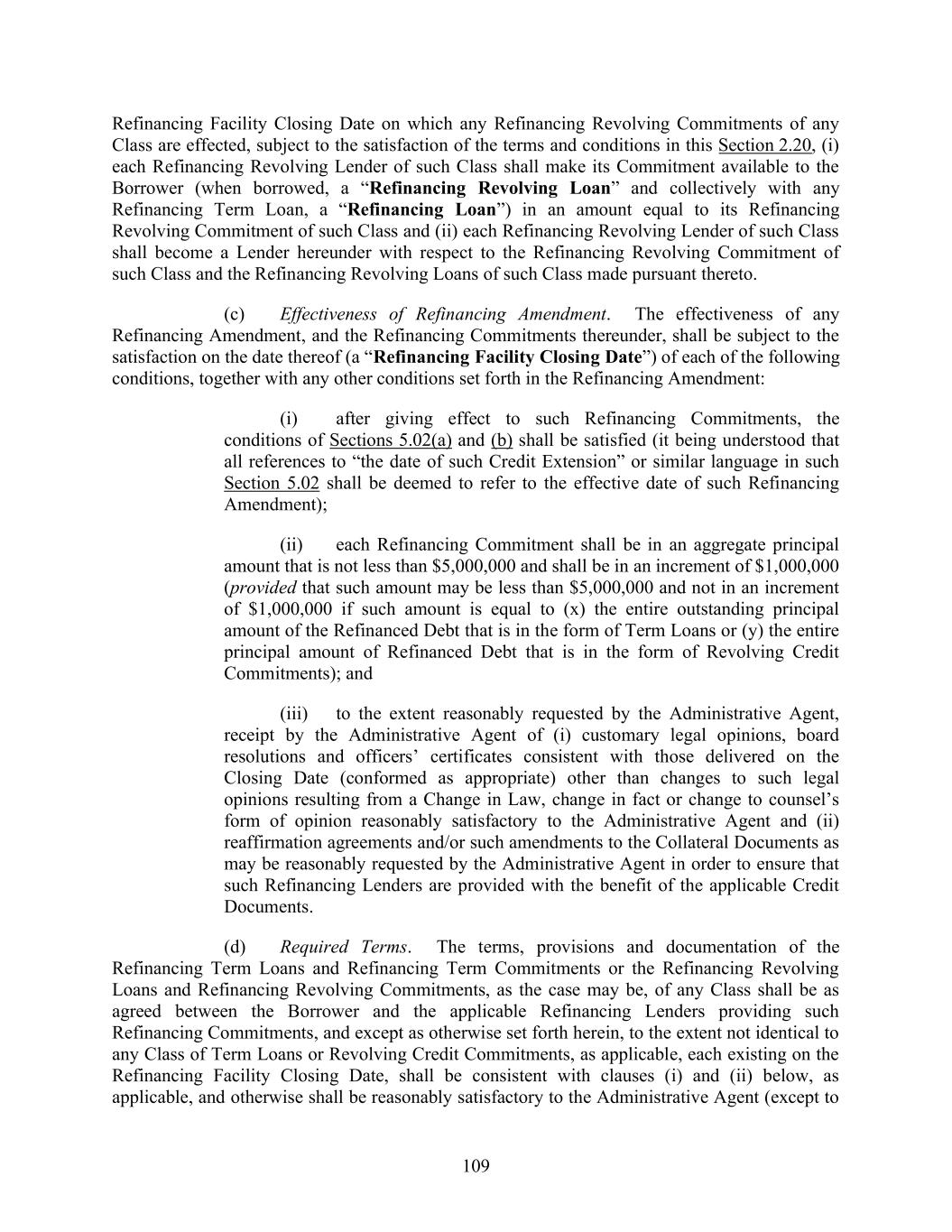 109 Refinancing Facility Closing Date on which any Refinancing Revolving Commitments of any Class are effected, subject to the satisfaction of the terms and conditions in this Section 2.20, (i) each Refinancing Revolving Lender of such Class shall make its Commitment available to the Borrower (when borrowed, a “Refinancing Revolving Loan” and collectively with any Refinancing Term Loan, a “Refinancing Loan”) in an amount equal to its Refinancing Revolving Commitment of such Class and (ii) each Refinancing Revolving Lender of such Class shall become a Lender hereunder with respect to the Refinancing Revolving Commitment of such Class and the Refinancing Revolving Loans of such Class made pursuant thereto. (c) Effectiveness of Refinancing Amendment. The effectiveness of any Refinancing Amendment, and the Refinancing Commitments thereunder, shall be subject to the satisfaction on the date thereof (a “Refinancing Facility Closing Date”) of each of the following conditions, together with any other conditions set forth in the Refinancing Amendment: (i) after giving effect to such Refinancing Commitments, the conditions of Sections 5.02(a) and (b) shall be satisfied (it being understood that all references to “the date of such Credit Extension” or similar language in such Section 5.02 shall be deemed to refer to the effective date of such Refinancing Amendment); (ii) each Refinancing Commitment shall be in an aggregate principal amount that is not less than $5,000,000 and shall be in an increment of $1,000,000 (provided that such amount may be less than $5,000,000 and not in an increment of $1,000,000 if such amount is equal to (x) the entire outstanding principal amount of the Refinanced Debt that is in the form of Term Loans or (y) the entire principal amount of Refinanced Debt that is in the form of Revolving Credit Commitments); and (iii) to the extent reasonably requested by the Administrative Agent, receipt by the Administrative Agent of (i) customary legal opinions, board resolutions and officers’ certificates consistent with those delivered on the Closing Date (conformed as appropriate) other than changes to such legal opinions resulting from a Change in Law, change in fact or change to counsel’s form of opinion reasonably satisfactory to the Administrative Agent and (ii) reaffirmation agreements and/or such amendments to the Collateral Documents as may be reasonably requested by the Administrative Agent in order to ensure that such Refinancing Lenders are provided with the benefit of the applicable Credit Documents. (d) Required Terms. The terms, provisions and documentation of the Refinancing Term Loans and Refinancing Term Commitments or the Refinancing Revolving Loans and Refinancing Revolving Commitments, as the case may be, of any Class shall be as agreed between the Borrower and the applicable Refinancing Lenders providing such Refinancing Commitments, and except as otherwise set forth herein, to the extent not identical to any Class of Term Loans or Revolving Credit Commitments, as applicable, each existing on the Refinancing Facility Closing Date, shall be consistent with clauses (i) and (ii) below, as applicable, and otherwise shall be reasonably satisfactory to the Administrative Agent (except to