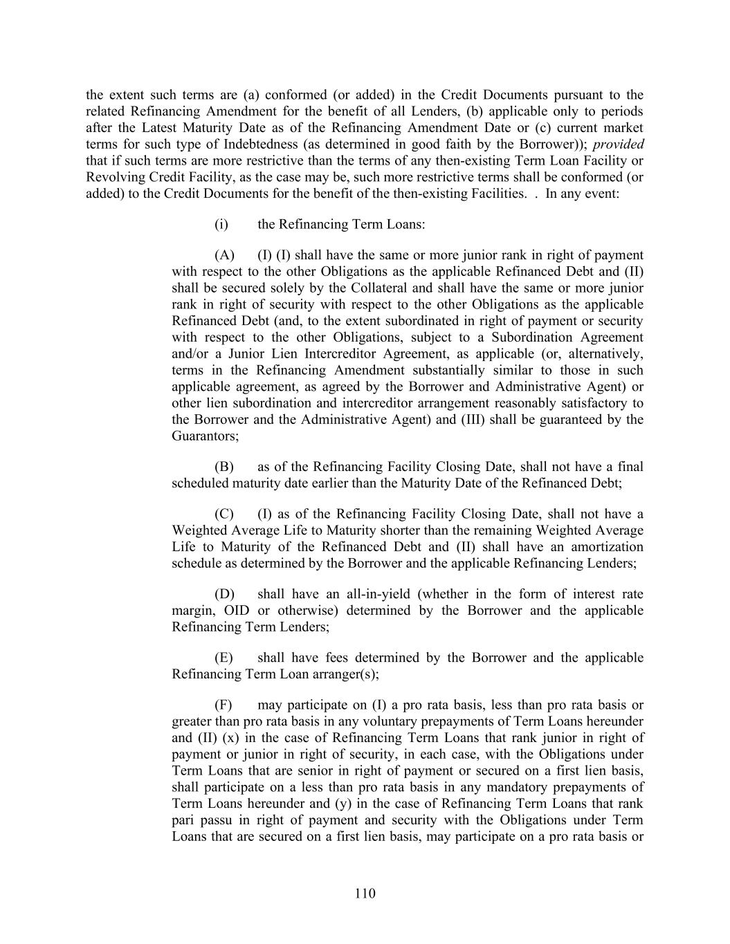 110 the extent such terms are (a) conformed (or added) in the Credit Documents pursuant to the related Refinancing Amendment for the benefit of all Lenders, (b) applicable only to periods after the Latest Maturity Date as of the Refinancing Amendment Date or (c) current market terms for such type of Indebtedness (as determined in good faith by the Borrower)); provided that if such terms are more restrictive than the terms of any then-existing Term Loan Facility or Revolving Credit Facility, as the case may be, such more restrictive terms shall be conformed (or added) to the Credit Documents for the benefit of the then-existing Facilities. . In any event: (i) the Refinancing Term Loans: (A) (I) (I) shall have the same or more junior rank in right of payment with respect to the other Obligations as the applicable Refinanced Debt and (II) shall be secured solely by the Collateral and shall have the same or more junior rank in right of security with respect to the other Obligations as the applicable Refinanced Debt (and, to the extent subordinated in right of payment or security with respect to the other Obligations, subject to a Subordination Agreement and/or a Junior Lien Intercreditor Agreement, as applicable (or, alternatively, terms in the Refinancing Amendment substantially similar to those in such applicable agreement, as agreed by the Borrower and Administrative Agent) or other lien subordination and intercreditor arrangement reasonably satisfactory to the Borrower and the Administrative Agent) and (III) shall be guaranteed by the Guarantors; (B) as of the Refinancing Facility Closing Date, shall not have a final scheduled maturity date earlier than the Maturity Date of the Refinanced Debt; (C) (I) as of the Refinancing Facility Closing Date, shall not have a Weighted Average Life to Maturity shorter than the remaining Weighted Average Life to Maturity of the Refinanced Debt and (II) shall have an amortization schedule as determined by the Borrower and the applicable Refinancing Lenders; (D) shall have an all-in-yield (whether in the form of interest rate margin, OID or otherwise) determined by the Borrower and the applicable Refinancing Term Lenders; (E) shall have fees determined by the Borrower and the applicable Refinancing Term Loan arranger(s); (F) may participate on (I) a pro rata basis, less than pro rata basis or greater than pro rata basis in any voluntary prepayments of Term Loans hereunder and (II) (x) in the case of Refinancing Term Loans that rank junior in right of payment or junior in right of security, in each case, with the Obligations under Term Loans that are senior in right of payment or secured on a first lien basis, shall participate on a less than pro rata basis in any mandatory prepayments of Term Loans hereunder and (y) in the case of Refinancing Term Loans that rank pari passu in right of payment and security with the Obligations under Term Loans that are secured on a first lien basis, may participate on a pro rata basis or