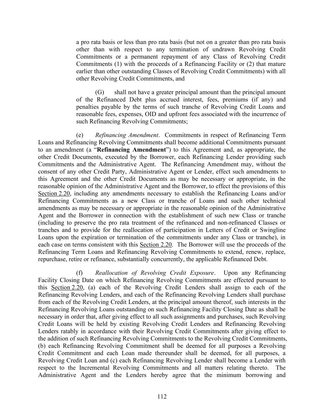 112 a pro rata basis or less than pro rata basis (but not on a greater than pro rata basis other than with respect to any termination of undrawn Revolving Credit Commitments or a permanent repayment of any Class of Revolving Credit Commitments (1) with the proceeds of a Refinancing Facility or (2) that mature earlier than other outstanding Classes of Revolving Credit Commitments) with all other Revolving Credit Commitments, and (G) shall not have a greater principal amount than the principal amount of the Refinanced Debt plus accrued interest, fees, premiums (if any) and penalties payable by the terms of such tranche of Revolving Credit Loans and reasonable fees, expenses, OID and upfront fees associated with the incurrence of such Refinancing Revolving Commitments; (e) Refinancing Amendment. Commitments in respect of Refinancing Term Loans and Refinancing Revolving Commitments shall become additional Commitments pursuant to an amendment (a “Refinancing Amendment”) to this Agreement and, as appropriate, the other Credit Documents, executed by the Borrower, each Refinancing Lender providing such Commitments and the Administrative Agent. The Refinancing Amendment may, without the consent of any other Credit Party, Administrative Agent or Lender, effect such amendments to this Agreement and the other Credit Documents as may be necessary or appropriate, in the reasonable opinion of the Administrative Agent and the Borrower, to effect the provisions of this Section 2.20, including any amendments necessary to establish the Refinancing Loans and/or Refinancing Commitments as a new Class or tranche of Loans and such other technical amendments as may be necessary or appropriate in the reasonable opinion of the Administrative Agent and the Borrower in connection with the establishment of such new Class or tranche (including to preserve the pro rata treatment of the refinanced and non-refinanced Classes or tranches and to provide for the reallocation of participation in Letters of Credit or Swingline Loans upon the expiration or termination of the commitments under any Class or tranche), in each case on terms consistent with this Section 2.20. The Borrower will use the proceeds of the Refinancing Term Loans and Refinancing Revolving Commitments to extend, renew, replace, repurchase, retire or refinance, substantially concurrently, the applicable Refinanced Debt. (f) Reallocation of Revolving Credit Exposure. Upon any Refinancing Facility Closing Date on which Refinancing Revolving Commitments are effected pursuant to this Section 2.20, (a) each of the Revolving Credit Lenders shall assign to each of the Refinancing Revolving Lenders, and each of the Refinancing Revolving Lenders shall purchase from each of the Revolving Credit Lenders, at the principal amount thereof, such interests in the Refinancing Revolving Loans outstanding on such Refinancing Facility Closing Date as shall be necessary in order that, after giving effect to all such assignments and purchases, such Revolving Credit Loans will be held by existing Revolving Credit Lenders and Refinancing Revolving Lenders ratably in accordance with their Revolving Credit Commitments after giving effect to the addition of such Refinancing Revolving Commitments to the Revolving Credit Commitments, (b) each Refinancing Revolving Commitment shall be deemed for all purposes a Revolving Credit Commitment and each Loan made thereunder shall be deemed, for all purposes, a Revolving Credit Loan and (c) each Refinancing Revolving Lender shall become a Lender with respect to the Incremental Revolving Commitments and all matters relating thereto. The Administrative Agent and the Lenders hereby agree that the minimum borrowing and