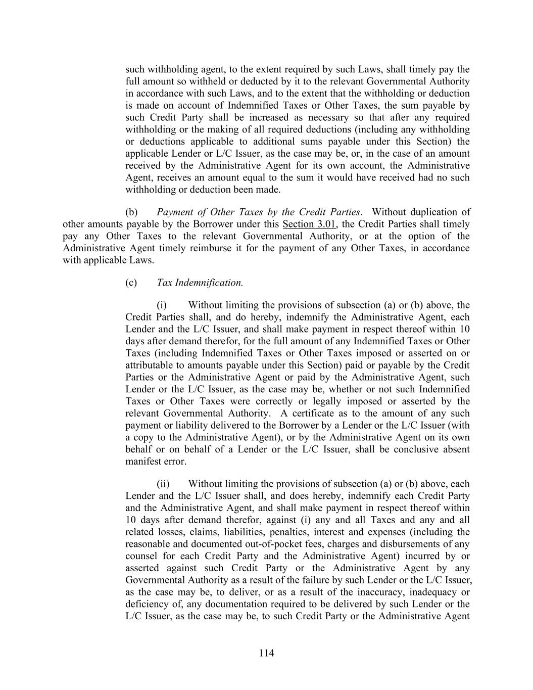 114 such withholding agent, to the extent required by such Laws, shall timely pay the full amount so withheld or deducted by it to the relevant Governmental Authority in accordance with such Laws, and to the extent that the withholding or deduction is made on account of Indemnified Taxes or Other Taxes, the sum payable by such Credit Party shall be increased as necessary so that after any required withholding or the making of all required deductions (including any withholding or deductions applicable to additional sums payable under this Section) the applicable Lender or L/C Issuer, as the case may be, or, in the case of an amount received by the Administrative Agent for its own account, the Administrative Agent, receives an amount equal to the sum it would have received had no such withholding or deduction been made. (b) Payment of Other Taxes by the Credit Parties. Without duplication of other amounts payable by the Borrower under this Section 3.01, the Credit Parties shall timely pay any Other Taxes to the relevant Governmental Authority, or at the option of the Administrative Agent timely reimburse it for the payment of any Other Taxes, in accordance with applicable Laws. (c) Tax Indemnification. (i) Without limiting the provisions of subsection (a) or (b) above, the Credit Parties shall, and do hereby, indemnify the Administrative Agent, each Lender and the L/C Issuer, and shall make payment in respect thereof within 10 days after demand therefor, for the full amount of any Indemnified Taxes or Other Taxes (including Indemnified Taxes or Other Taxes imposed or asserted on or attributable to amounts payable under this Section) paid or payable by the Credit Parties or the Administrative Agent or paid by the Administrative Agent, such Lender or the L/C Issuer, as the case may be, whether or not such Indemnified Taxes or Other Taxes were correctly or legally imposed or asserted by the relevant Governmental Authority. A certificate as to the amount of any such payment or liability delivered to the Borrower by a Lender or the L/C Issuer (with a copy to the Administrative Agent), or by the Administrative Agent on its own behalf or on behalf of a Lender or the L/C Issuer, shall be conclusive absent manifest error. (ii) Without limiting the provisions of subsection (a) or (b) above, each Lender and the L/C Issuer shall, and does hereby, indemnify each Credit Party and the Administrative Agent, and shall make payment in respect thereof within 10 days after demand therefor, against (i) any and all Taxes and any and all related losses, claims, liabilities, penalties, interest and expenses (including the reasonable and documented out-of-pocket fees, charges and disbursements of any counsel for each Credit Party and the Administrative Agent) incurred by or asserted against such Credit Party or the Administrative Agent by any Governmental Authority as a result of the failure by such Lender or the L/C Issuer, as the case may be, to deliver, or as a result of the inaccuracy, inadequacy or deficiency of, any documentation required to be delivered by such Lender or the L/C Issuer, as the case may be, to such Credit Party or the Administrative Agent