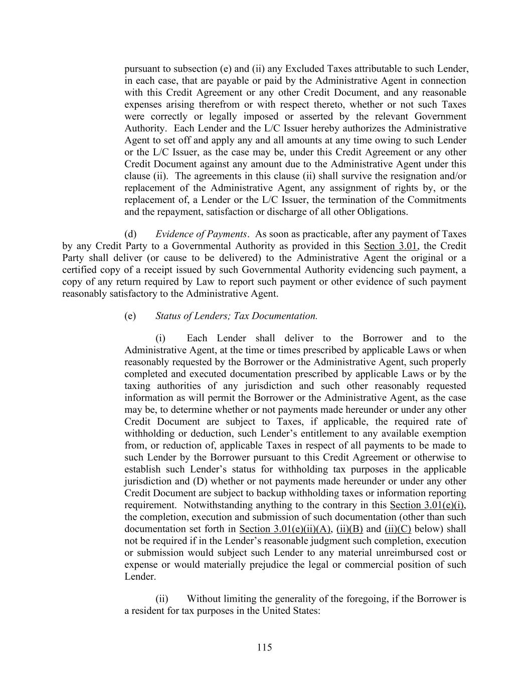 115 pursuant to subsection (e) and (ii) any Excluded Taxes attributable to such Lender, in each case, that are payable or paid by the Administrative Agent in connection with this Credit Agreement or any other Credit Document, and any reasonable expenses arising therefrom or with respect thereto, whether or not such Taxes were correctly or legally imposed or asserted by the relevant Government Authority. Each Lender and the L/C Issuer hereby authorizes the Administrative Agent to set off and apply any and all amounts at any time owing to such Lender or the L/C Issuer, as the case may be, under this Credit Agreement or any other Credit Document against any amount due to the Administrative Agent under this clause (ii). The agreements in this clause (ii) shall survive the resignation and/or replacement of the Administrative Agent, any assignment of rights by, or the replacement of, a Lender or the L/C Issuer, the termination of the Commitments and the repayment, satisfaction or discharge of all other Obligations. (d) Evidence of Payments. As soon as practicable, after any payment of Taxes by any Credit Party to a Governmental Authority as provided in this Section 3.01, the Credit Party shall deliver (or cause to be delivered) to the Administrative Agent the original or a certified copy of a receipt issued by such Governmental Authority evidencing such payment, a copy of any return required by Law to report such payment or other evidence of such payment reasonably satisfactory to the Administrative Agent. (e) Status of Lenders; Tax Documentation. (i) Each Lender shall deliver to the Borrower and to the Administrative Agent, at the time or times prescribed by applicable Laws or when reasonably requested by the Borrower or the Administrative Agent, such properly completed and executed documentation prescribed by applicable Laws or by the taxing authorities of any jurisdiction and such other reasonably requested information as will permit the Borrower or the Administrative Agent, as the case may be, to determine whether or not payments made hereunder or under any other Credit Document are subject to Taxes, if applicable, the required rate of withholding or deduction, such Lender’s entitlement to any available exemption from, or reduction of, applicable Taxes in respect of all payments to be made to such Lender by the Borrower pursuant to this Credit Agreement or otherwise to establish such Lender’s status for withholding tax purposes in the applicable jurisdiction and (D) whether or not payments made hereunder or under any other Credit Document are subject to backup withholding taxes or information reporting requirement. Notwithstanding anything to the contrary in this Section 3.01(e)(i), the completion, execution and submission of such documentation (other than such documentation set forth in Section 3.01(e)(ii)(A), (ii)(B) and (ii)(C) below) shall not be required if in the Lender’s reasonable judgment such completion, execution or submission would subject such Lender to any material unreimbursed cost or expense or would materially prejudice the legal or commercial position of such Lender. (ii) Without limiting the generality of the foregoing, if the Borrower is a resident for tax purposes in the United States: