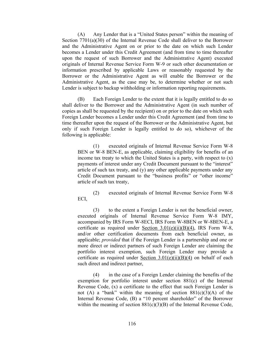 116 (A) Any Lender that is a “United States person” within the meaning of Section 7701(a)(30) of the Internal Revenue Code shall deliver to the Borrower and the Administrative Agent on or prior to the date on which such Lender becomes a Lender under this Credit Agreement (and from time to time thereafter upon the request of such Borrower and the Administrative Agent) executed originals of Internal Revenue Service Form W-9 or such other documentation or information prescribed by applicable Laws or reasonably requested by the Borrower or the Administrative Agent as will enable the Borrower or the Administrative Agent, as the case may be, to determine whether or not such Lender is subject to backup withholding or information reporting requirements. (B) Each Foreign Lender to the extent that it is legally entitled to do so shall deliver to the Borrower and the Administrative Agent (in such number of copies as shall be requested by the recipient) on or prior to the date on which such Foreign Lender becomes a Lender under this Credit Agreement (and from time to time thereafter upon the request of the Borrower or the Administrative Agent, but only if such Foreign Lender is legally entitled to do so), whichever of the following is applicable: (1) executed originals of Internal Revenue Service Form W-8 BEN or W-8 BEN-E, as applicable, claiming eligibility for benefits of an income tax treaty to which the United States is a party, with respect to (x) payments of interest under any Credit Document pursuant to the “interest” article of such tax treaty, and (y) any other applicable payments under any Credit Document pursuant to the “business profits” or “other income” article of such tax treaty, (2) executed originals of Internal Revenue Service Form W-8 ECI, (3) to the extent a Foreign Lender is not the beneficial owner, executed originals of Internal Revenue Service Form W-8 IMY, accompanied by IRS Form W-8ECI, IRS Form W-8BEN or W-8BEN-E, a certificate as required under Section 3.01(e)(ii)(B)(4), IRS Form W-8, and/or other certification documents from each beneficial owner, as applicable; provided that if the Foreign Lender is a partnership and one or more direct or indirect partners of such Foreign Lender are claiming the portfolio interest exemption, such Foreign Lender may provide a certificate as required under Section 3.01(e)(ii)(B)(4) on behalf of each such direct and indirect partner, (4) in the case of a Foreign Lender claiming the benefits of the exemption for portfolio interest under section 881(c) of the Internal Revenue Code, (x) a certificate to the effect that such Foreign Lender is not (A) a “bank” within the meaning of section 881(c)(3)(A) of the Internal Revenue Code, (B) a “10 percent shareholder” of the Borrower within the meaning of section 881(c)(3)(B) of the Internal Revenue Code,