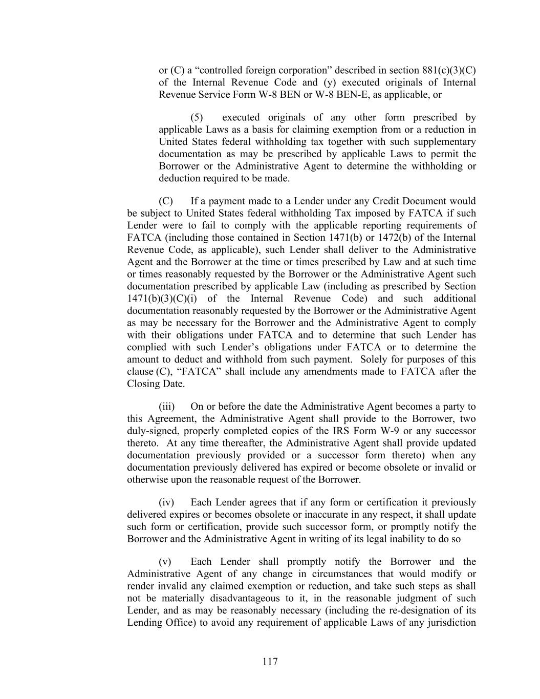 117 or (C) a “controlled foreign corporation” described in section 881(c)(3)(C) of the Internal Revenue Code and (y) executed originals of Internal Revenue Service Form W-8 BEN or W-8 BEN-E, as applicable, or (5) executed originals of any other form prescribed by applicable Laws as a basis for claiming exemption from or a reduction in United States federal withholding tax together with such supplementary documentation as may be prescribed by applicable Laws to permit the Borrower or the Administrative Agent to determine the withholding or deduction required to be made. (C) If a payment made to a Lender under any Credit Document would be subject to United States federal withholding Tax imposed by FATCA if such Lender were to fail to comply with the applicable reporting requirements of FATCA (including those contained in Section 1471(b) or 1472(b) of the Internal Revenue Code, as applicable), such Lender shall deliver to the Administrative Agent and the Borrower at the time or times prescribed by Law and at such time or times reasonably requested by the Borrower or the Administrative Agent such documentation prescribed by applicable Law (including as prescribed by Section 1471(b)(3)(C)(i) of the Internal Revenue Code) and such additional documentation reasonably requested by the Borrower or the Administrative Agent as may be necessary for the Borrower and the Administrative Agent to comply with their obligations under FATCA and to determine that such Lender has complied with such Lender’s obligations under FATCA or to determine the amount to deduct and withhold from such payment. Solely for purposes of this clause (C), “FATCA” shall include any amendments made to FATCA after the Closing Date. (iii) On or before the date the Administrative Agent becomes a party to this Agreement, the Administrative Agent shall provide to the Borrower, two duly-signed, properly completed copies of the IRS Form W-9 or any successor thereto. At any time thereafter, the Administrative Agent shall provide updated documentation previously provided or a successor form thereto) when any documentation previously delivered has expired or become obsolete or invalid or otherwise upon the reasonable request of the Borrower. (iv) Each Lender agrees that if any form or certification it previously delivered expires or becomes obsolete or inaccurate in any respect, it shall update such form or certification, provide such successor form, or promptly notify the Borrower and the Administrative Agent in writing of its legal inability to do so (v) Each Lender shall promptly notify the Borrower and the Administrative Agent of any change in circumstances that would modify or render invalid any claimed exemption or reduction, and take such steps as shall not be materially disadvantageous to it, in the reasonable judgment of such Lender, and as may be reasonably necessary (including the re-designation of its Lending Office) to avoid any requirement of applicable Laws of any jurisdiction