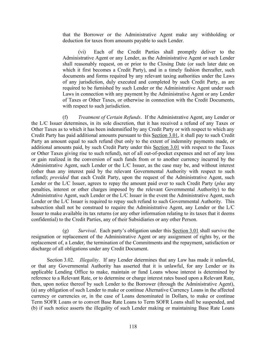 118 that the Borrower or the Administrative Agent make any withholding or deduction for taxes from amounts payable to such Lender. (vi) Each of the Credit Parties shall promptly deliver to the Administrative Agent or any Lender, as the Administrative Agent or such Lender shall reasonably request, on or prior to the Closing Date (or such later date on which it first becomes a Credit Party), and in a timely fashion thereafter, such documents and forms required by any relevant taxing authorities under the Laws of any jurisdiction, duly executed and completed by such Credit Party, as are required to be furnished by such Lender or the Administrative Agent under such Laws in connection with any payment by the Administrative Agent or any Lender of Taxes or Other Taxes, or otherwise in connection with the Credit Documents, with respect to such jurisdiction. (f) Treatment of Certain Refunds. If the Administrative Agent, any Lender or the L/C Issuer determines, in its sole discretion, that it has received a refund of any Taxes or Other Taxes as to which it has been indemnified by any Credit Party or with respect to which any Credit Party has paid additional amounts pursuant to this Section 3.01, it shall pay to such Credit Party an amount equal to such refund (but only to the extent of indemnity payments made, or additional amounts paid, by such Credit Party under this Section 3.01 with respect to the Taxes or Other Taxes giving rise to such refund), net of all out-of-pocket expenses and net of any loss or gain realized in the conversion of such funds from or to another currency incurred by the Administrative Agent, such Lender or the L/C Issuer, as the case may be, and without interest (other than any interest paid by the relevant Governmental Authority with respect to such refund); provided that each Credit Party, upon the request of the Administrative Agent, such Lender or the L/C Issuer, agrees to repay the amount paid over to such Credit Party (plus any penalties, interest or other charges imposed by the relevant Governmental Authority) to the Administrative Agent, such Lender or the L/C Issuer in the event the Administrative Agent, such Lender or the L/C Issuer is required to repay such refund to such Governmental Authority. This subsection shall not be construed to require the Administrative Agent, any Lender or the L/C Issuer to make available its tax returns (or any other information relating to its taxes that it deems confidential) to the Credit Parties, any of their Subsidiaries or any other Person. (g) Survival. Each party’s obligation under this Section 3.01 shall survive the resignation or replacement of the Administrative Agent or any assignment of rights by, or the replacement of, a Lender, the termination of the Commitments and the repayment, satisfaction or discharge of all obligations under any Credit Document. Section 3.02. Illegality. If any Lender determines that any Law has made it unlawful, or that any Governmental Authority has asserted that it is unlawful, for any Lender or its applicable Lending Office to make, maintain or fund Loans whose interest is determined by reference to a Relevant Rate, or to determine or charge interest rates based upon a Relevant Rate, then, upon notice thereof by such Lender to the Borrower (through the Administrative Agent), (a) any obligation of such Lender to make or continue Alternative Currency Loans in the affected currency or currencies or, in the case of Loans denominated in Dollars, to make or continue Term SOFR Loans or to convert Base Rate Loans to Term SOFR Loans shall be suspended, and (b) if such notice asserts the illegality of such Lender making or maintaining Base Rate Loans