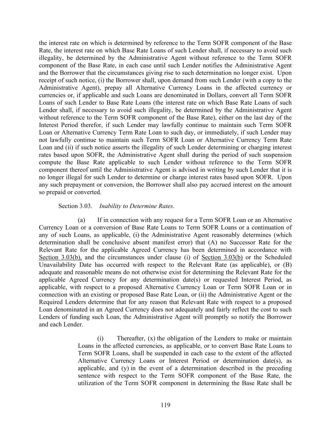 119 the interest rate on which is determined by reference to the Term SOFR component of the Base Rate, the interest rate on which Base Rate Loans of such Lender shall, if necessary to avoid such illegality, be determined by the Administrative Agent without reference to the Term SOFR component of the Base Rate, in each case until such Lender notifies the Administrative Agent and the Borrower that the circumstances giving rise to such determination no longer exist. Upon receipt of such notice, (i) the Borrower shall, upon demand from such Lender (with a copy to the Administrative Agent), prepay all Alternative Currency Loans in the affected currency or currencies or, if applicable and such Loans are denominated in Dollars, convert all Term SOFR Loans of such Lender to Base Rate Loans (the interest rate on which Base Rate Loans of such Lender shall, if necessary to avoid such illegality, be determined by the Administrative Agent without reference to the Term SOFR component of the Base Rate), either on the last day of the Interest Period therefor, if such Lender may lawfully continue to maintain such Term SOFR Loan or Alternative Currency Term Rate Loan to such day, or immediately, if such Lender may not lawfully continue to maintain such Term SOFR Loan or Alternative Currency Term Rate Loan and (ii) if such notice asserts the illegality of such Lender determining or charging interest rates based upon SOFR, the Administrative Agent shall during the period of such suspension compute the Base Rate applicable to such Lender without reference to the Term SOFR component thereof until the Administrative Agent is advised in writing by such Lender that it is no longer illegal for such Lender to determine or charge interest rates based upon SOFR. Upon any such prepayment or conversion, the Borrower shall also pay accrued interest on the amount so prepaid or converted. Section 3.03. Inability to Determine Rates. (a) If in connection with any request for a Term SOFR Loan or an Alternative Currency Loan or a conversion of Base Rate Loans to Term SOFR Loans or a continuation of any of such Loans, as applicable, (i) the Administrative Agent reasonably determines (which determination shall be conclusive absent manifest error) that (A) no Successor Rate for the Relevant Rate for the applicable Agreed Currency has been determined in accordance with Section 3.03(b), and the circumstances under clause (i) of Section 3.03(b) or the Scheduled Unavailability Date has occurred with respect to the Relevant Rate (as applicable), or (B) adequate and reasonable means do not otherwise exist for determining the Relevant Rate for the applicable Agreed Currency for any determination date(s) or requested Interest Period, as applicable, with respect to a proposed Alternative Currency Loan or Term SOFR Loan or in connection with an existing or proposed Base Rate Loan, or (ii) the Administrative Agent or the Required Lenders determine that for any reason that Relevant Rate with respect to a proposed Loan denominated in an Agreed Currency does not adequately and fairly reflect the cost to such Lenders of funding such Loan, the Administrative Agent will promptly so notify the Borrower and each Lender. (i) Thereafter, (x) the obligation of the Lenders to make or maintain Loans in the affected currencies, as applicable, or to convert Base Rate Loans to Term SOFR Loans, shall be suspended in each case to the extent of the affected Alternative Currency Loans or Interest Period or determination date(s), as applicable, and (y) in the event of a determination described in the preceding sentence with respect to the Term SOFR component of the Base Rate, the utilization of the Term SOFR component in determining the Base Rate shall be