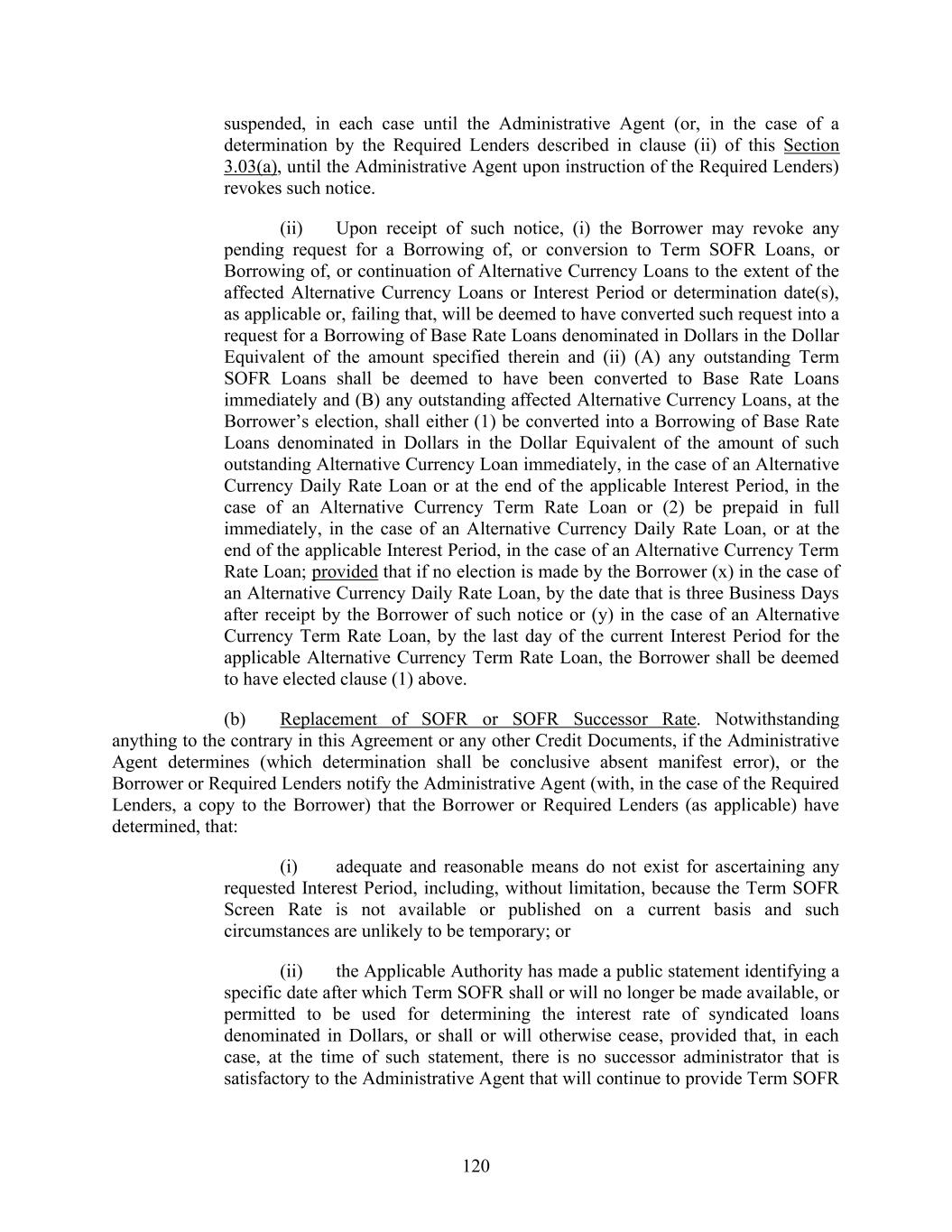 120 suspended, in each case until the Administrative Agent (or, in the case of a determination by the Required Lenders described in clause (ii) of this Section 3.03(a), until the Administrative Agent upon instruction of the Required Lenders) revokes such notice. (ii) Upon receipt of such notice, (i) the Borrower may revoke any pending request for a Borrowing of, or conversion to Term SOFR Loans, or Borrowing of, or continuation of Alternative Currency Loans to the extent of the affected Alternative Currency Loans or Interest Period or determination date(s), as applicable or, failing that, will be deemed to have converted such request into a request for a Borrowing of Base Rate Loans denominated in Dollars in the Dollar Equivalent of the amount specified therein and (ii) (A) any outstanding Term SOFR Loans shall be deemed to have been converted to Base Rate Loans immediately and (B) any outstanding affected Alternative Currency Loans, at the Borrower’s election, shall either (1) be converted into a Borrowing of Base Rate Loans denominated in Dollars in the Dollar Equivalent of the amount of such outstanding Alternative Currency Loan immediately, in the case of an Alternative Currency Daily Rate Loan or at the end of the applicable Interest Period, in the case of an Alternative Currency Term Rate Loan or (2) be prepaid in full immediately, in the case of an Alternative Currency Daily Rate Loan, or at the end of the applicable Interest Period, in the case of an Alternative Currency Term Rate Loan; provided that if no election is made by the Borrower (x) in the case of an Alternative Currency Daily Rate Loan, by the date that is three Business Days after receipt by the Borrower of such notice or (y) in the case of an Alternative Currency Term Rate Loan, by the last day of the current Interest Period for the applicable Alternative Currency Term Rate Loan, the Borrower shall be deemed to have elected clause (1) above. (b) Replacement of SOFR or SOFR Successor Rate. Notwithstanding anything to the contrary in this Agreement or any other Credit Documents, if the Administrative Agent determines (which determination shall be conclusive absent manifest error), or the Borrower or Required Lenders notify the Administrative Agent (with, in the case of the Required Lenders, a copy to the Borrower) that the Borrower or Required Lenders (as applicable) have determined, that: (i) adequate and reasonable means do not exist for ascertaining any requested Interest Period, including, without limitation, because the Term SOFR Screen Rate is not available or published on a current basis and such circumstances are unlikely to be temporary; or (ii) the Applicable Authority has made a public statement identifying a specific date after which Term SOFR shall or will no longer be made available, or permitted to be used for determining the interest rate of syndicated loans denominated in Dollars, or shall or will otherwise cease, provided that, in each case, at the time of such statement, there is no successor administrator that is satisfactory to the Administrative Agent that will continue to provide Term SOFR