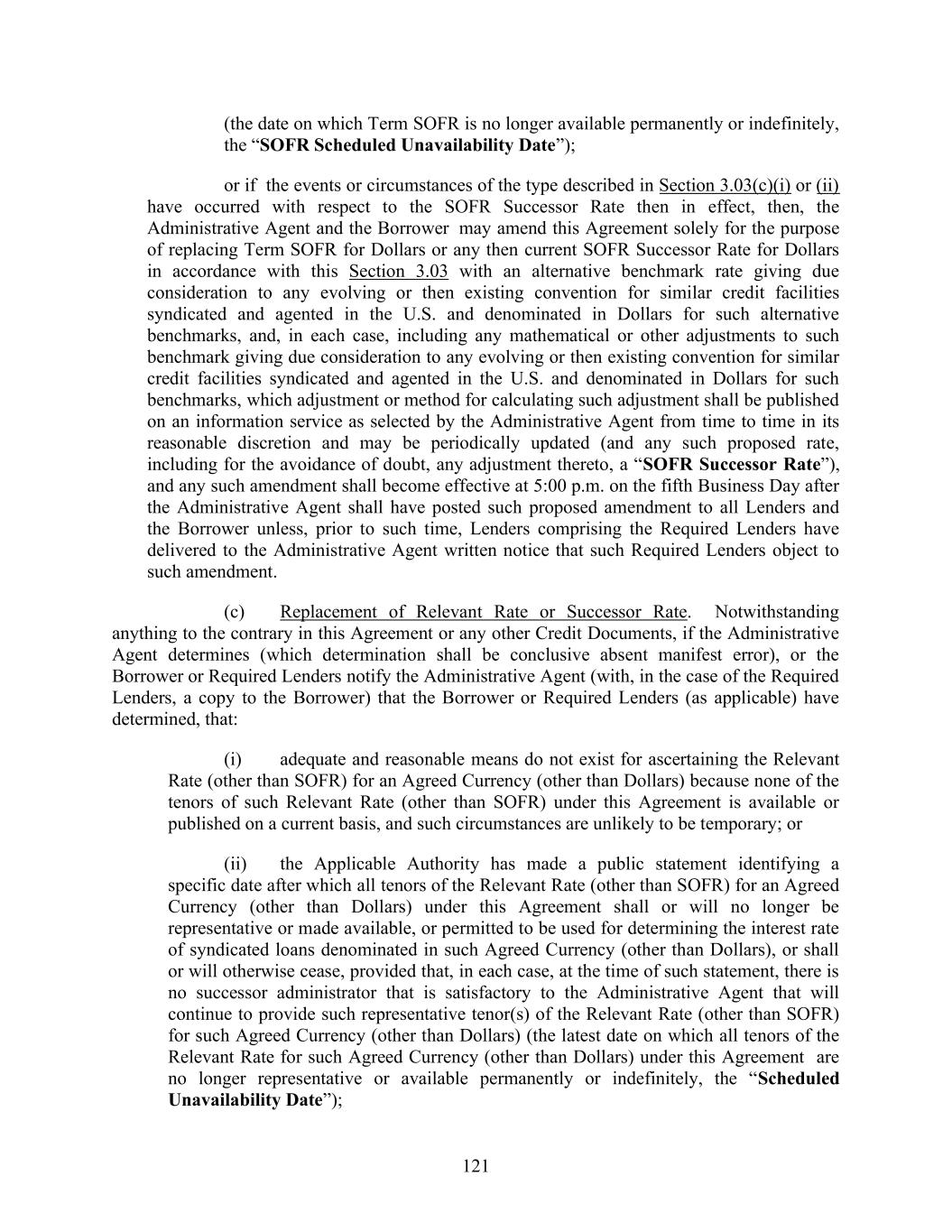 121 (the date on which Term SOFR is no longer available permanently or indefinitely, the “SOFR Scheduled Unavailability Date”); or if the events or circumstances of the type described in Section 3.03(c)(i) or (ii) have occurred with respect to the SOFR Successor Rate then in effect, then, the Administrative Agent and the Borrower may amend this Agreement solely for the purpose of replacing Term SOFR for Dollars or any then current SOFR Successor Rate for Dollars in accordance with this Section 3.03 with an alternative benchmark rate giving due consideration to any evolving or then existing convention for similar credit facilities syndicated and agented in the U.S. and denominated in Dollars for such alternative benchmarks, and, in each case, including any mathematical or other adjustments to such benchmark giving due consideration to any evolving or then existing convention for similar credit facilities syndicated and agented in the U.S. and denominated in Dollars for such benchmarks, which adjustment or method for calculating such adjustment shall be published on an information service as selected by the Administrative Agent from time to time in its reasonable discretion and may be periodically updated (and any such proposed rate, including for the avoidance of doubt, any adjustment thereto, a “SOFR Successor Rate”), and any such amendment shall become effective at 5:00 p.m. on the fifth Business Day after the Administrative Agent shall have posted such proposed amendment to all Lenders and the Borrower unless, prior to such time, Lenders comprising the Required Lenders have delivered to the Administrative Agent written notice that such Required Lenders object to such amendment. (c) Replacement of Relevant Rate or Successor Rate. Notwithstanding anything to the contrary in this Agreement or any other Credit Documents, if the Administrative Agent determines (which determination shall be conclusive absent manifest error), or the Borrower or Required Lenders notify the Administrative Agent (with, in the case of the Required Lenders, a copy to the Borrower) that the Borrower or Required Lenders (as applicable) have determined, that: (i) adequate and reasonable means do not exist for ascertaining the Relevant Rate (other than SOFR) for an Agreed Currency (other than Dollars) because none of the tenors of such Relevant Rate (other than SOFR) under this Agreement is available or published on a current basis, and such circumstances are unlikely to be temporary; or (ii) the Applicable Authority has made a public statement identifying a specific date after which all tenors of the Relevant Rate (other than SOFR) for an Agreed Currency (other than Dollars) under this Agreement shall or will no longer be representative or made available, or permitted to be used for determining the interest rate of syndicated loans denominated in such Agreed Currency (other than Dollars), or shall or will otherwise cease, provided that, in each case, at the time of such statement, there is no successor administrator that is satisfactory to the Administrative Agent that will continue to provide such representative tenor(s) of the Relevant Rate (other than SOFR) for such Agreed Currency (other than Dollars) (the latest date on which all tenors of the Relevant Rate for such Agreed Currency (other than Dollars) under this Agreement are no longer representative or available permanently or indefinitely, the “Scheduled Unavailability Date”);