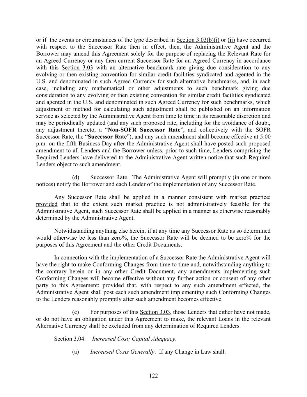 122 or if the events or circumstances of the type described in Section 3.03(b)(i) or (ii) have occurred with respect to the Successor Rate then in effect, then, the Administrative Agent and the Borrower may amend this Agreement solely for the purpose of replacing the Relevant Rate for an Agreed Currency or any then current Successor Rate for an Agreed Currency in accordance with this Section 3.03 with an alternative benchmark rate giving due consideration to any evolving or then existing convention for similar credit facilities syndicated and agented in the U.S. and denominated in such Agreed Currency for such alternative benchmarks, and, in each case, including any mathematical or other adjustments to such benchmark giving due consideration to any evolving or then existing convention for similar credit facilities syndicated and agented in the U.S. and denominated in such Agreed Currency for such benchmarks, which adjustment or method for calculating such adjustment shall be published on an information service as selected by the Administrative Agent from time to time in its reasonable discretion and may be periodically updated (and any such proposed rate, including for the avoidance of doubt, any adjustment thereto, a “Non-SOFR Successor Rate”, and collectively with the SOFR Successor Rate, the “Successor Rate”), and any such amendment shall become effective at 5:00 p.m. on the fifth Business Day after the Administrative Agent shall have posted such proposed amendment to all Lenders and the Borrower unless, prior to such time, Lenders comprising the Required Lenders have delivered to the Administrative Agent written notice that such Required Lenders object to such amendment. (d) Successor Rate. The Administrative Agent will promptly (in one or more notices) notify the Borrower and each Lender of the implementation of any Successor Rate. Any Successor Rate shall be applied in a manner consistent with market practice; provided that to the extent such market practice is not administratively feasible for the Administrative Agent, such Successor Rate shall be applied in a manner as otherwise reasonably determined by the Administrative Agent. Notwithstanding anything else herein, if at any time any Successor Rate as so determined would otherwise be less than zero%, the Successor Rate will be deemed to be zero% for the purposes of this Agreement and the other Credit Documents. In connection with the implementation of a Successor Rate the Administrative Agent will have the right to make Conforming Changes from time to time and, notwithstanding anything to the contrary herein or in any other Credit Document, any amendments implementing such Conforming Changes will become effective without any further action or consent of any other party to this Agreement; provided that, with respect to any such amendment effected, the Administrative Agent shall post each such amendment implementing such Conforming Changes to the Lenders reasonably promptly after such amendment becomes effective. (e) For purposes of this Section 3.03, those Lenders that either have not made, or do not have an obligation under this Agreement to make, the relevant Loans in the relevant Alternative Currency shall be excluded from any determination of Required Lenders. Section 3.04. Increased Cost; Capital Adequacy. (a) Increased Costs Generally. If any Change in Law shall: