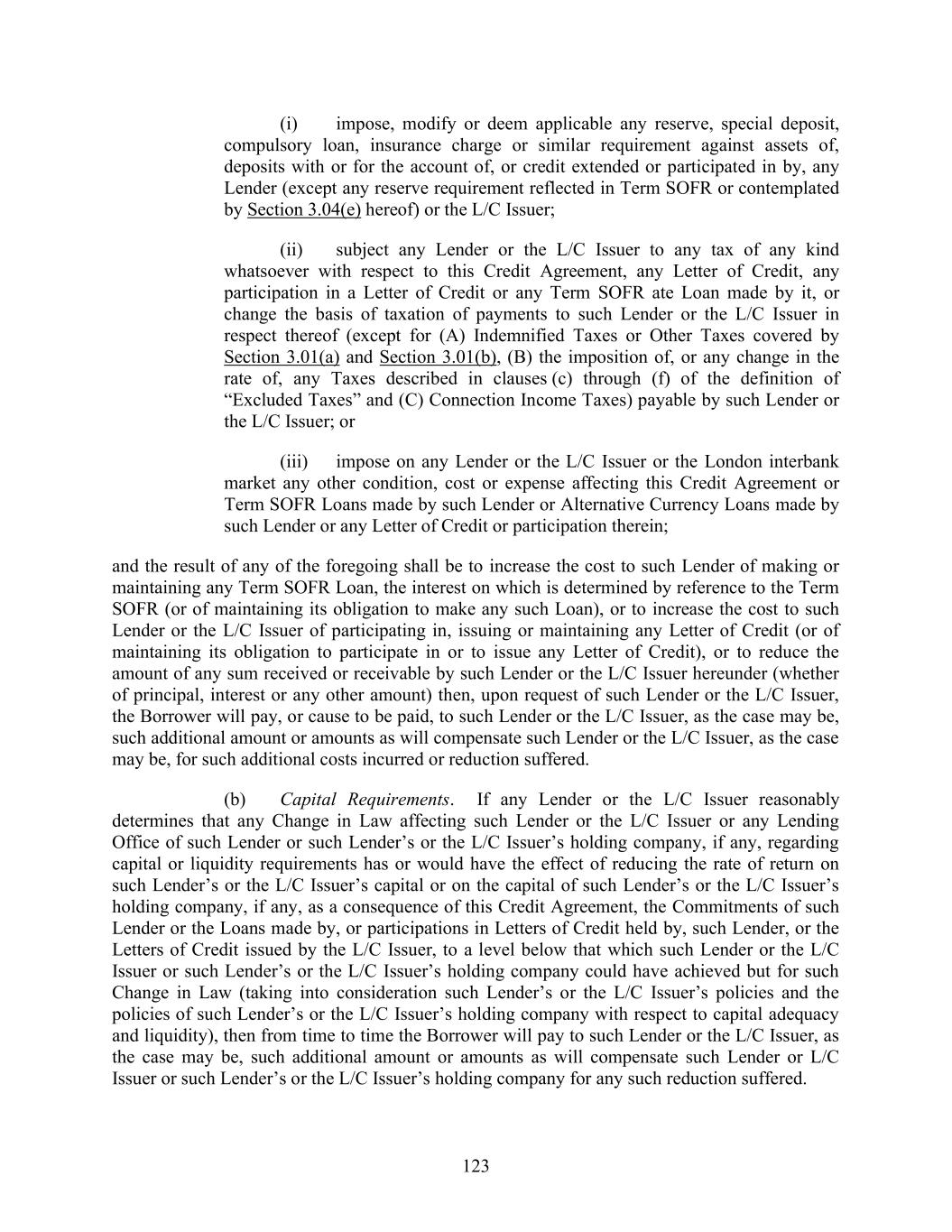 123 (i) impose, modify or deem applicable any reserve, special deposit, compulsory loan, insurance charge or similar requirement against assets of, deposits with or for the account of, or credit extended or participated in by, any Lender (except any reserve requirement reflected in Term SOFR or contemplated by Section 3.04(e) hereof) or the L/C Issuer; (ii) subject any Lender or the L/C Issuer to any tax of any kind whatsoever with respect to this Credit Agreement, any Letter of Credit, any participation in a Letter of Credit or any Term SOFR ate Loan made by it, or change the basis of taxation of payments to such Lender or the L/C Issuer in respect thereof (except for (A) Indemnified Taxes or Other Taxes covered by Section 3.01(a) and Section 3.01(b), (B) the imposition of, or any change in the rate of, any Taxes described in clauses (c) through (f) of the definition of “Excluded Taxes” and (C) Connection Income Taxes) payable by such Lender or the L/C Issuer; or (iii) impose on any Lender or the L/C Issuer or the London interbank market any other condition, cost or expense affecting this Credit Agreement or Term SOFR Loans made by such Lender or Alternative Currency Loans made by such Lender or any Letter of Credit or participation therein; and the result of any of the foregoing shall be to increase the cost to such Lender of making or maintaining any Term SOFR Loan, the interest on which is determined by reference to the Term SOFR (or of maintaining its obligation to make any such Loan), or to increase the cost to such Lender or the L/C Issuer of participating in, issuing or maintaining any Letter of Credit (or of maintaining its obligation to participate in or to issue any Letter of Credit), or to reduce the amount of any sum received or receivable by such Lender or the L/C Issuer hereunder (whether of principal, interest or any other amount) then, upon request of such Lender or the L/C Issuer, the Borrower will pay, or cause to be paid, to such Lender or the L/C Issuer, as the case may be, such additional amount or amounts as will compensate such Lender or the L/C Issuer, as the case may be, for such additional costs incurred or reduction suffered. (b) Capital Requirements. If any Lender or the L/C Issuer reasonably determines that any Change in Law affecting such Lender or the L/C Issuer or any Lending Office of such Lender or such Lender’s or the L/C Issuer’s holding company, if any, regarding capital or liquidity requirements has or would have the effect of reducing the rate of return on such Lender’s or the L/C Issuer’s capital or on the capital of such Lender’s or the L/C Issuer’s holding company, if any, as a consequence of this Credit Agreement, the Commitments of such Lender or the Loans made by, or participations in Letters of Credit held by, such Lender, or the Letters of Credit issued by the L/C Issuer, to a level below that which such Lender or the L/C Issuer or such Lender’s or the L/C Issuer’s holding company could have achieved but for such Change in Law (taking into consideration such Lender’s or the L/C Issuer’s policies and the policies of such Lender’s or the L/C Issuer’s holding company with respect to capital adequacy and liquidity), then from time to time the Borrower will pay to such Lender or the L/C Issuer, as the case may be, such additional amount or amounts as will compensate such Lender or L/C Issuer or such Lender’s or the L/C Issuer’s holding company for any such reduction suffered.