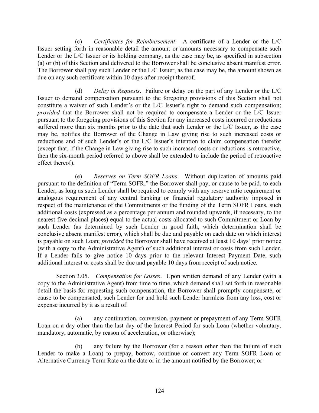 124 (c) Certificates for Reimbursement. A certificate of a Lender or the L/C Issuer setting forth in reasonable detail the amount or amounts necessary to compensate such Lender or the L/C Issuer or its holding company, as the case may be, as specified in subsection (a) or (b) of this Section and delivered to the Borrower shall be conclusive absent manifest error. The Borrower shall pay such Lender or the L/C Issuer, as the case may be, the amount shown as due on any such certificate within 10 days after receipt thereof. (d) Delay in Requests. Failure or delay on the part of any Lender or the L/C Issuer to demand compensation pursuant to the foregoing provisions of this Section shall not constitute a waiver of such Lender’s or the L/C Issuer’s right to demand such compensation; provided that the Borrower shall not be required to compensate a Lender or the L/C Issuer pursuant to the foregoing provisions of this Section for any increased costs incurred or reductions suffered more than six months prior to the date that such Lender or the L/C Issuer, as the case may be, notifies the Borrower of the Change in Law giving rise to such increased costs or reductions and of such Lender’s or the L/C Issuer’s intention to claim compensation therefor (except that, if the Change in Law giving rise to such increased costs or reductions is retroactive, then the six-month period referred to above shall be extended to include the period of retroactive effect thereof). (e) Reserves on Term SOFR Loans. Without duplication of amounts paid pursuant to the definition of “Term SOFR,” the Borrower shall pay, or cause to be paid, to each Lender, as long as such Lender shall be required to comply with any reserve ratio requirement or analogous requirement of any central banking or financial regulatory authority imposed in respect of the maintenance of the Commitments or the funding of the Term SOFR Loans, such additional costs (expressed as a percentage per annum and rounded upwards, if necessary, to the nearest five decimal places) equal to the actual costs allocated to such Commitment or Loan by such Lender (as determined by such Lender in good faith, which determination shall be conclusive absent manifest error), which shall be due and payable on each date on which interest is payable on such Loan; provided the Borrower shall have received at least 10 days’ prior notice (with a copy to the Administrative Agent) of such additional interest or costs from such Lender. If a Lender fails to give notice 10 days prior to the relevant Interest Payment Date, such additional interest or costs shall be due and payable 10 days from receipt of such notice. Section 3.05. Compensation for Losses. Upon written demand of any Lender (with a copy to the Administrative Agent) from time to time, which demand shall set forth in reasonable detail the basis for requesting such compensation, the Borrower shall promptly compensate, or cause to be compensated, such Lender for and hold such Lender harmless from any loss, cost or expense incurred by it as a result of: (a) any continuation, conversion, payment or prepayment of any Term SOFR Loan on a day other than the last day of the Interest Period for such Loan (whether voluntary, mandatory, automatic, by reason of acceleration, or otherwise); (b) any failure by the Borrower (for a reason other than the failure of such Lender to make a Loan) to prepay, borrow, continue or convert any Term SOFR Loan or Alternative Currency Term Rate on the date or in the amount notified by the Borrower; or