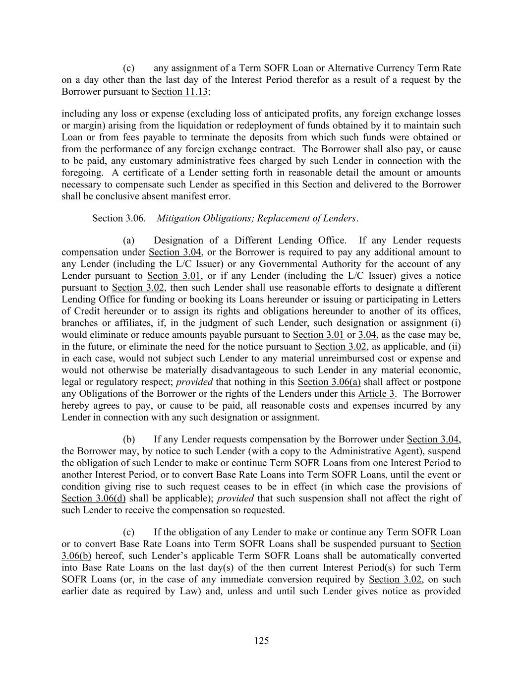 125 (c) any assignment of a Term SOFR Loan or Alternative Currency Term Rate on a day other than the last day of the Interest Period therefor as a result of a request by the Borrower pursuant to Section 11.13; including any loss or expense (excluding loss of anticipated profits, any foreign exchange losses or margin) arising from the liquidation or redeployment of funds obtained by it to maintain such Loan or from fees payable to terminate the deposits from which such funds were obtained or from the performance of any foreign exchange contract. The Borrower shall also pay, or cause to be paid, any customary administrative fees charged by such Lender in connection with the foregoing. A certificate of a Lender setting forth in reasonable detail the amount or amounts necessary to compensate such Lender as specified in this Section and delivered to the Borrower shall be conclusive absent manifest error. Section 3.06. Mitigation Obligations; Replacement of Lenders. (a) Designation of a Different Lending Office. If any Lender requests compensation under Section 3.04, or the Borrower is required to pay any additional amount to any Lender (including the L/C Issuer) or any Governmental Authority for the account of any Lender pursuant to Section 3.01, or if any Lender (including the L/C Issuer) gives a notice pursuant to Section 3.02, then such Lender shall use reasonable efforts to designate a different Lending Office for funding or booking its Loans hereunder or issuing or participating in Letters of Credit hereunder or to assign its rights and obligations hereunder to another of its offices, branches or affiliates, if, in the judgment of such Lender, such designation or assignment (i) would eliminate or reduce amounts payable pursuant to Section 3.01 or 3.04, as the case may be, in the future, or eliminate the need for the notice pursuant to Section 3.02, as applicable, and (ii) in each case, would not subject such Lender to any material unreimbursed cost or expense and would not otherwise be materially disadvantageous to such Lender in any material economic, legal or regulatory respect; provided that nothing in this Section 3.06(a) shall affect or postpone any Obligations of the Borrower or the rights of the Lenders under this Article 3. The Borrower hereby agrees to pay, or cause to be paid, all reasonable costs and expenses incurred by any Lender in connection with any such designation or assignment. (b) If any Lender requests compensation by the Borrower under Section 3.04, the Borrower may, by notice to such Lender (with a copy to the Administrative Agent), suspend the obligation of such Lender to make or continue Term SOFR Loans from one Interest Period to another Interest Period, or to convert Base Rate Loans into Term SOFR Loans, until the event or condition giving rise to such request ceases to be in effect (in which case the provisions of Section 3.06(d) shall be applicable); provided that such suspension shall not affect the right of such Lender to receive the compensation so requested. (c) If the obligation of any Lender to make or continue any Term SOFR Loan or to convert Base Rate Loans into Term SOFR Loans shall be suspended pursuant to Section 3.06(b) hereof, such Lender’s applicable Term SOFR Loans shall be automatically converted into Base Rate Loans on the last day(s) of the then current Interest Period(s) for such Term SOFR Loans (or, in the case of any immediate conversion required by Section 3.02, on such earlier date as required by Law) and, unless and until such Lender gives notice as provided