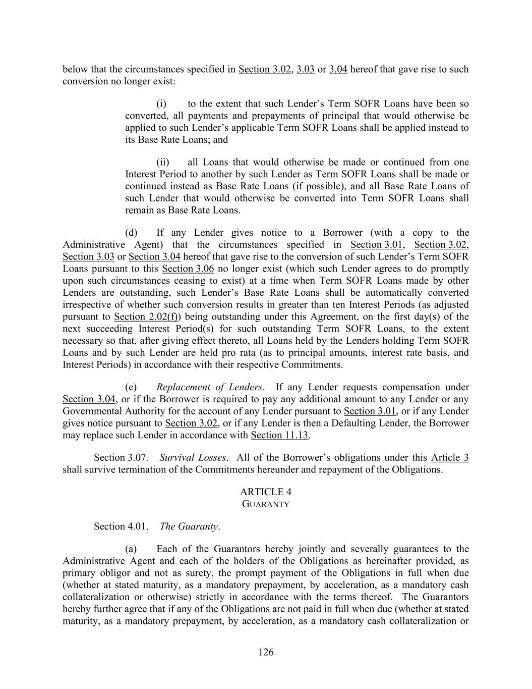 126 below that the circumstances specified in Section 3.02, 3.03 or 3.04 hereof that gave rise to such conversion no longer exist: (i) to the extent that such Lender’s Term SOFR Loans have been so converted, all payments and prepayments of principal that would otherwise be applied to such Lender’s applicable Term SOFR Loans shall be applied instead to its Base Rate Loans; and (ii) all Loans that would otherwise be made or continued from one Interest Period to another by such Lender as Term SOFR Loans shall be made or continued instead as Base Rate Loans (if possible), and all Base Rate Loans of such Lender that would otherwise be converted into Term SOFR Loans shall remain as Base Rate Loans. (d) If any Lender gives notice to a Borrower (with a copy to the Administrative Agent) that the circumstances specified in Section 3.01, Section 3.02, Section 3.03 or Section 3.04 hereof that gave rise to the conversion of such Lender’s Term SOFR Loans pursuant to this Section 3.06 no longer exist (which such Lender agrees to do promptly upon such circumstances ceasing to exist) at a time when Term SOFR Loans made by other Lenders are outstanding, such Lender’s Base Rate Loans shall be automatically converted irrespective of whether such conversion results in greater than ten Interest Periods (as adjusted pursuant to Section 2.02(f)) being outstanding under this Agreement, on the first day(s) of the next succeeding Interest Period(s) for such outstanding Term SOFR Loans, to the extent necessary so that, after giving effect thereto, all Loans held by the Lenders holding Term SOFR Loans and by such Lender are held pro rata (as to principal amounts, interest rate basis, and Interest Periods) in accordance with their respective Commitments. (e) Replacement of Lenders. If any Lender requests compensation under Section 3.04, or if the Borrower is required to pay any additional amount to any Lender or any Governmental Authority for the account of any Lender pursuant to Section 3.01, or if any Lender gives notice pursuant to Section 3.02, or if any Lender is then a Defaulting Lender, the Borrower may replace such Lender in accordance with Section 11.13. Section 3.07. Survival Losses. All of the Borrower’s obligations under this Article 3 shall survive termination of the Commitments hereunder and repayment of the Obligations. ARTICLE 4 GUARANTY Section 4.01. The Guaranty. (a) Each of the Guarantors hereby jointly and severally guarantees to the Administrative Agent and each of the holders of the Obligations as hereinafter provided, as primary obligor and not as surety, the prompt payment of the Obligations in full when due (whether at stated maturity, as a mandatory prepayment, by acceleration, as a mandatory cash collateralization or otherwise) strictly in accordance with the terms thereof. The Guarantors hereby further agree that if any of the Obligations are not paid in full when due (whether at stated maturity, as a mandatory prepayment, by acceleration, as a mandatory cash collateralization or