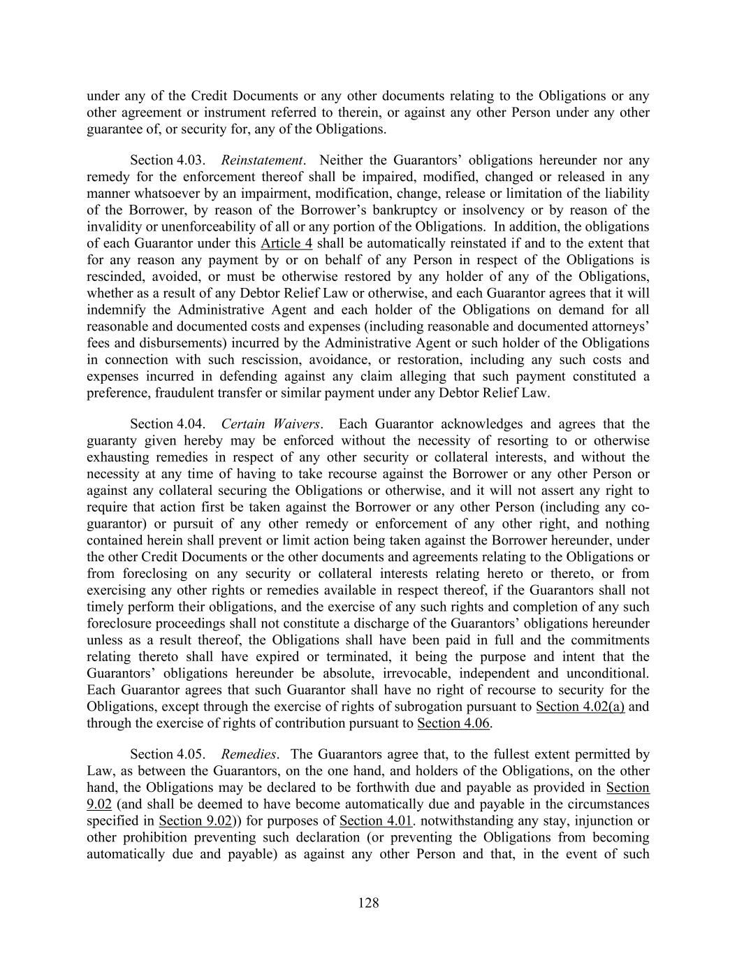 128 under any of the Credit Documents or any other documents relating to the Obligations or any other agreement or instrument referred to therein, or against any other Person under any other guarantee of, or security for, any of the Obligations. Section 4.03. Reinstatement. Neither the Guarantors’ obligations hereunder nor any remedy for the enforcement thereof shall be impaired, modified, changed or released in any manner whatsoever by an impairment, modification, change, release or limitation of the liability of the Borrower, by reason of the Borrower’s bankruptcy or insolvency or by reason of the invalidity or unenforceability of all or any portion of the Obligations. In addition, the obligations of each Guarantor under this Article 4 shall be automatically reinstated if and to the extent that for any reason any payment by or on behalf of any Person in respect of the Obligations is rescinded, avoided, or must be otherwise restored by any holder of any of the Obligations, whether as a result of any Debtor Relief Law or otherwise, and each Guarantor agrees that it will indemnify the Administrative Agent and each holder of the Obligations on demand for all reasonable and documented costs and expenses (including reasonable and documented attorneys’ fees and disbursements) incurred by the Administrative Agent or such holder of the Obligations in connection with such rescission, avoidance, or restoration, including any such costs and expenses incurred in defending against any claim alleging that such payment constituted a preference, fraudulent transfer or similar payment under any Debtor Relief Law. Section 4.04. Certain Waivers. Each Guarantor acknowledges and agrees that the guaranty given hereby may be enforced without the necessity of resorting to or otherwise exhausting remedies in respect of any other security or collateral interests, and without the necessity at any time of having to take recourse against the Borrower or any other Person or against any collateral securing the Obligations or otherwise, and it will not assert any right to require that action first be taken against the Borrower or any other Person (including any co- guarantor) or pursuit of any other remedy or enforcement of any other right, and nothing contained herein shall prevent or limit action being taken against the Borrower hereunder, under the other Credit Documents or the other documents and agreements relating to the Obligations or from foreclosing on any security or collateral interests relating hereto or thereto, or from exercising any other rights or remedies available in respect thereof, if the Guarantors shall not timely perform their obligations, and the exercise of any such rights and completion of any such foreclosure proceedings shall not constitute a discharge of the Guarantors’ obligations hereunder unless as a result thereof, the Obligations shall have been paid in full and the commitments relating thereto shall have expired or terminated, it being the purpose and intent that the Guarantors’ obligations hereunder be absolute, irrevocable, independent and unconditional. Each Guarantor agrees that such Guarantor shall have no right of recourse to security for the Obligations, except through the exercise of rights of subrogation pursuant to Section 4.02(a) and through the exercise of rights of contribution pursuant to Section 4.06. Section 4.05. Remedies. The Guarantors agree that, to the fullest extent permitted by Law, as between the Guarantors, on the one hand, and holders of the Obligations, on the other hand, the Obligations may be declared to be forthwith due and payable as provided in Section 9.02 (and shall be deemed to have become automatically due and payable in the circumstances specified in Section 9.02)) for purposes of Section 4.01. notwithstanding any stay, injunction or other prohibition preventing such declaration (or preventing the Obligations from becoming automatically due and payable) as against any other Person and that, in the event of such