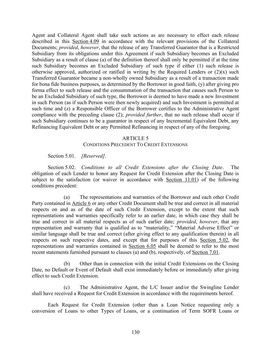 130 Agent and Collateral Agent shall take such actions as are necessary to effect each release described in this Section 4.09 in accordance with the relevant provisions of the Collateral Documents; provided, however, that the release of any Transferred Guarantor that is a Restricted Subsidiary from its obligations under this Agreement if such Subsidiary becomes an Excluded Subsidiary as a result of clause (a) of the definition thereof shall only be permitted if at the time such Subsidiary becomes an Excluded Subsidiary of such type if either (1) such release is otherwise approved, authorized or ratified in writing by the Required Lenders or (2)(x) such Transferred Guarantor became a non-wholly owned Subsidiary as a result of a transaction made for bona fide business purposes, as determined by the Borrower in good faith, (y) after giving pro forma effect to such release and the consummation of the transaction that causes such Person to be an Excluded Subsidiary of such type, the Borrower is deemed to have made a new Investment in such Person (as if such Person were then newly acquired) and such Investment is permitted at such time and (z) a Responsible Officer of the Borrower certifies to the Administrative Agent compliance with the preceding clause (2); provided further, that no such release shall occur if such Subsidiary continues to be a guarantor in respect of any Incremental Equivalent Debt, any Refinancing Equivalent Debt or any Permitted Refinancing in respect of any of the foregoing. ARTICLE 5 CONDITIONS PRECEDENT TO CREDIT EXTENSIONS Section 5.01. [Reserved]. Section 5.02. Conditions to all Credit Extensions after the Closing Date. The obligation of each Lender to honor any Request for Credit Extension after the Closing Date is subject to the satisfaction (or waiver in accordance with Section 11.01) of the following conditions precedent: (a) The representations and warranties of the Borrower and each other Credit Party contained in Article 6 or any other Credit Document shall be true and correct in all material respects on and as of the date of such Credit Extension, except to the extent that such representations and warranties specifically refer to an earlier date, in which case they shall be true and correct in all material respects as of such earlier date; provided, however, that any representation and warranty that is qualified as to “materiality,” “Material Adverse Effect” or similar language shall be true and correct (after giving effect to any qualification therein) in all respects on such respective dates, and except that for purposes of this Section 5.02, the representations and warranties contained in Section 6.05 shall be deemed to refer to the most recent statements furnished pursuant to clauses (a) and (b), respectively, of Section 7.01. (b) Other than in connection with the initial Credit Extensions on the Closing Date, no Default or Event of Default shall exist immediately before or immediately after giving effect to such Credit Extension. (c) The Administrative Agent, the L/C Issuer and/or the Swingline Lender shall have received a Request for Credit Extension in accordance with the requirements hereof. Each Request for Credit Extension (other than a Loan Notice requesting only a conversion of Loans to other Types of Loans, or a continuation of Term SOFR Loans or