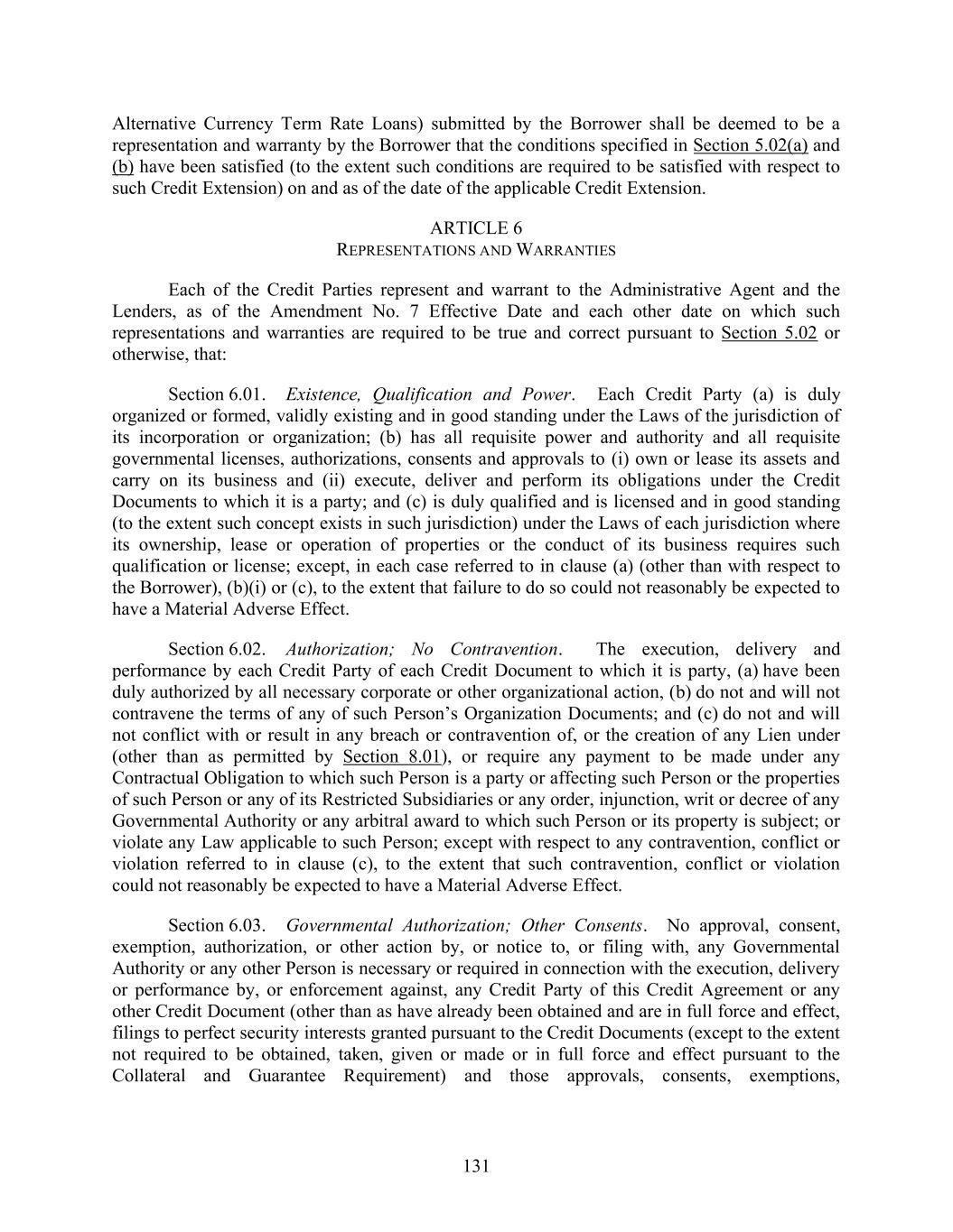 131 Alternative Currency Term Rate Loans) submitted by the Borrower shall be deemed to be a representation and warranty by the Borrower that the conditions specified in Section 5.02(a) and (b) have been satisfied (to the extent such conditions are required to be satisfied with respect to such Credit Extension) on and as of the date of the applicable Credit Extension. ARTICLE 6 REPRESENTATIONS AND WARRANTIES Each of the Credit Parties represent and warrant to the Administrative Agent and the Lenders, as of the Amendment No. 7 Effective Date and each other date on which such representations and warranties are required to be true and correct pursuant to Section 5.02 or otherwise, that: Section 6.01. Existence, Qualification and Power. Each Credit Party (a) is duly organized or formed, validly existing and in good standing under the Laws of the jurisdiction of its incorporation or organization; (b) has all requisite power and authority and all requisite governmental licenses, authorizations, consents and approvals to (i) own or lease its assets and carry on its business and (ii) execute, deliver and perform its obligations under the Credit Documents to which it is a party; and (c) is duly qualified and is licensed and in good standing (to the extent such concept exists in such jurisdiction) under the Laws of each jurisdiction where its ownership, lease or operation of properties or the conduct of its business requires such qualification or license; except, in each case referred to in clause (a) (other than with respect to the Borrower), (b)(i) or (c), to the extent that failure to do so could not reasonably be expected to have a Material Adverse Effect. Section 6.02. Authorization; No Contravention. The execution, delivery and performance by each Credit Party of each Credit Document to which it is party, (a) have been duly authorized by all necessary corporate or other organizational action, (b) do not and will not contravene the terms of any of such Person’s Organization Documents; and (c) do not and will not conflict with or result in any breach or contravention of, or the creation of any Lien under (other than as permitted by Section 8.01), or require any payment to be made under any Contractual Obligation to which such Person is a party or affecting such Person or the properties of such Person or any of its Restricted Subsidiaries or any order, injunction, writ or decree of any Governmental Authority or any arbitral award to which such Person or its property is subject; or violate any Law applicable to such Person; except with respect to any contravention, conflict or violation referred to in clause (c), to the extent that such contravention, conflict or violation could not reasonably be expected to have a Material Adverse Effect. Section 6.03. Governmental Authorization; Other Consents. No approval, consent, exemption, authorization, or other action by, or notice to, or filing with, any Governmental Authority or any other Person is necessary or required in connection with the execution, delivery or performance by, or enforcement against, any Credit Party of this Credit Agreement or any other Credit Document (other than as have already been obtained and are in full force and effect, filings to perfect security interests granted pursuant to the Credit Documents (except to the extent not required to be obtained, taken, given or made or in full force and effect pursuant to the Collateral and Guarantee Requirement) and those approvals, consents, exemptions,