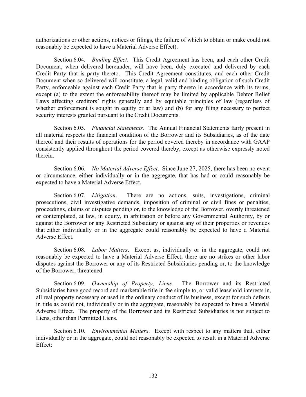 132 authorizations or other actions, notices or filings, the failure of which to obtain or make could not reasonably be expected to have a Material Adverse Effect). Section 6.04. Binding Effect. This Credit Agreement has been, and each other Credit Document, when delivered hereunder, will have been, duly executed and delivered by each Credit Party that is party thereto. This Credit Agreement constitutes, and each other Credit Document when so delivered will constitute, a legal, valid and binding obligation of such Credit Party, enforceable against each Credit Party that is party thereto in accordance with its terms, except (a) to the extent the enforceability thereof may be limited by applicable Debtor Relief Laws affecting creditors’ rights generally and by equitable principles of law (regardless of whether enforcement is sought in equity or at law) and (b) for any filing necessary to perfect security interests granted pursuant to the Credit Documents. Section 6.05. Financial Statements. The Annual Financial Statements fairly present in all material respects the financial condition of the Borrower and its Subsidiaries, as of the date thereof and their results of operations for the period covered thereby in accordance with GAAP consistently applied throughout the period covered thereby, except as otherwise expressly noted therein. Section 6.06. No Material Adverse Effect. Since June 27, 2025, there has been no event or circumstance, either individually or in the aggregate, that has had or could reasonably be expected to have a Material Adverse Effect. Section 6.07. Litigation. There are no actions, suits, investigations, criminal prosecutions, civil investigative demands, imposition of criminal or civil fines or penalties, proceedings, claims or disputes pending or, to the knowledge of the Borrower, overtly threatened or contemplated, at law, in equity, in arbitration or before any Governmental Authority, by or against the Borrower or any Restricted Subsidiary or against any of their properties or revenues that either individually or in the aggregate could reasonably be expected to have a Material Adverse Effect. Section 6.08. Labor Matters. Except as, individually or in the aggregate, could not reasonably be expected to have a Material Adverse Effect, there are no strikes or other labor disputes against the Borrower or any of its Restricted Subsidiaries pending or, to the knowledge of the Borrower, threatened. Section 6.09. Ownership of Property; Liens. The Borrower and its Restricted Subsidiaries have good record and marketable title in fee simple to, or valid leasehold interests in, all real property necessary or used in the ordinary conduct of its business, except for such defects in title as could not, individually or in the aggregate, reasonably be expected to have a Material Adverse Effect. The property of the Borrower and its Restricted Subsidiaries is not subject to Liens, other than Permitted Liens. Section 6.10. Environmental Matters. Except with respect to any matters that, either individually or in the aggregate, could not reasonably be expected to result in a Material Adverse Effect: