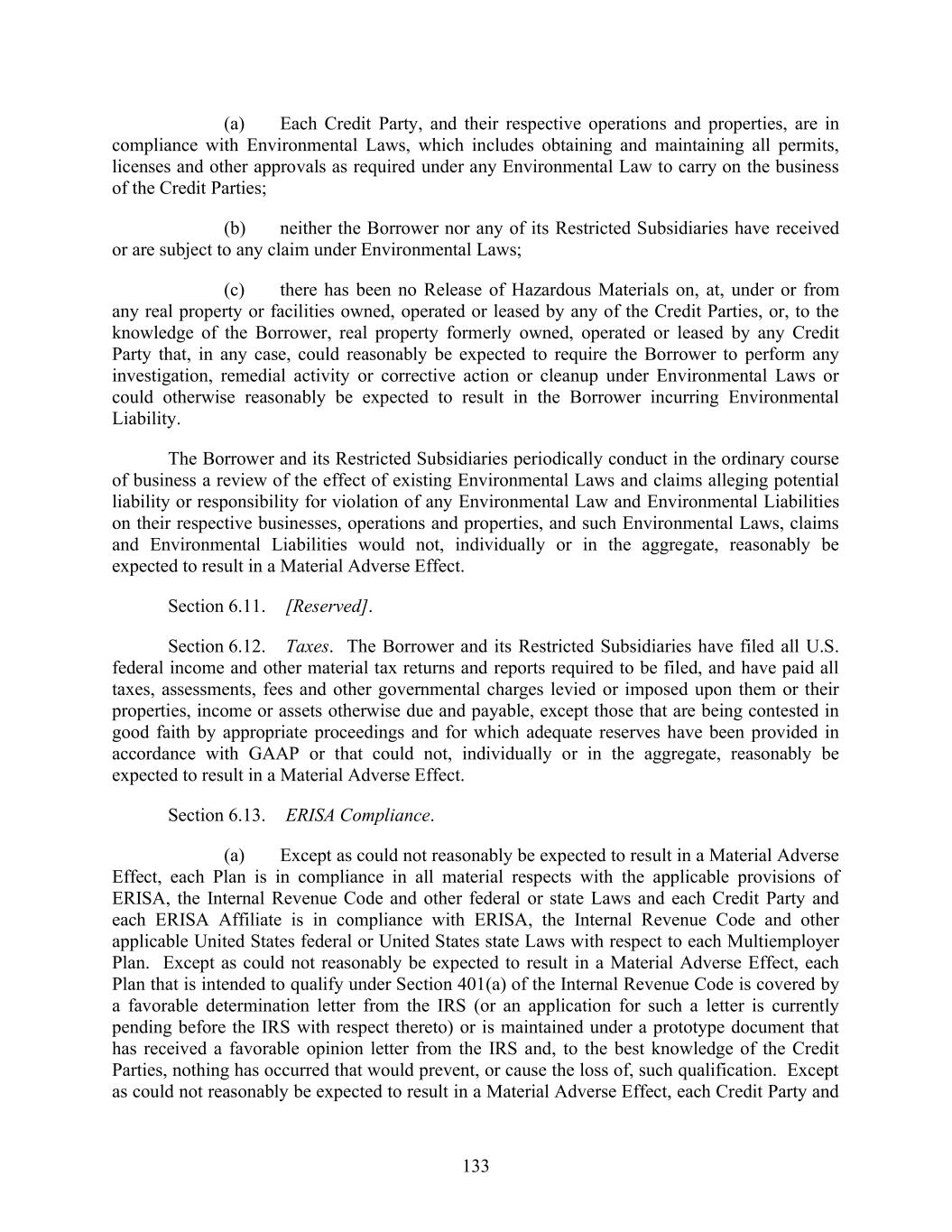 133 (a) Each Credit Party, and their respective operations and properties, are in compliance with Environmental Laws, which includes obtaining and maintaining all permits, licenses and other approvals as required under any Environmental Law to carry on the business of the Credit Parties; (b) neither the Borrower nor any of its Restricted Subsidiaries have received or are subject to any claim under Environmental Laws; (c) there has been no Release of Hazardous Materials on, at, under or from any real property or facilities owned, operated or leased by any of the Credit Parties, or, to the knowledge of the Borrower, real property formerly owned, operated or leased by any Credit Party that, in any case, could reasonably be expected to require the Borrower to perform any investigation, remedial activity or corrective action or cleanup under Environmental Laws or could otherwise reasonably be expected to result in the Borrower incurring Environmental Liability. The Borrower and its Restricted Subsidiaries periodically conduct in the ordinary course of business a review of the effect of existing Environmental Laws and claims alleging potential liability or responsibility for violation of any Environmental Law and Environmental Liabilities on their respective businesses, operations and properties, and such Environmental Laws, claims and Environmental Liabilities would not, individually or in the aggregate, reasonably be expected to result in a Material Adverse Effect. Section 6.11. [Reserved]. Section 6.12. Taxes. The Borrower and its Restricted Subsidiaries have filed all U.S. federal income and other material tax returns and reports required to be filed, and have paid all taxes, assessments, fees and other governmental charges levied or imposed upon them or their properties, income or assets otherwise due and payable, except those that are being contested in good faith by appropriate proceedings and for which adequate reserves have been provided in accordance with GAAP or that could not, individually or in the aggregate, reasonably be expected to result in a Material Adverse Effect. Section 6.13. ERISA Compliance. (a) Except as could not reasonably be expected to result in a Material Adverse Effect, each Plan is in compliance in all material respects with the applicable provisions of ERISA, the Internal Revenue Code and other federal or state Laws and each Credit Party and each ERISA Affiliate is in compliance with ERISA, the Internal Revenue Code and other applicable United States federal or United States state Laws with respect to each Multiemployer Plan. Except as could not reasonably be expected to result in a Material Adverse Effect, each Plan that is intended to qualify under Section 401(a) of the Internal Revenue Code is covered by a favorable determination letter from the IRS (or an application for such a letter is currently pending before the IRS with respect thereto) or is maintained under a prototype document that has received a favorable opinion letter from the IRS and, to the best knowledge of the Credit Parties, nothing has occurred that would prevent, or cause the loss of, such qualification. Except as could not reasonably be expected to result in a Material Adverse Effect, each Credit Party and