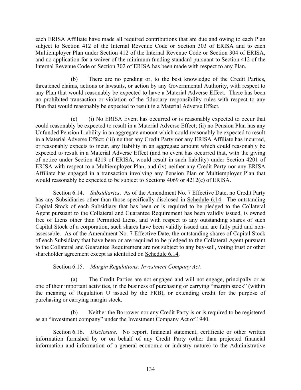 134 each ERISA Affiliate have made all required contributions that are due and owing to each Plan subject to Section 412 of the Internal Revenue Code or Section 303 of ERISA and to each Multiemployer Plan under Section 412 of the Internal Revenue Code or Section 304 of ERISA, and no application for a waiver of the minimum funding standard pursuant to Section 412 of the Internal Revenue Code or Section 302 of ERISA has been made with respect to any Plan. (b) There are no pending or, to the best knowledge of the Credit Parties, threatened claims, actions or lawsuits, or action by any Governmental Authority, with respect to any Plan that would reasonably be expected to have a Material Adverse Effect. There has been no prohibited transaction or violation of the fiduciary responsibility rules with respect to any Plan that would reasonably be expected to result in a Material Adverse Effect. (c) (i) No ERISA Event has occurred or is reasonably expected to occur that could reasonably be expected to result in a Material Adverse Effect; (ii) no Pension Plan has any Unfunded Pension Liability in an aggregate amount which could reasonably be expected to result in a Material Adverse Effect; (iii) neither any Credit Party nor any ERISA Affiliate has incurred, or reasonably expects to incur, any liability in an aggregate amount which could reasonably be expected to result in a Material Adverse Effect (and no event has occurred that, with the giving of notice under Section 4219 of ERISA, would result in such liability) under Section 4201 of ERISA with respect to a Multiemployer Plan; and (iv) neither any Credit Party nor any ERISA Affiliate has engaged in a transaction involving any Pension Plan or Multiemployer Plan that would reasonably be expected to be subject to Sections 4069 or 4212(c) of ERISA. Section 6.14. Subsidiaries. As of the Amendment No. 7 Effective Date, no Credit Party has any Subsidiaries other than those specifically disclosed in Schedule 6.14. The outstanding Capital Stock of each Subsidiary that has been or is required to be pledged to the Collateral Agent pursuant to the Collateral and Guarantee Requirement has been validly issued, is owned free of Liens other than Permitted Liens, and with respect to any outstanding shares of such Capital Stock of a corporation, such shares have been validly issued and are fully paid and non- assessable. As of the Amendment No. 7 Effective Date, the outstanding shares of Capital Stock of each Subsidiary that have been or are required to be pledged to the Collateral Agent pursuant to the Collateral and Guarantee Requirement are not subject to any buy-sell, voting trust or other shareholder agreement except as identified on Schedule 6.14. Section 6.15. Margin Regulations; Investment Company Act. (a) The Credit Parties are not engaged and will not engage, principally or as one of their important activities, in the business of purchasing or carrying “margin stock” (within the meaning of Regulation U issued by the FRB), or extending credit for the purpose of purchasing or carrying margin stock. (b) Neither the Borrower nor any Credit Party is or is required to be registered as an “investment company” under the Investment Company Act of 1940. Section 6.16. Disclosure. No report, financial statement, certificate or other written information furnished by or on behalf of any Credit Party (other than projected financial information and information of a general economic or industry nature) to the Administrative