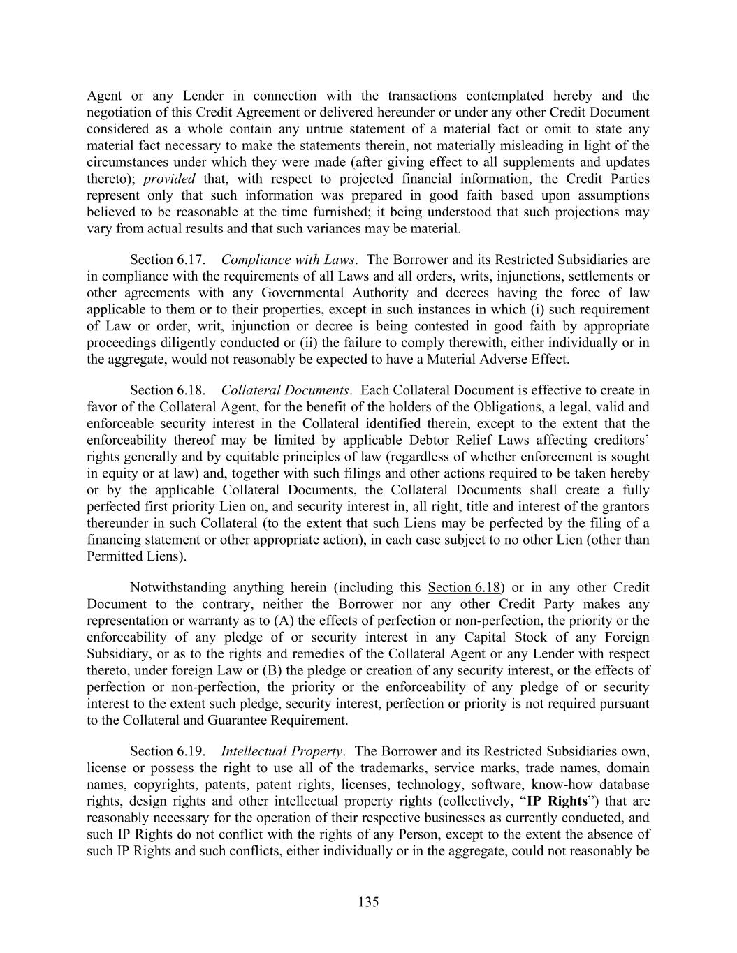 135 Agent or any Lender in connection with the transactions contemplated hereby and the negotiation of this Credit Agreement or delivered hereunder or under any other Credit Document considered as a whole contain any untrue statement of a material fact or omit to state any material fact necessary to make the statements therein, not materially misleading in light of the circumstances under which they were made (after giving effect to all supplements and updates thereto); provided that, with respect to projected financial information, the Credit Parties represent only that such information was prepared in good faith based upon assumptions believed to be reasonable at the time furnished; it being understood that such projections may vary from actual results and that such variances may be material. Section 6.17. Compliance with Laws. The Borrower and its Restricted Subsidiaries are in compliance with the requirements of all Laws and all orders, writs, injunctions, settlements or other agreements with any Governmental Authority and decrees having the force of law applicable to them or to their properties, except in such instances in which (i) such requirement of Law or order, writ, injunction or decree is being contested in good faith by appropriate proceedings diligently conducted or (ii) the failure to comply therewith, either individually or in the aggregate, would not reasonably be expected to have a Material Adverse Effect. Section 6.18. Collateral Documents. Each Collateral Document is effective to create in favor of the Collateral Agent, for the benefit of the holders of the Obligations, a legal, valid and enforceable security interest in the Collateral identified therein, except to the extent that the enforceability thereof may be limited by applicable Debtor Relief Laws affecting creditors’ rights generally and by equitable principles of law (regardless of whether enforcement is sought in equity or at law) and, together with such filings and other actions required to be taken hereby or by the applicable Collateral Documents, the Collateral Documents shall create a fully perfected first priority Lien on, and security interest in, all right, title and interest of the grantors thereunder in such Collateral (to the extent that such Liens may be perfected by the filing of a financing statement or other appropriate action), in each case subject to no other Lien (other than Permitted Liens). Notwithstanding anything herein (including this Section 6.18) or in any other Credit Document to the contrary, neither the Borrower nor any other Credit Party makes any representation or warranty as to (A) the effects of perfection or non-perfection, the priority or the enforceability of any pledge of or security interest in any Capital Stock of any Foreign Subsidiary, or as to the rights and remedies of the Collateral Agent or any Lender with respect thereto, under foreign Law or (B) the pledge or creation of any security interest, or the effects of perfection or non-perfection, the priority or the enforceability of any pledge of or security interest to the extent such pledge, security interest, perfection or priority is not required pursuant to the Collateral and Guarantee Requirement. Section 6.19. Intellectual Property. The Borrower and its Restricted Subsidiaries own, license or possess the right to use all of the trademarks, service marks, trade names, domain names, copyrights, patents, patent rights, licenses, technology, software, know-how database rights, design rights and other intellectual property rights (collectively, “IP Rights”) that are reasonably necessary for the operation of their respective businesses as currently conducted, and such IP Rights do not conflict with the rights of any Person, except to the extent the absence of such IP Rights and such conflicts, either individually or in the aggregate, could not reasonably be