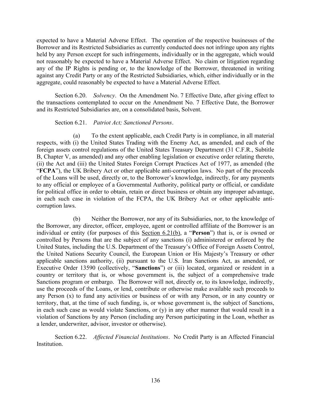 136 expected to have a Material Adverse Effect. The operation of the respective businesses of the Borrower and its Restricted Subsidiaries as currently conducted does not infringe upon any rights held by any Person except for such infringements, individually or in the aggregate, which would not reasonably be expected to have a Material Adverse Effect. No claim or litigation regarding any of the IP Rights is pending or, to the knowledge of the Borrower, threatened in writing against any Credit Party or any of the Restricted Subsidiaries, which, either individually or in the aggregate, could reasonably be expected to have a Material Adverse Effect. Section 6.20. Solvency. On the Amendment No. 7 Effective Date, after giving effect to the transactions contemplated to occur on the Amendment No. 7 Effective Date, the Borrower and its Restricted Subsidiaries are, on a consolidated basis, Solvent. Section 6.21. Patriot Act; Sanctioned Persons. (a) To the extent applicable, each Credit Party is in compliance, in all material respects, with (i) the United States Trading with the Enemy Act, as amended, and each of the foreign assets control regulations of the United States Treasury Department (31 C.F.R., Subtitle B, Chapter V, as amended) and any other enabling legislation or executive order relating thereto, (ii) the Act and (iii) the United States Foreign Corrupt Practices Act of 1977, as amended (the “FCPA”), the UK Bribery Act or other applicable anti-corruption laws. No part of the proceeds of the Loans will be used, directly or, to the Borrower’s knowledge, indirectly, for any payments to any official or employee of a Governmental Authority, political party or official, or candidate for political office in order to obtain, retain or direct business or obtain any improper advantage, in each such case in violation of the FCPA, the UK Bribery Act or other applicable anti- corruption laws. (b) Neither the Borrower, nor any of its Subsidiaries, nor, to the knowledge of the Borrower, any director, officer, employee, agent or controlled affiliate of the Borrower is an individual or entity (for purposes of this Section 6.21(b), a “Person”) that is, or is owned or controlled by Persons that are the subject of any sanctions (i) administered or enforced by the United States, including the U.S. Department of the Treasury’s Office of Foreign Assets Control, the United Nations Security Council, the European Union or His Majesty’s Treasury or other applicable sanctions authority, (ii) pursuant to the U.S. Iran Sanctions Act, as amended, or Executive Order 13590 (collectively, “Sanctions”) or (iii) located, organized or resident in a country or territory that is, or whose government is, the subject of a comprehensive trade Sanctions program or embargo. The Borrower will not, directly or, to its knowledge, indirectly, use the proceeds of the Loans, or lend, contribute or otherwise make available such proceeds to any Person (x) to fund any activities or business of or with any Person, or in any country or territory, that, at the time of such funding, is, or whose government is, the subject of Sanctions, in each such case as would violate Sanctions, or (y) in any other manner that would result in a violation of Sanctions by any Person (including any Person participating in the Loan, whether as a lender, underwriter, advisor, investor or otherwise). Section 6.22. Affected Financial Institutions. No Credit Party is an Affected Financial Institution.