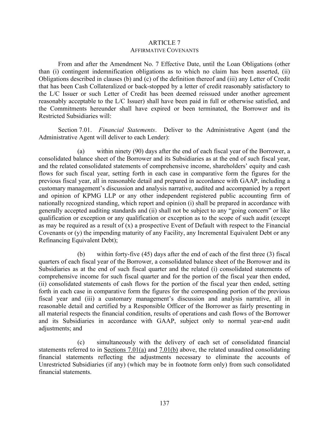137 ARTICLE 7 AFFIRMATIVE COVENANTS From and after the Amendment No. 7 Effective Date, until the Loan Obligations (other than (i) contingent indemnification obligations as to which no claim has been asserted, (ii) Obligations described in clauses (b) and (c) of the definition thereof and (iii) any Letter of Credit that has been Cash Collateralized or back-stopped by a letter of credit reasonably satisfactory to the L/C Issuer or such Letter of Credit has been deemed reissued under another agreement reasonably acceptable to the L/C Issuer) shall have been paid in full or otherwise satisfied, and the Commitments hereunder shall have expired or been terminated, the Borrower and its Restricted Subsidiaries will: Section 7.01. Financial Statements. Deliver to the Administrative Agent (and the Administrative Agent will deliver to each Lender): (a) within ninety (90) days after the end of each fiscal year of the Borrower, a consolidated balance sheet of the Borrower and its Subsidiaries as at the end of such fiscal year, and the related consolidated statements of comprehensive income, shareholders’ equity and cash flows for such fiscal year, setting forth in each case in comparative form the figures for the previous fiscal year, all in reasonable detail and prepared in accordance with GAAP, including a customary management’s discussion and analysis narrative, audited and accompanied by a report and opinion of KPMG LLP or any other independent registered public accounting firm of nationally recognized standing, which report and opinion (i) shall be prepared in accordance with generally accepted auditing standards and (ii) shall not be subject to any “going concern” or like qualification or exception or any qualification or exception as to the scope of such audit (except as may be required as a result of (x) a prospective Event of Default with respect to the Financial Covenants or (y) the impending maturity of any Facility, any Incremental Equivalent Debt or any Refinancing Equivalent Debt); (b) within forty-five (45) days after the end of each of the first three (3) fiscal quarters of each fiscal year of the Borrower, a consolidated balance sheet of the Borrower and its Subsidiaries as at the end of such fiscal quarter and the related (i) consolidated statements of comprehensive income for such fiscal quarter and for the portion of the fiscal year then ended, (ii) consolidated statements of cash flows for the portion of the fiscal year then ended, setting forth in each case in comparative form the figures for the corresponding portion of the previous fiscal year and (iii) a customary management’s discussion and analysis narrative, all in reasonable detail and certified by a Responsible Officer of the Borrower as fairly presenting in all material respects the financial condition, results of operations and cash flows of the Borrower and its Subsidiaries in accordance with GAAP, subject only to normal year-end audit adjustments; and (c) simultaneously with the delivery of each set of consolidated financial statements referred to in Sections 7.01(a) and 7.01(b) above, the related unaudited consolidating financial statements reflecting the adjustments necessary to eliminate the accounts of Unrestricted Subsidiaries (if any) (which may be in footnote form only) from such consolidated financial statements.