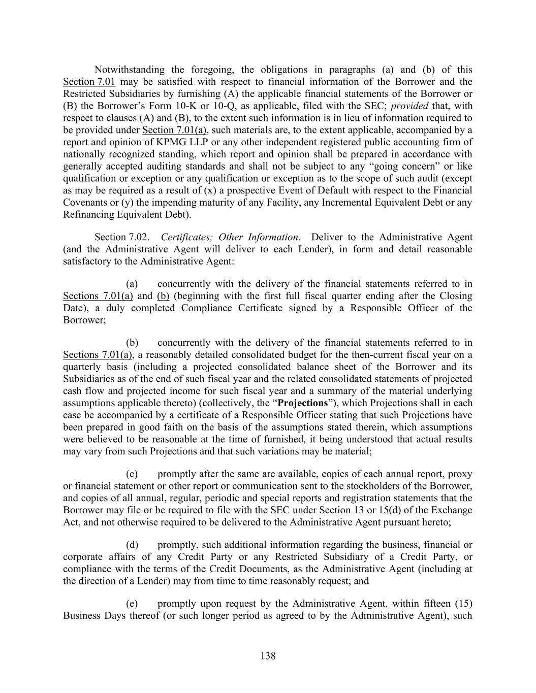 138 Notwithstanding the foregoing, the obligations in paragraphs (a) and (b) of this Section 7.01 may be satisfied with respect to financial information of the Borrower and the Restricted Subsidiaries by furnishing (A) the applicable financial statements of the Borrower or (B) the Borrower’s Form 10-K or 10-Q, as applicable, filed with the SEC; provided that, with respect to clauses (A) and (B), to the extent such information is in lieu of information required to be provided under Section 7.01(a), such materials are, to the extent applicable, accompanied by a report and opinion of KPMG LLP or any other independent registered public accounting firm of nationally recognized standing, which report and opinion shall be prepared in accordance with generally accepted auditing standards and shall not be subject to any “going concern” or like qualification or exception or any qualification or exception as to the scope of such audit (except as may be required as a result of (x) a prospective Event of Default with respect to the Financial Covenants or (y) the impending maturity of any Facility, any Incremental Equivalent Debt or any Refinancing Equivalent Debt). Section 7.02. Certificates; Other Information. Deliver to the Administrative Agent (and the Administrative Agent will deliver to each Lender), in form and detail reasonable satisfactory to the Administrative Agent: (a) concurrently with the delivery of the financial statements referred to in Sections 7.01(a) and (b) (beginning with the first full fiscal quarter ending after the Closing Date), a duly completed Compliance Certificate signed by a Responsible Officer of the Borrower; (b) concurrently with the delivery of the financial statements referred to in Sections 7.01(a), a reasonably detailed consolidated budget for the then-current fiscal year on a quarterly basis (including a projected consolidated balance sheet of the Borrower and its Subsidiaries as of the end of such fiscal year and the related consolidated statements of projected cash flow and projected income for such fiscal year and a summary of the material underlying assumptions applicable thereto) (collectively, the “Projections”), which Projections shall in each case be accompanied by a certificate of a Responsible Officer stating that such Projections have been prepared in good faith on the basis of the assumptions stated therein, which assumptions were believed to be reasonable at the time of furnished, it being understood that actual results may vary from such Projections and that such variations may be material; (c) promptly after the same are available, copies of each annual report, proxy or financial statement or other report or communication sent to the stockholders of the Borrower, and copies of all annual, regular, periodic and special reports and registration statements that the Borrower may file or be required to file with the SEC under Section 13 or 15(d) of the Exchange Act, and not otherwise required to be delivered to the Administrative Agent pursuant hereto; (d) promptly, such additional information regarding the business, financial or corporate affairs of any Credit Party or any Restricted Subsidiary of a Credit Party, or compliance with the terms of the Credit Documents, as the Administrative Agent (including at the direction of a Lender) may from time to time reasonably request; and (e) promptly upon request by the Administrative Agent, within fifteen (15) Business Days thereof (or such longer period as agreed to by the Administrative Agent), such
