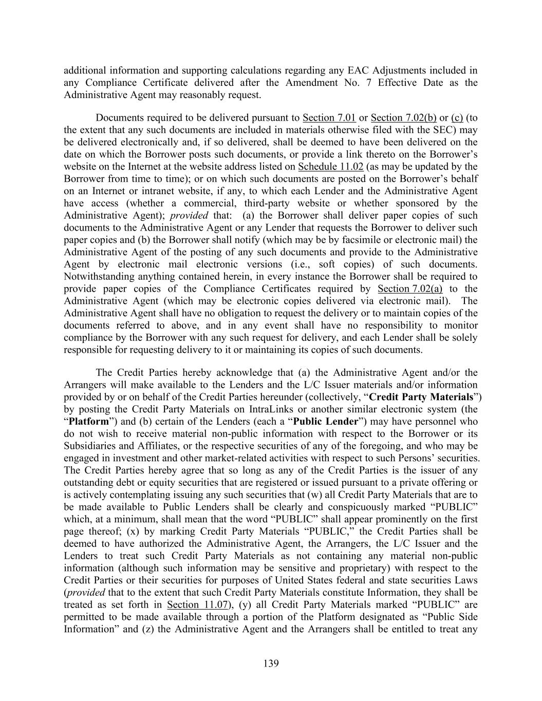 139 additional information and supporting calculations regarding any EAC Adjustments included in any Compliance Certificate delivered after the Amendment No. 7 Effective Date as the Administrative Agent may reasonably request. Documents required to be delivered pursuant to Section 7.01 or Section 7.02(b) or (c) (to the extent that any such documents are included in materials otherwise filed with the SEC) may be delivered electronically and, if so delivered, shall be deemed to have been delivered on the date on which the Borrower posts such documents, or provide a link thereto on the Borrower’s website on the Internet at the website address listed on Schedule 11.02 (as may be updated by the Borrower from time to time); or on which such documents are posted on the Borrower’s behalf on an Internet or intranet website, if any, to which each Lender and the Administrative Agent have access (whether a commercial, third-party website or whether sponsored by the Administrative Agent); provided that: (a) the Borrower shall deliver paper copies of such documents to the Administrative Agent or any Lender that requests the Borrower to deliver such paper copies and (b) the Borrower shall notify (which may be by facsimile or electronic mail) the Administrative Agent of the posting of any such documents and provide to the Administrative Agent by electronic mail electronic versions (i.e., soft copies) of such documents. Notwithstanding anything contained herein, in every instance the Borrower shall be required to provide paper copies of the Compliance Certificates required by Section 7.02(a) to the Administrative Agent (which may be electronic copies delivered via electronic mail). The Administrative Agent shall have no obligation to request the delivery or to maintain copies of the documents referred to above, and in any event shall have no responsibility to monitor compliance by the Borrower with any such request for delivery, and each Lender shall be solely responsible for requesting delivery to it or maintaining its copies of such documents. The Credit Parties hereby acknowledge that (a) the Administrative Agent and/or the Arrangers will make available to the Lenders and the L/C Issuer materials and/or information provided by or on behalf of the Credit Parties hereunder (collectively, “Credit Party Materials”) by posting the Credit Party Materials on IntraLinks or another similar electronic system (the “Platform”) and (b) certain of the Lenders (each a “Public Lender”) may have personnel who do not wish to receive material non-public information with respect to the Borrower or its Subsidiaries and Affiliates, or the respective securities of any of the foregoing, and who may be engaged in investment and other market-related activities with respect to such Persons’ securities. The Credit Parties hereby agree that so long as any of the Credit Parties is the issuer of any outstanding debt or equity securities that are registered or issued pursuant to a private offering or is actively contemplating issuing any such securities that (w) all Credit Party Materials that are to be made available to Public Lenders shall be clearly and conspicuously marked “PUBLIC” which, at a minimum, shall mean that the word “PUBLIC” shall appear prominently on the first page thereof; (x) by marking Credit Party Materials “PUBLIC,” the Credit Parties shall be deemed to have authorized the Administrative Agent, the Arrangers, the L/C Issuer and the Lenders to treat such Credit Party Materials as not containing any material non-public information (although such information may be sensitive and proprietary) with respect to the Credit Parties or their securities for purposes of United States federal and state securities Laws (provided that to the extent that such Credit Party Materials constitute Information, they shall be treated as set forth in Section 11.07), (y) all Credit Party Materials marked “PUBLIC” are permitted to be made available through a portion of the Platform designated as “Public Side Information” and (z) the Administrative Agent and the Arrangers shall be entitled to treat any