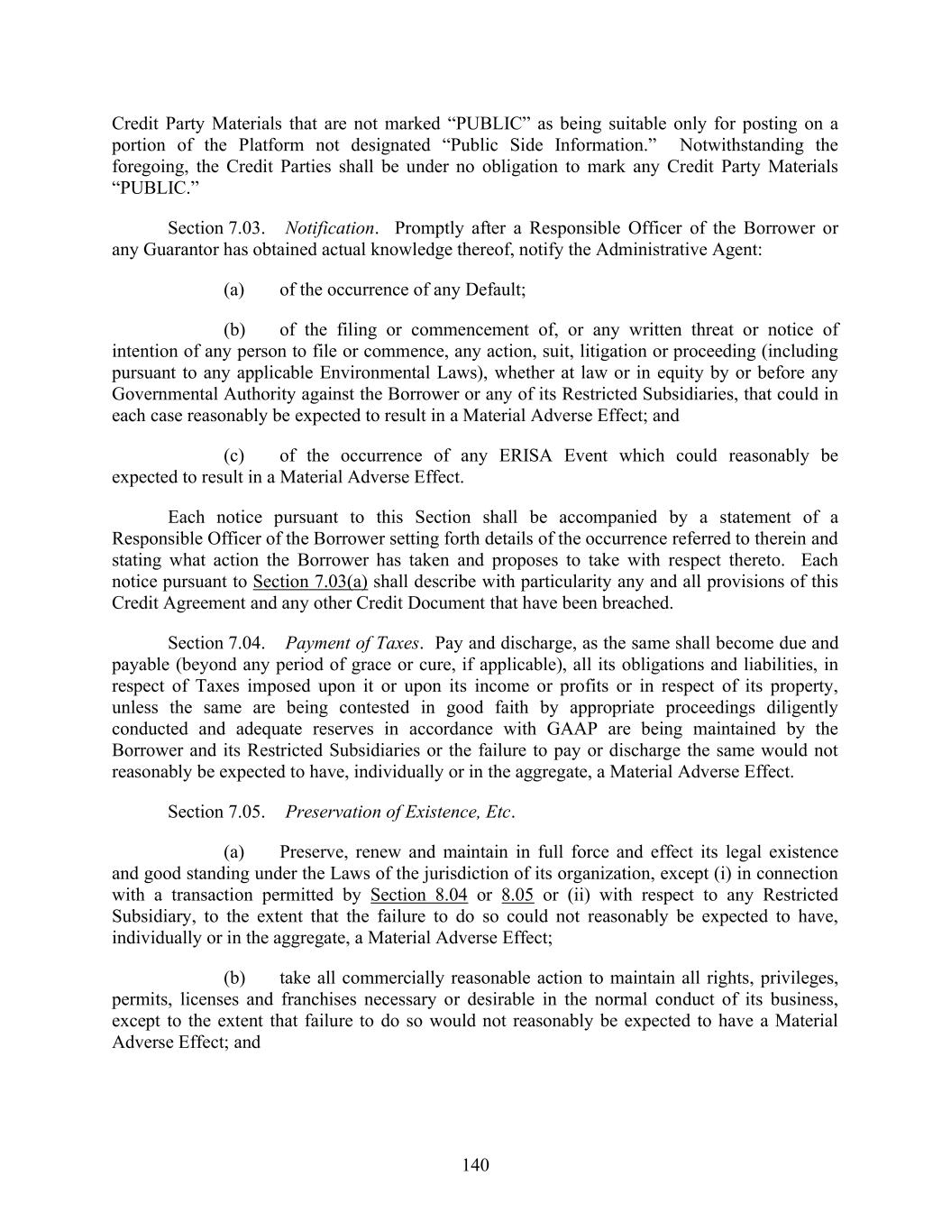 140 Credit Party Materials that are not marked “PUBLIC” as being suitable only for posting on a portion of the Platform not designated “Public Side Information.” Notwithstanding the foregoing, the Credit Parties shall be under no obligation to mark any Credit Party Materials “PUBLIC.” Section 7.03. Notification. Promptly after a Responsible Officer of the Borrower or any Guarantor has obtained actual knowledge thereof, notify the Administrative Agent: (a) of the occurrence of any Default; (b) of the filing or commencement of, or any written threat or notice of intention of any person to file or commence, any action, suit, litigation or proceeding (including pursuant to any applicable Environmental Laws), whether at law or in equity by or before any Governmental Authority against the Borrower or any of its Restricted Subsidiaries, that could in each case reasonably be expected to result in a Material Adverse Effect; and (c) of the occurrence of any ERISA Event which could reasonably be expected to result in a Material Adverse Effect. Each notice pursuant to this Section shall be accompanied by a statement of a Responsible Officer of the Borrower setting forth details of the occurrence referred to therein and stating what action the Borrower has taken and proposes to take with respect thereto. Each notice pursuant to Section 7.03(a) shall describe with particularity any and all provisions of this Credit Agreement and any other Credit Document that have been breached. Section 7.04. Payment of Taxes. Pay and discharge, as the same shall become due and payable (beyond any period of grace or cure, if applicable), all its obligations and liabilities, in respect of Taxes imposed upon it or upon its income or profits or in respect of its property, unless the same are being contested in good faith by appropriate proceedings diligently conducted and adequate reserves in accordance with GAAP are being maintained by the Borrower and its Restricted Subsidiaries or the failure to pay or discharge the same would not reasonably be expected to have, individually or in the aggregate, a Material Adverse Effect. Section 7.05. Preservation of Existence, Etc. (a) Preserve, renew and maintain in full force and effect its legal existence and good standing under the Laws of the jurisdiction of its organization, except (i) in connection with a transaction permitted by Section 8.04 or 8.05 or (ii) with respect to any Restricted Subsidiary, to the extent that the failure to do so could not reasonably be expected to have, individually or in the aggregate, a Material Adverse Effect; (b) take all commercially reasonable action to maintain all rights, privileges, permits, licenses and franchises necessary or desirable in the normal conduct of its business, except to the extent that failure to do so would not reasonably be expected to have a Material Adverse Effect; and