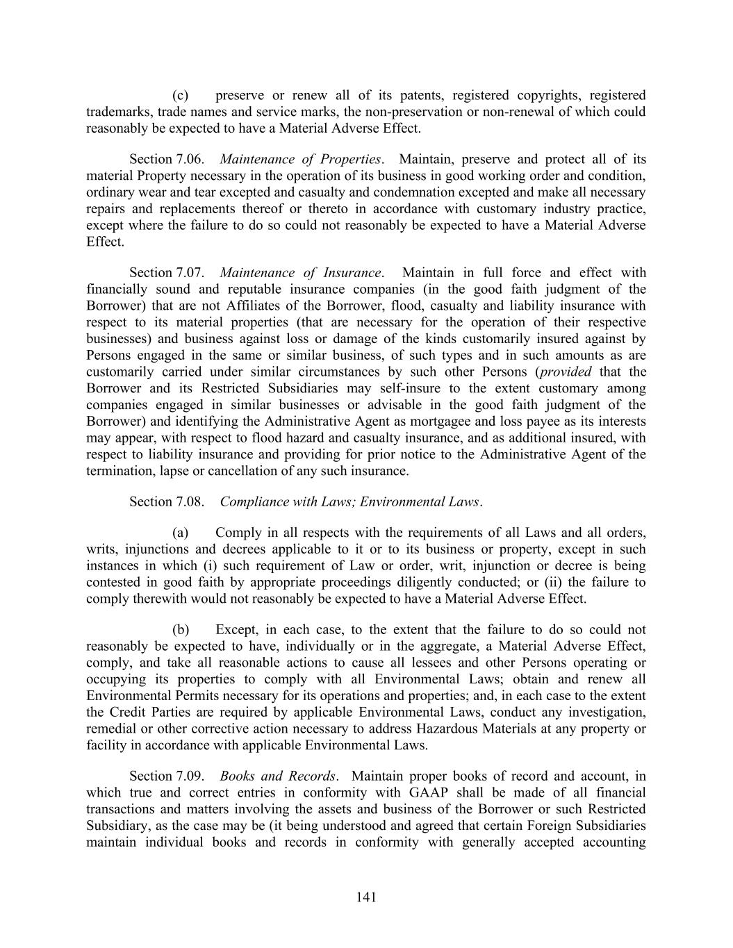 141 (c) preserve or renew all of its patents, registered copyrights, registered trademarks, trade names and service marks, the non-preservation or non-renewal of which could reasonably be expected to have a Material Adverse Effect. Section 7.06. Maintenance of Properties. Maintain, preserve and protect all of its material Property necessary in the operation of its business in good working order and condition, ordinary wear and tear excepted and casualty and condemnation excepted and make all necessary repairs and replacements thereof or thereto in accordance with customary industry practice, except where the failure to do so could not reasonably be expected to have a Material Adverse Effect. Section 7.07. Maintenance of Insurance. Maintain in full force and effect with financially sound and reputable insurance companies (in the good faith judgment of the Borrower) that are not Affiliates of the Borrower, flood, casualty and liability insurance with respect to its material properties (that are necessary for the operation of their respective businesses) and business against loss or damage of the kinds customarily insured against by Persons engaged in the same or similar business, of such types and in such amounts as are customarily carried under similar circumstances by such other Persons (provided that the Borrower and its Restricted Subsidiaries may self-insure to the extent customary among companies engaged in similar businesses or advisable in the good faith judgment of the Borrower) and identifying the Administrative Agent as mortgagee and loss payee as its interests may appear, with respect to flood hazard and casualty insurance, and as additional insured, with respect to liability insurance and providing for prior notice to the Administrative Agent of the termination, lapse or cancellation of any such insurance. Section 7.08. Compliance with Laws; Environmental Laws. (a) Comply in all respects with the requirements of all Laws and all orders, writs, injunctions and decrees applicable to it or to its business or property, except in such instances in which (i) such requirement of Law or order, writ, injunction or decree is being contested in good faith by appropriate proceedings diligently conducted; or (ii) the failure to comply therewith would not reasonably be expected to have a Material Adverse Effect. (b) Except, in each case, to the extent that the failure to do so could not reasonably be expected to have, individually or in the aggregate, a Material Adverse Effect, comply, and take all reasonable actions to cause all lessees and other Persons operating or occupying its properties to comply with all Environmental Laws; obtain and renew all Environmental Permits necessary for its operations and properties; and, in each case to the extent the Credit Parties are required by applicable Environmental Laws, conduct any investigation, remedial or other corrective action necessary to address Hazardous Materials at any property or facility in accordance with applicable Environmental Laws. Section 7.09. Books and Records. Maintain proper books of record and account, in which true and correct entries in conformity with GAAP shall be made of all financial transactions and matters involving the assets and business of the Borrower or such Restricted Subsidiary, as the case may be (it being understood and agreed that certain Foreign Subsidiaries maintain individual books and records in conformity with generally accepted accounting