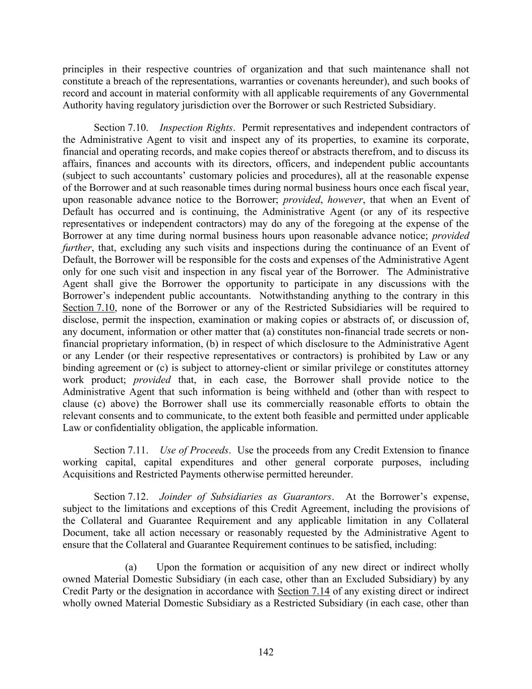 142 principles in their respective countries of organization and that such maintenance shall not constitute a breach of the representations, warranties or covenants hereunder), and such books of record and account in material conformity with all applicable requirements of any Governmental Authority having regulatory jurisdiction over the Borrower or such Restricted Subsidiary. Section 7.10. Inspection Rights. Permit representatives and independent contractors of the Administrative Agent to visit and inspect any of its properties, to examine its corporate, financial and operating records, and make copies thereof or abstracts therefrom, and to discuss its affairs, finances and accounts with its directors, officers, and independent public accountants (subject to such accountants’ customary policies and procedures), all at the reasonable expense of the Borrower and at such reasonable times during normal business hours once each fiscal year, upon reasonable advance notice to the Borrower; provided, however, that when an Event of Default has occurred and is continuing, the Administrative Agent (or any of its respective representatives or independent contractors) may do any of the foregoing at the expense of the Borrower at any time during normal business hours upon reasonable advance notice; provided further, that, excluding any such visits and inspections during the continuance of an Event of Default, the Borrower will be responsible for the costs and expenses of the Administrative Agent only for one such visit and inspection in any fiscal year of the Borrower. The Administrative Agent shall give the Borrower the opportunity to participate in any discussions with the Borrower’s independent public accountants. Notwithstanding anything to the contrary in this Section 7.10, none of the Borrower or any of the Restricted Subsidiaries will be required to disclose, permit the inspection, examination or making copies or abstracts of, or discussion of, any document, information or other matter that (a) constitutes non-financial trade secrets or non- financial proprietary information, (b) in respect of which disclosure to the Administrative Agent or any Lender (or their respective representatives or contractors) is prohibited by Law or any binding agreement or (c) is subject to attorney-client or similar privilege or constitutes attorney work product; provided that, in each case, the Borrower shall provide notice to the Administrative Agent that such information is being withheld and (other than with respect to clause (c) above) the Borrower shall use its commercially reasonable efforts to obtain the relevant consents and to communicate, to the extent both feasible and permitted under applicable Law or confidentiality obligation, the applicable information. Section 7.11. Use of Proceeds. Use the proceeds from any Credit Extension to finance working capital, capital expenditures and other general corporate purposes, including Acquisitions and Restricted Payments otherwise permitted hereunder. Section 7.12. Joinder of Subsidiaries as Guarantors. At the Borrower’s expense, subject to the limitations and exceptions of this Credit Agreement, including the provisions of the Collateral and Guarantee Requirement and any applicable limitation in any Collateral Document, take all action necessary or reasonably requested by the Administrative Agent to ensure that the Collateral and Guarantee Requirement continues to be satisfied, including: (a) Upon the formation or acquisition of any new direct or indirect wholly owned Material Domestic Subsidiary (in each case, other than an Excluded Subsidiary) by any Credit Party or the designation in accordance with Section 7.14 of any existing direct or indirect wholly owned Material Domestic Subsidiary as a Restricted Subsidiary (in each case, other than