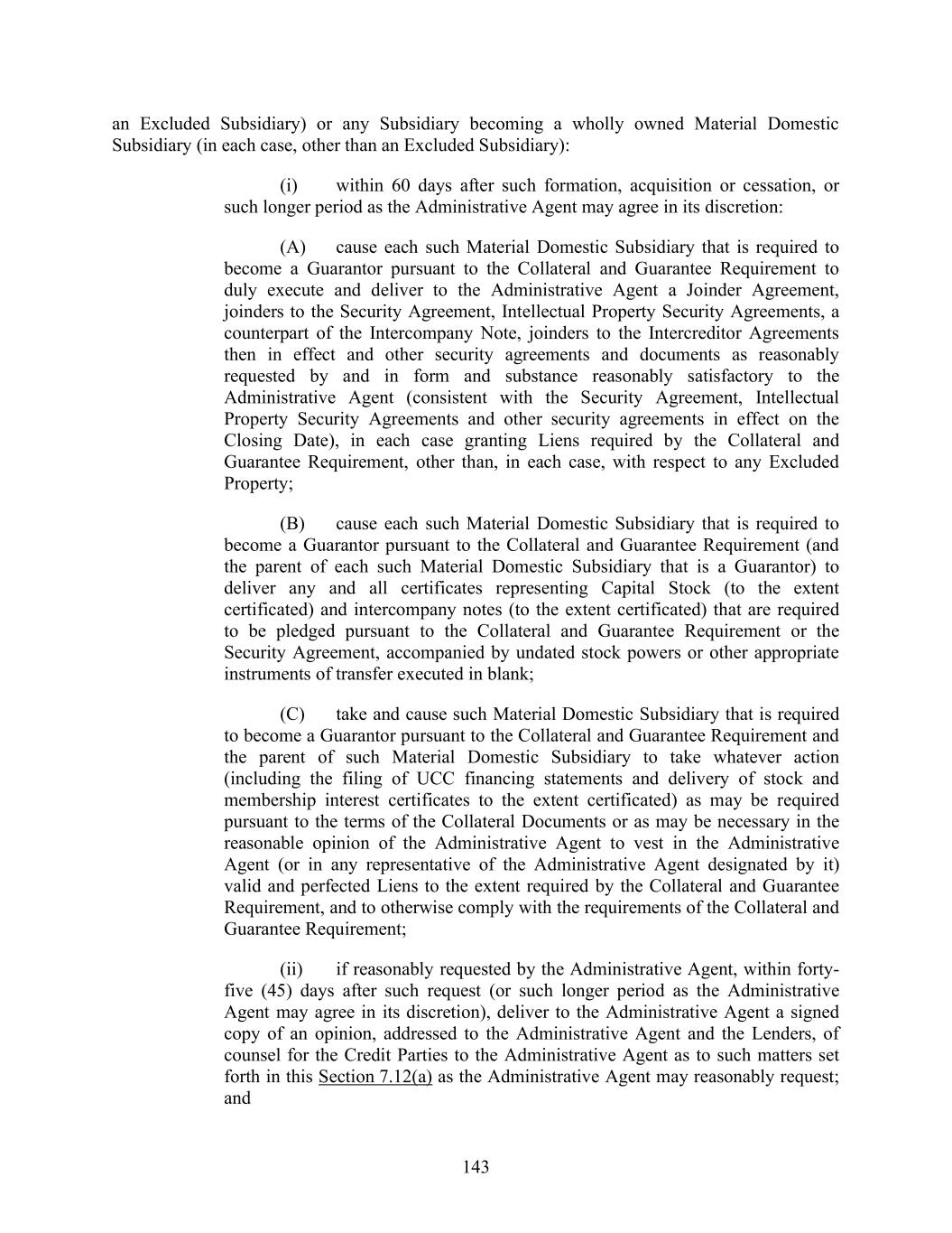 143 an Excluded Subsidiary) or any Subsidiary becoming a wholly owned Material Domestic Subsidiary (in each case, other than an Excluded Subsidiary): (i) within 60 days after such formation, acquisition or cessation, or such longer period as the Administrative Agent may agree in its discretion: (A) cause each such Material Domestic Subsidiary that is required to become a Guarantor pursuant to the Collateral and Guarantee Requirement to duly execute and deliver to the Administrative Agent a Joinder Agreement, joinders to the Security Agreement, Intellectual Property Security Agreements, a counterpart of the Intercompany Note, joinders to the Intercreditor Agreements then in effect and other security agreements and documents as reasonably requested by and in form and substance reasonably satisfactory to the Administrative Agent (consistent with the Security Agreement, Intellectual Property Security Agreements and other security agreements in effect on the Closing Date), in each case granting Liens required by the Collateral and Guarantee Requirement, other than, in each case, with respect to any Excluded Property; (B) cause each such Material Domestic Subsidiary that is required to become a Guarantor pursuant to the Collateral and Guarantee Requirement (and the parent of each such Material Domestic Subsidiary that is a Guarantor) to deliver any and all certificates representing Capital Stock (to the extent certificated) and intercompany notes (to the extent certificated) that are required to be pledged pursuant to the Collateral and Guarantee Requirement or the Security Agreement, accompanied by undated stock powers or other appropriate instruments of transfer executed in blank; (C) take and cause such Material Domestic Subsidiary that is required to become a Guarantor pursuant to the Collateral and Guarantee Requirement and the parent of such Material Domestic Subsidiary to take whatever action (including the filing of UCC financing statements and delivery of stock and membership interest certificates to the extent certificated) as may be required pursuant to the terms of the Collateral Documents or as may be necessary in the reasonable opinion of the Administrative Agent to vest in the Administrative Agent (or in any representative of the Administrative Agent designated by it) valid and perfected Liens to the extent required by the Collateral and Guarantee Requirement, and to otherwise comply with the requirements of the Collateral and Guarantee Requirement; (ii) if reasonably requested by the Administrative Agent, within forty- five (45) days after such request (or such longer period as the Administrative Agent may agree in its discretion), deliver to the Administrative Agent a signed copy of an opinion, addressed to the Administrative Agent and the Lenders, of counsel for the Credit Parties to the Administrative Agent as to such matters set forth in this Section 7.12(a) as the Administrative Agent may reasonably request; and