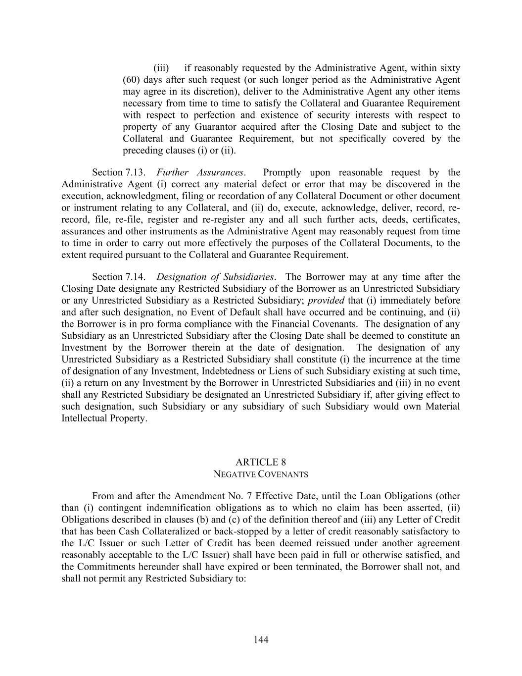 144 (iii) if reasonably requested by the Administrative Agent, within sixty (60) days after such request (or such longer period as the Administrative Agent may agree in its discretion), deliver to the Administrative Agent any other items necessary from time to time to satisfy the Collateral and Guarantee Requirement with respect to perfection and existence of security interests with respect to property of any Guarantor acquired after the Closing Date and subject to the Collateral and Guarantee Requirement, but not specifically covered by the preceding clauses (i) or (ii). Section 7.13. Further Assurances. Promptly upon reasonable request by the Administrative Agent (i) correct any material defect or error that may be discovered in the execution, acknowledgment, filing or recordation of any Collateral Document or other document or instrument relating to any Collateral, and (ii) do, execute, acknowledge, deliver, record, re- record, file, re-file, register and re-register any and all such further acts, deeds, certificates, assurances and other instruments as the Administrative Agent may reasonably request from time to time in order to carry out more effectively the purposes of the Collateral Documents, to the extent required pursuant to the Collateral and Guarantee Requirement. Section 7.14. Designation of Subsidiaries. The Borrower may at any time after the Closing Date designate any Restricted Subsidiary of the Borrower as an Unrestricted Subsidiary or any Unrestricted Subsidiary as a Restricted Subsidiary; provided that (i) immediately before and after such designation, no Event of Default shall have occurred and be continuing, and (ii) the Borrower is in pro forma compliance with the Financial Covenants. The designation of any Subsidiary as an Unrestricted Subsidiary after the Closing Date shall be deemed to constitute an Investment by the Borrower therein at the date of designation. The designation of any Unrestricted Subsidiary as a Restricted Subsidiary shall constitute (i) the incurrence at the time of designation of any Investment, Indebtedness or Liens of such Subsidiary existing at such time, (ii) a return on any Investment by the Borrower in Unrestricted Subsidiaries and (iii) in no event shall any Restricted Subsidiary be designated an Unrestricted Subsidiary if, after giving effect to such designation, such Subsidiary or any subsidiary of such Subsidiary would own Material Intellectual Property. ARTICLE 8 NEGATIVE COVENANTS From and after the Amendment No. 7 Effective Date, until the Loan Obligations (other than (i) contingent indemnification obligations as to which no claim has been asserted, (ii) Obligations described in clauses (b) and (c) of the definition thereof and (iii) any Letter of Credit that has been Cash Collateralized or back-stopped by a letter of credit reasonably satisfactory to the L/C Issuer or such Letter of Credit has been deemed reissued under another agreement reasonably acceptable to the L/C Issuer) shall have been paid in full or otherwise satisfied, and the Commitments hereunder shall have expired or been terminated, the Borrower shall not, and shall not permit any Restricted Subsidiary to: