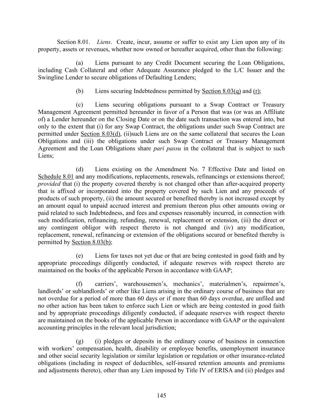 145 Section 8.01. Liens. Create, incur, assume or suffer to exist any Lien upon any of its property, assets or revenues, whether now owned or hereafter acquired, other than the following: (a) Liens pursuant to any Credit Document securing the Loan Obligations, including Cash Collateral and other Adequate Assurance pledged to the L/C Issuer and the Swingline Lender to secure obligations of Defaulting Lenders; (b) Liens securing Indebtedness permitted by Section 8.03(q) and (r); (c) Liens securing obligations pursuant to a Swap Contract or Treasury Management Agreement permitted hereunder in favor of a Person that was (or was an Affiliate of) a Lender hereunder on the Closing Date or on the date such transaction was entered into, but only to the extent that (i) for any Swap Contract, the obligations under such Swap Contract are permitted under Section 8.03(d), (ii)such Liens are on the same collateral that secures the Loan Obligations and (iii) the obligations under such Swap Contract or Treasury Management Agreement and the Loan Obligations share pari passu in the collateral that is subject to such Liens; (d) Liens existing on the Amendment No. 7 Effective Date and listed on Schedule 8.01 and any modifications, replacements, renewals, refinancings or extensions thereof; provided that (i) the property covered thereby is not changed other than after-acquired property that is affixed or incorporated into the property covered by such Lien and any proceeds of products of such property, (ii) the amount secured or benefited thereby is not increased except by an amount equal to unpaid accrued interest and premium thereon plus other amounts owing or paid related to such Indebtedness, and fees and expenses reasonably incurred, in connection with such modification, refinancing, refunding, renewal, replacement or extension, (iii) the direct or any contingent obligor with respect thereto is not changed and (iv) any modification, replacement, renewal, refinancing or extension of the obligations secured or benefited thereby is permitted by Section 8.03(b); (e) Liens for taxes not yet due or that are being contested in good faith and by appropriate proceedings diligently conducted, if adequate reserves with respect thereto are maintained on the books of the applicable Person in accordance with GAAP; (f) carriers’, warehousemen’s, mechanics’, materialmen’s, repairmen’s, landlords’ or sublandlords’ or other like Liens arising in the ordinary course of business that are not overdue for a period of more than 60 days or if more than 60 days overdue, are unfiled and no other action has been taken to enforce such Lien or which are being contested in good faith and by appropriate proceedings diligently conducted, if adequate reserves with respect thereto are maintained on the books of the applicable Person in accordance with GAAP or the equivalent accounting principles in the relevant local jurisdiction; (g) (i) pledges or deposits in the ordinary course of business in connection with workers’ compensation, health, disability or employee benefits, unemployment insurance and other social security legislation or similar legislation or regulation or other insurance-related obligations (including in respect of deductibles, self-insured retention amounts and premiums and adjustments thereto), other than any Lien imposed by Title IV of ERISA and (ii) pledges and