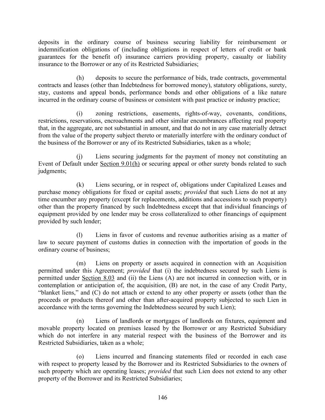 146 deposits in the ordinary course of business securing liability for reimbursement or indemnification obligations of (including obligations in respect of letters of credit or bank guarantees for the benefit of) insurance carriers providing property, casualty or liability insurance to the Borrower or any of its Restricted Subsidiaries; (h) deposits to secure the performance of bids, trade contracts, governmental contracts and leases (other than Indebtedness for borrowed money), statutory obligations, surety, stay, customs and appeal bonds, performance bonds and other obligations of a like nature incurred in the ordinary course of business or consistent with past practice or industry practice; (i) zoning restrictions, easements, rights-of-way, covenants, conditions, restrictions, reservations, encroachments and other similar encumbrances affecting real property that, in the aggregate, are not substantial in amount, and that do not in any case materially detract from the value of the property subject thereto or materially interfere with the ordinary conduct of the business of the Borrower or any of its Restricted Subsidiaries, taken as a whole; (j) Liens securing judgments for the payment of money not constituting an Event of Default under Section 9.01(h) or securing appeal or other surety bonds related to such judgments; (k) Liens securing, or in respect of, obligations under Capitalized Leases and purchase money obligations for fixed or capital assets; provided that such Liens do not at any time encumber any property (except for replacements, additions and accessions to such property) other than the property financed by such Indebtedness except that that individual financings of equipment provided by one lender may be cross collateralized to other financings of equipment provided by such lender; (l) Liens in favor of customs and revenue authorities arising as a matter of law to secure payment of customs duties in connection with the importation of goods in the ordinary course of business; (m) Liens on property or assets acquired in connection with an Acquisition permitted under this Agreement; provided that (i) the indebtedness secured by such Liens is permitted under Section 8.03 and (ii) the Liens (A) are not incurred in connection with, or in contemplation or anticipation of, the acquisition, (B) are not, in the case of any Credit Party, “blanket liens,” and (C) do not attach or extend to any other property or assets (other than the proceeds or products thereof and other than after-acquired property subjected to such Lien in accordance with the terms governing the Indebtedness secured by such Lien); (n) Liens of landlords or mortgages of landlords on fixtures, equipment and movable property located on premises leased by the Borrower or any Restricted Subsidiary which do not interfere in any material respect with the business of the Borrower and its Restricted Subsidiaries, taken as a whole; (o) Liens incurred and financing statements filed or recorded in each case with respect to property leased by the Borrower and its Restricted Subsidiaries to the owners of such property which are operating leases; provided that such Lien does not extend to any other property of the Borrower and its Restricted Subsidiaries;