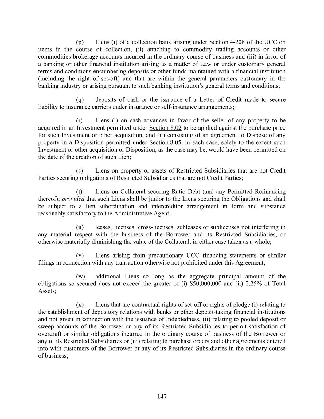 147 (p) Liens (i) of a collection bank arising under Section 4-208 of the UCC on items in the course of collection, (ii) attaching to commodity trading accounts or other commodities brokerage accounts incurred in the ordinary course of business and (iii) in favor of a banking or other financial institution arising as a matter of Law or under customary general terms and conditions encumbering deposits or other funds maintained with a financial institution (including the right of set-off) and that are within the general parameters customary in the banking industry or arising pursuant to such banking institution’s general terms and conditions; (q) deposits of cash or the issuance of a Letter of Credit made to secure liability to insurance carriers under insurance or self-insurance arrangements; (r) Liens (i) on cash advances in favor of the seller of any property to be acquired in an Investment permitted under Section 8.02 to be applied against the purchase price for such Investment or other acquisition, and (ii) consisting of an agreement to Dispose of any property in a Disposition permitted under Section 8.05, in each case, solely to the extent such Investment or other acquisition or Disposition, as the case may be, would have been permitted on the date of the creation of such Lien; (s) Liens on property or assets of Restricted Subsidiaries that are not Credit Parties securing obligations of Restricted Subsidiaries that are not Credit Parties; (t) Liens on Collateral securing Ratio Debt (and any Permitted Refinancing thereof); provided that such Liens shall be junior to the Liens securing the Obligations and shall be subject to a lien subordination and intercreditor arrangement in form and substance reasonably satisfactory to the Administrative Agent; (u) leases, licenses, cross-licenses, subleases or sublicenses not interfering in any material respect with the business of the Borrower and its Restricted Subsidiaries, or otherwise materially diminishing the value of the Collateral, in either case taken as a whole; (v) Liens arising from precautionary UCC financing statements or similar filings in connection with any transaction otherwise not prohibited under this Agreement; (w) additional Liens so long as the aggregate principal amount of the obligations so secured does not exceed the greater of (i) $50,000,000 and (ii) 2.25% of Total Assets; (x) Liens that are contractual rights of set-off or rights of pledge (i) relating to the establishment of depository relations with banks or other deposit-taking financial institutions and not given in connection with the issuance of Indebtedness, (ii) relating to pooled deposit or sweep accounts of the Borrower or any of its Restricted Subsidiaries to permit satisfaction of overdraft or similar obligations incurred in the ordinary course of business of the Borrower or any of its Restricted Subsidiaries or (iii) relating to purchase orders and other agreements entered into with customers of the Borrower or any of its Restricted Subsidiaries in the ordinary course of business;
