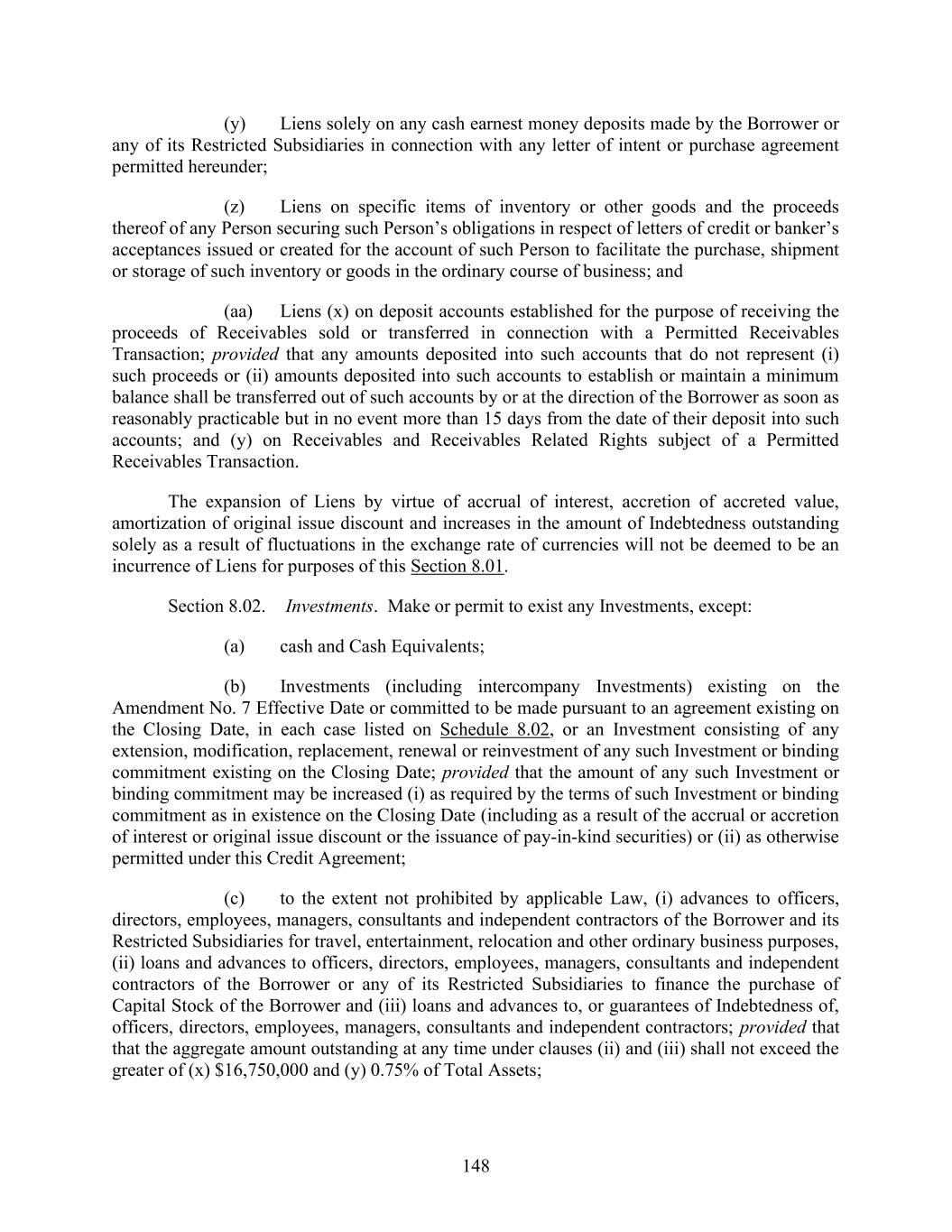 148 (y) Liens solely on any cash earnest money deposits made by the Borrower or any of its Restricted Subsidiaries in connection with any letter of intent or purchase agreement permitted hereunder; (z) Liens on specific items of inventory or other goods and the proceeds thereof of any Person securing such Person’s obligations in respect of letters of credit or banker’s acceptances issued or created for the account of such Person to facilitate the purchase, shipment or storage of such inventory or goods in the ordinary course of business; and (aa) Liens (x) on deposit accounts established for the purpose of receiving the proceeds of Receivables sold or transferred in connection with a Permitted Receivables Transaction; provided that any amounts deposited into such accounts that do not represent (i) such proceeds or (ii) amounts deposited into such accounts to establish or maintain a minimum balance shall be transferred out of such accounts by or at the direction of the Borrower as soon as reasonably practicable but in no event more than 15 days from the date of their deposit into such accounts; and (y) on Receivables and Receivables Related Rights subject of a Permitted Receivables Transaction. The expansion of Liens by virtue of accrual of interest, accretion of accreted value, amortization of original issue discount and increases in the amount of Indebtedness outstanding solely as a result of fluctuations in the exchange rate of currencies will not be deemed to be an incurrence of Liens for purposes of this Section 8.01. Section 8.02. Investments. Make or permit to exist any Investments, except: (a) cash and Cash Equivalents; (b) Investments (including intercompany Investments) existing on the Amendment No. 7 Effective Date or committed to be made pursuant to an agreement existing on the Closing Date, in each case listed on Schedule 8.02, or an Investment consisting of any extension, modification, replacement, renewal or reinvestment of any such Investment or binding commitment existing on the Closing Date; provided that the amount of any such Investment or binding commitment may be increased (i) as required by the terms of such Investment or binding commitment as in existence on the Closing Date (including as a result of the accrual or accretion of interest or original issue discount or the issuance of pay-in-kind securities) or (ii) as otherwise permitted under this Credit Agreement; (c) to the extent not prohibited by applicable Law, (i) advances to officers, directors, employees, managers, consultants and independent contractors of the Borrower and its Restricted Subsidiaries for travel, entertainment, relocation and other ordinary business purposes, (ii) loans and advances to officers, directors, employees, managers, consultants and independent contractors of the Borrower or any of its Restricted Subsidiaries to finance the purchase of Capital Stock of the Borrower and (iii) loans and advances to, or guarantees of Indebtedness of, officers, directors, employees, managers, consultants and independent contractors; provided that that the aggregate amount outstanding at any time under clauses (ii) and (iii) shall not exceed the greater of (x) $16,750,000 and (y) 0.75% of Total Assets;