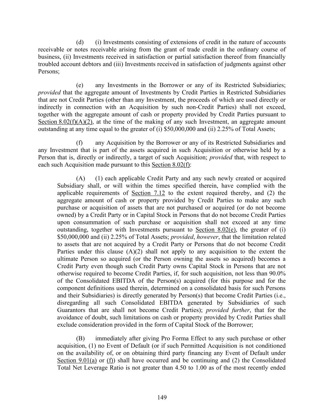 149 (d) (i) Investments consisting of extensions of credit in the nature of accounts receivable or notes receivable arising from the grant of trade credit in the ordinary course of business, (ii) Investments received in satisfaction or partial satisfaction thereof from financially troubled account debtors and (iii) Investments received in satisfaction of judgments against other Persons; (e) any Investments in the Borrower or any of its Restricted Subsidiaries; provided that the aggregate amount of Investments by Credit Parties in Restricted Subsidiaries that are not Credit Parties (other than any Investment, the proceeds of which are used directly or indirectly in connection with an Acquisition by such non-Credit Parties) shall not exceed, together with the aggregate amount of cash or property provided by Credit Parties pursuant to Section 8.02(f)(A)(2), at the time of the making of any such Investment, an aggregate amount outstanding at any time equal to the greater of (i) $50,000,000 and (ii) 2.25% of Total Assets; (f) any Acquisition by the Borrower or any of its Restricted Subsidiaries and any Investment that is part of the assets acquired in such Acquisition or otherwise held by a Person that is, directly or indirectly, a target of such Acquisition; provided that, with respect to each such Acquisition made pursuant to this Section 8.02(f): (A) (1) each applicable Credit Party and any such newly created or acquired Subsidiary shall, or will within the times specified therein, have complied with the applicable requirements of Section 7.12 to the extent required thereby, and (2) the aggregate amount of cash or property provided by Credit Parties to make any such purchase or acquisition of assets that are not purchased or acquired (or do not become owned) by a Credit Party or in Capital Stock in Persons that do not become Credit Parties upon consummation of such purchase or acquisition shall not exceed at any time outstanding, together with Investments pursuant to Section 8.02(e), the greater of (i) $50,000,000 and (ii) 2.25% of Total Assets; provided, however, that the limitation related to assets that are not acquired by a Credit Party or Persons that do not become Credit Parties under this clause (A)(2) shall not apply to any acquisition to the extent the ultimate Person so acquired (or the Person owning the assets so acquired) becomes a Credit Party even though such Credit Party owns Capital Stock in Persons that are not otherwise required to become Credit Parties, if, for such acquisition, not less than 90.0% of the Consolidated EBITDA of the Person(s) acquired (for this purpose and for the component definitions used therein, determined on a consolidated basis for such Persons and their Subsidiaries) is directly generated by Person(s) that become Credit Parties (i.e., disregarding all such Consolidated EBITDA generated by Subsidiaries of such Guarantors that are shall not become Credit Parties); provided further, that for the avoidance of doubt, such limitations on cash or property provided by Credit Parties shall exclude consideration provided in the form of Capital Stock of the Borrower; (B) immediately after giving Pro Forma Effect to any such purchase or other acquisition, (1) no Event of Default (or if such Permitted Acquisition is not conditioned on the availability of, or on obtaining third party financing any Event of Default under Section 9.01(a) or (f)) shall have occurred and be continuing and (2) the Consolidated Total Net Leverage Ratio is not greater than 4.50 to 1.00 as of the most recently ended