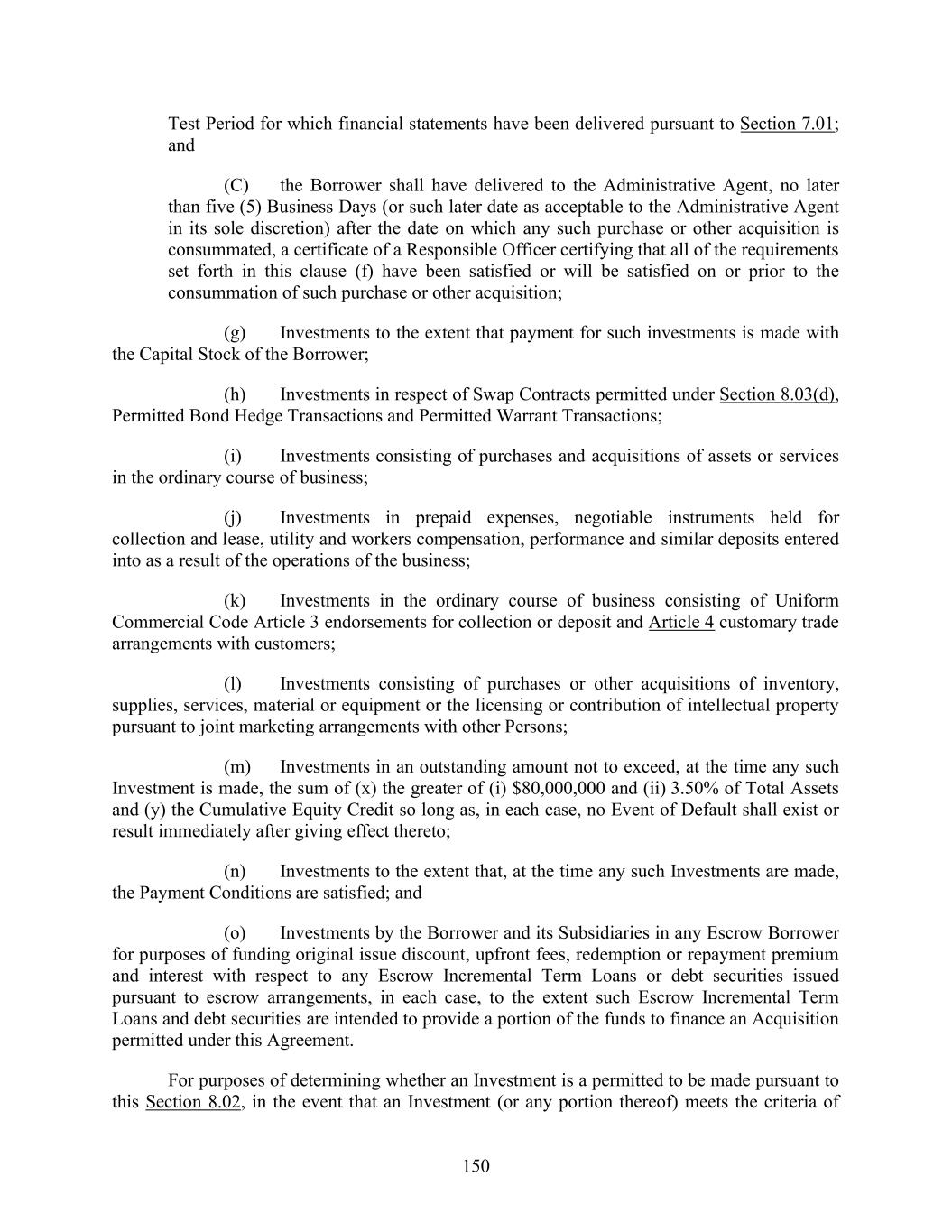150 Test Period for which financial statements have been delivered pursuant to Section 7.01; and (C) the Borrower shall have delivered to the Administrative Agent, no later than five (5) Business Days (or such later date as acceptable to the Administrative Agent in its sole discretion) after the date on which any such purchase or other acquisition is consummated, a certificate of a Responsible Officer certifying that all of the requirements set forth in this clause (f) have been satisfied or will be satisfied on or prior to the consummation of such purchase or other acquisition; (g) Investments to the extent that payment for such investments is made with the Capital Stock of the Borrower; (h) Investments in respect of Swap Contracts permitted under Section 8.03(d), Permitted Bond Hedge Transactions and Permitted Warrant Transactions; (i) Investments consisting of purchases and acquisitions of assets or services in the ordinary course of business; (j) Investments in prepaid expenses, negotiable instruments held for collection and lease, utility and workers compensation, performance and similar deposits entered into as a result of the operations of the business; (k) Investments in the ordinary course of business consisting of Uniform Commercial Code Article 3 endorsements for collection or deposit and Article 4 customary trade arrangements with customers; (l) Investments consisting of purchases or other acquisitions of inventory, supplies, services, material or equipment or the licensing or contribution of intellectual property pursuant to joint marketing arrangements with other Persons; (m) Investments in an outstanding amount not to exceed, at the time any such Investment is made, the sum of (x) the greater of (i) $80,000,000 and (ii) 3.50% of Total Assets and (y) the Cumulative Equity Credit so long as, in each case, no Event of Default shall exist or result immediately after giving effect thereto; (n) Investments to the extent that, at the time any such Investments are made, the Payment Conditions are satisfied; and (o) Investments by the Borrower and its Subsidiaries in any Escrow Borrower for purposes of funding original issue discount, upfront fees, redemption or repayment premium and interest with respect to any Escrow Incremental Term Loans or debt securities issued pursuant to escrow arrangements, in each case, to the extent such Escrow Incremental Term Loans and debt securities are intended to provide a portion of the funds to finance an Acquisition permitted under this Agreement. For purposes of determining whether an Investment is a permitted to be made pursuant to this Section 8.02, in the event that an Investment (or any portion thereof) meets the criteria of