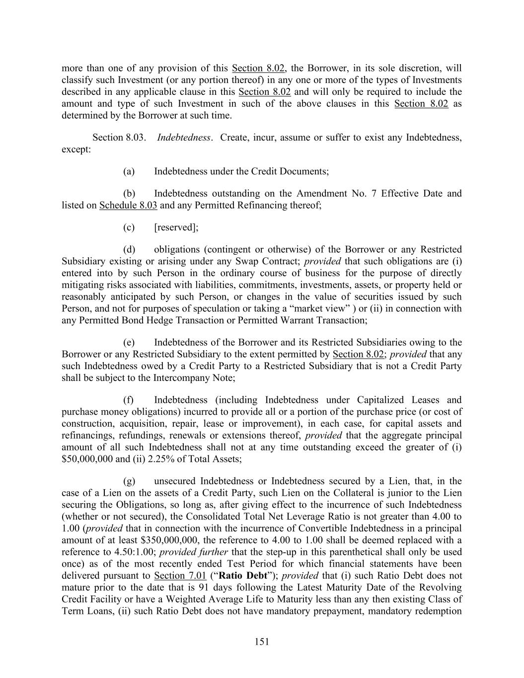 151 more than one of any provision of this Section 8.02, the Borrower, in its sole discretion, will classify such Investment (or any portion thereof) in any one or more of the types of Investments described in any applicable clause in this Section 8.02 and will only be required to include the amount and type of such Investment in such of the above clauses in this Section 8.02 as determined by the Borrower at such time. Section 8.03. Indebtedness. Create, incur, assume or suffer to exist any Indebtedness, except: (a) Indebtedness under the Credit Documents; (b) Indebtedness outstanding on the Amendment No. 7 Effective Date and listed on Schedule 8.03 and any Permitted Refinancing thereof; (c) [reserved]; (d) obligations (contingent or otherwise) of the Borrower or any Restricted Subsidiary existing or arising under any Swap Contract; provided that such obligations are (i) entered into by such Person in the ordinary course of business for the purpose of directly mitigating risks associated with liabilities, commitments, investments, assets, or property held or reasonably anticipated by such Person, or changes in the value of securities issued by such Person, and not for purposes of speculation or taking a “market view” ) or (ii) in connection with any Permitted Bond Hedge Transaction or Permitted Warrant Transaction; (e) Indebtedness of the Borrower and its Restricted Subsidiaries owing to the Borrower or any Restricted Subsidiary to the extent permitted by Section 8.02; provided that any such Indebtedness owed by a Credit Party to a Restricted Subsidiary that is not a Credit Party shall be subject to the Intercompany Note; (f) Indebtedness (including Indebtedness under Capitalized Leases and purchase money obligations) incurred to provide all or a portion of the purchase price (or cost of construction, acquisition, repair, lease or improvement), in each case, for capital assets and refinancings, refundings, renewals or extensions thereof, provided that the aggregate principal amount of all such Indebtedness shall not at any time outstanding exceed the greater of (i) $50,000,000 and (ii) 2.25% of Total Assets; (g) unsecured Indebtedness or Indebtedness secured by a Lien, that, in the case of a Lien on the assets of a Credit Party, such Lien on the Collateral is junior to the Lien securing the Obligations, so long as, after giving effect to the incurrence of such Indebtedness (whether or not secured), the Consolidated Total Net Leverage Ratio is not greater than 4.00 to 1.00 (provided that in connection with the incurrence of Convertible Indebtedness in a principal amount of at least $350,000,000, the reference to 4.00 to 1.00 shall be deemed replaced with a reference to 4.50:1.00; provided further that the step-up in this parenthetical shall only be used once) as of the most recently ended Test Period for which financial statements have been delivered pursuant to Section 7.01 (“Ratio Debt”); provided that (i) such Ratio Debt does not mature prior to the date that is 91 days following the Latest Maturity Date of the Revolving Credit Facility or have a Weighted Average Life to Maturity less than any then existing Class of Term Loans, (ii) such Ratio Debt does not have mandatory prepayment, mandatory redemption