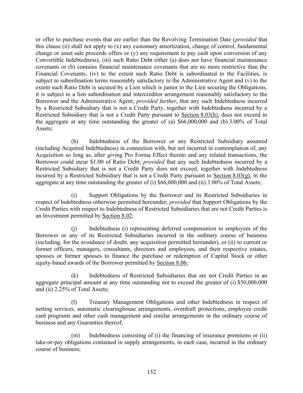 152 or offer to purchase events that are earlier than the Revolving Termination Date (provided that this clause (ii) shall not apply to (x) any customary amortization, change of control, fundamental change or asset sale proceeds offers or (y) any requirement to pay cash upon conversion of any Convertible Indebtedness), (iii) such Ratio Debt either (a) does not have financial maintenance covenants or (b) contains financial maintenance covenants that are no more restrictive than the Financial Covenants, (iv) to the extent such Ratio Debt is subordinated to the Facilities, is subject to subordination terms reasonably satisfactory to the Administrative Agent and (v) to the extent such Ratio Debt is secured by a Lien which is junior to the Lien securing the Obligations, it is subject to a lien subordination and intercreditor arrangement reasonably satisfactory to the Borrower and the Administrative Agent; provided further, that any such Indebtedness incurred by a Restricted Subsidiary that is not a Credit Party, together with Indebtedness incurred by a Restricted Subsidiary that is not a Credit Party pursuant to Section 8.03(h), does not exceed in the aggregate at any time outstanding the greater of (a) $66,000,000 and (b) 3.00% of Total Assets; (h) Indebtedness of the Borrower or any Restricted Subsidiary assumed (including Acquired Indebtedness) in connection with, but not incurred in contemplation of, any Acquisition so long as, after giving Pro Forma Effect thereto and any related transactions, the Borrower could incur $1.00 of Ratio Debt; provided that any such Indebtedness incurred by a Restricted Subsidiary that is not a Credit Party does not exceed, together with Indebtedness incurred by a Restricted Subsidiary that is not a Credit Party pursuant to Section 8.03(g), in the aggregate at any time outstanding the greater of (i) $66,000,000 and (ii) 3.00% of Total Assets; (i) Support Obligations by the Borrower and its Restricted Subsidiaries in respect of Indebtedness otherwise permitted hereunder; provided that Support Obligations by the Credit Parties with respect to Indebtedness of Restricted Subsidiaries that are not Credit Parties is an Investment permitted by Section 8.02; (j) Indebtedness (i) representing deferred compensation to employees of the Borrower or any of its Restricted Subsidiaries incurred in the ordinary course of business (including, for the avoidance of doubt, any acquisition permitted hereunder), or (ii) to current or former officers, managers, consultants, directors and employees, and their respective estates, spouses or former spouses to finance the purchase or redemption of Capital Stock or other equity-based awards of the Borrower permitted by Section 8.06; (k) Indebtedness of Restricted Subsidiaries that are not Credit Parties in an aggregate principal amount at any time outstanding not to exceed the greater of (i) $50,000,000 and (ii) 2.25% of Total Assets; (l) Treasury Management Obligations and other Indebtedness in respect of netting services, automatic clearinghouse arrangements, overdraft protections, employee credit card programs and other cash management and similar arrangements in the ordinary course of business and any Guaranties thereof; (m) Indebtedness consisting of (i) the financing of insurance premiums or (ii) take-or-pay obligations contained in supply arrangements, in each case, incurred in the ordinary course of business;