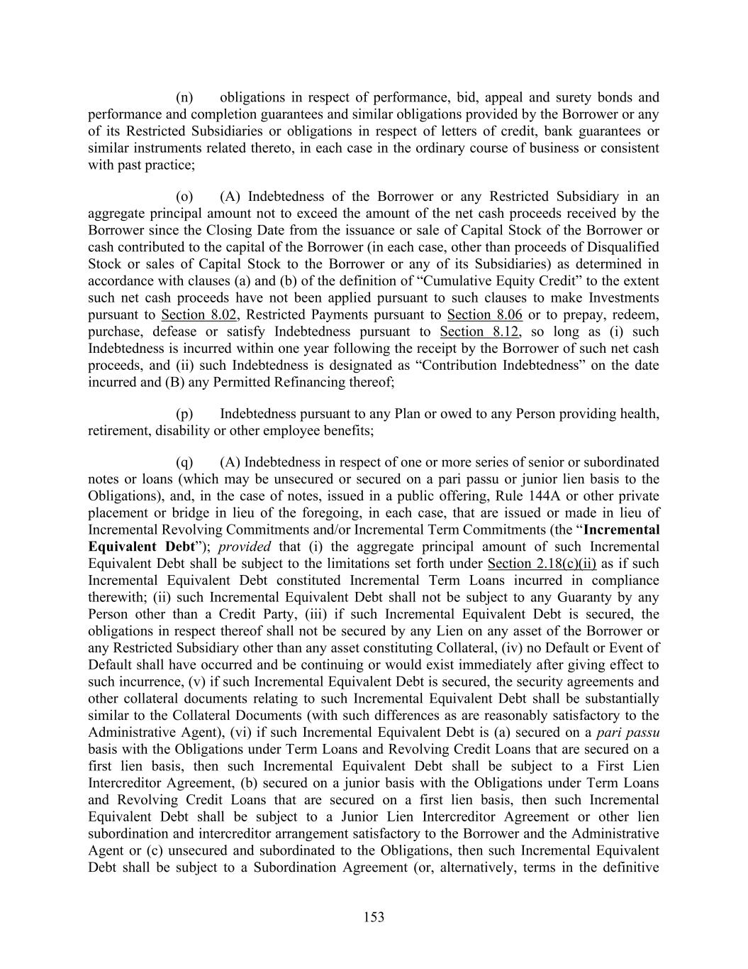 153 (n) obligations in respect of performance, bid, appeal and surety bonds and performance and completion guarantees and similar obligations provided by the Borrower or any of its Restricted Subsidiaries or obligations in respect of letters of credit, bank guarantees or similar instruments related thereto, in each case in the ordinary course of business or consistent with past practice; (o) (A) Indebtedness of the Borrower or any Restricted Subsidiary in an aggregate principal amount not to exceed the amount of the net cash proceeds received by the Borrower since the Closing Date from the issuance or sale of Capital Stock of the Borrower or cash contributed to the capital of the Borrower (in each case, other than proceeds of Disqualified Stock or sales of Capital Stock to the Borrower or any of its Subsidiaries) as determined in accordance with clauses (a) and (b) of the definition of “Cumulative Equity Credit” to the extent such net cash proceeds have not been applied pursuant to such clauses to make Investments pursuant to Section 8.02, Restricted Payments pursuant to Section 8.06 or to prepay, redeem, purchase, defease or satisfy Indebtedness pursuant to Section 8.12, so long as (i) such Indebtedness is incurred within one year following the receipt by the Borrower of such net cash proceeds, and (ii) such Indebtedness is designated as “Contribution Indebtedness” on the date incurred and (B) any Permitted Refinancing thereof; (p) Indebtedness pursuant to any Plan or owed to any Person providing health, retirement, disability or other employee benefits; (q) (A) Indebtedness in respect of one or more series of senior or subordinated notes or loans (which may be unsecured or secured on a pari passu or junior lien basis to the Obligations), and, in the case of notes, issued in a public offering, Rule 144A or other private placement or bridge in lieu of the foregoing, in each case, that are issued or made in lieu of Incremental Revolving Commitments and/or Incremental Term Commitments (the “Incremental Equivalent Debt”); provided that (i) the aggregate principal amount of such Incremental Equivalent Debt shall be subject to the limitations set forth under Section 2.18(c)(ii) as if such Incremental Equivalent Debt constituted Incremental Term Loans incurred in compliance therewith; (ii) such Incremental Equivalent Debt shall not be subject to any Guaranty by any Person other than a Credit Party, (iii) if such Incremental Equivalent Debt is secured, the obligations in respect thereof shall not be secured by any Lien on any asset of the Borrower or any Restricted Subsidiary other than any asset constituting Collateral, (iv) no Default or Event of Default shall have occurred and be continuing or would exist immediately after giving effect to such incurrence, (v) if such Incremental Equivalent Debt is secured, the security agreements and other collateral documents relating to such Incremental Equivalent Debt shall be substantially similar to the Collateral Documents (with such differences as are reasonably satisfactory to the Administrative Agent), (vi) if such Incremental Equivalent Debt is (a) secured on a pari passu basis with the Obligations under Term Loans and Revolving Credit Loans that are secured on a first lien basis, then such Incremental Equivalent Debt shall be subject to a First Lien Intercreditor Agreement, (b) secured on a junior basis with the Obligations under Term Loans and Revolving Credit Loans that are secured on a first lien basis, then such Incremental Equivalent Debt shall be subject to a Junior Lien Intercreditor Agreement or other lien subordination and intercreditor arrangement satisfactory to the Borrower and the Administrative Agent or (c) unsecured and subordinated to the Obligations, then such Incremental Equivalent Debt shall be subject to a Subordination Agreement (or, alternatively, terms in the definitive