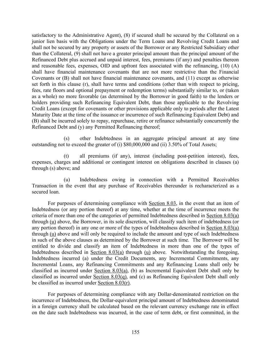 155 satisfactory to the Administrative Agent), (8) if secured shall be secured by the Collateral on a junior lien basis with the Obligations under the Term Loans and Revolving Credit Loans and shall not be secured by any property or assets of the Borrower or any Restricted Subsidiary other than the Collateral, (9) shall not have a greater principal amount than the principal amount of the Refinanced Debt plus accrued and unpaid interest, fees, premiums (if any) and penalties thereon and reasonable fees, expenses, OID and upfront fees associated with the refinancing, (10) (A) shall have financial maintenance covenants that are not more restrictive than the Financial Covenants or (B) shall not have financial maintenance covenants, and (11) except as otherwise set forth in this clause (r), shall have terms and conditions (other than with respect to pricing, fees, rate floors and optional prepayment or redemption terms) substantially similar to, or (taken as a whole) no more favorable (as determined by the Borrower in good faith) to the lenders or holders providing such Refinancing Equivalent Debt, than those applicable to the Revolving Credit Loans (except for covenants or other provisions applicable only to periods after the Latest Maturity Date at the time of the issuance or incurrence of such Refinancing Equivalent Debt) and (B) shall be incurred solely to repay, repurchase, retire or refinance substantially concurrently the Refinanced Debt and (y) any Permitted Refinancing thereof; (s) other Indebtedness in an aggregate principal amount at any time outstanding not to exceed the greater of (i) $80,000,000 and (ii) 3.50% of Total Assets; (t) all premiums (if any), interest (including post-petition interest), fees, expenses, charges and additional or contingent interest on obligations described in clauses (a) through (s) above; and (u) Indebtedness owing in connection with a Permitted Receivables Transaction in the event that any purchase of Receivables thereunder is recharacterized as a secured loan. For purposes of determining compliance with Section 8.03, in the event that an item of Indebtedness (or any portion thereof) at any time, whether at the time of incurrence meets the criteria of more than one of the categories of permitted Indebtedness described in Section 8.03(a) through (u) above, the Borrower, in its sole discretion, will classify such item of indebtedness (or any portion thereof) in any one or more of the types of Indebtedness described in Section 8.03(a) through (u) above and will only be required to include the amount and type of such Indebtedness in such of the above clauses as determined by the Borrower at such time. The Borrower will be entitled to divide and classify an item of Indebtedness in more than one of the types of Indebtedness described in Section 8.03(a) through (u) above. Notwithstanding the foregoing, Indebtedness incurred (a) under the Credit Documents, any Incremental Commitments, any Incremental Loans, any Refinancing Commitments and any Refinancing Loans shall only be classified as incurred under Section 8.03(a), (b) as Incremental Equivalent Debt shall only be classified as incurred under Section 8.03(q), and (c) as Refinancing Equivalent Debt shall only be classified as incurred under Section 8.03(r). For purposes of determining compliance with any Dollar-denominated restriction on the incurrence of Indebtedness, the Dollar-equivalent principal amount of Indebtedness denominated in a foreign currency shall be calculated based on the relevant currency exchange rate in effect on the date such Indebtedness was incurred, in the case of term debt, or first committed, in the