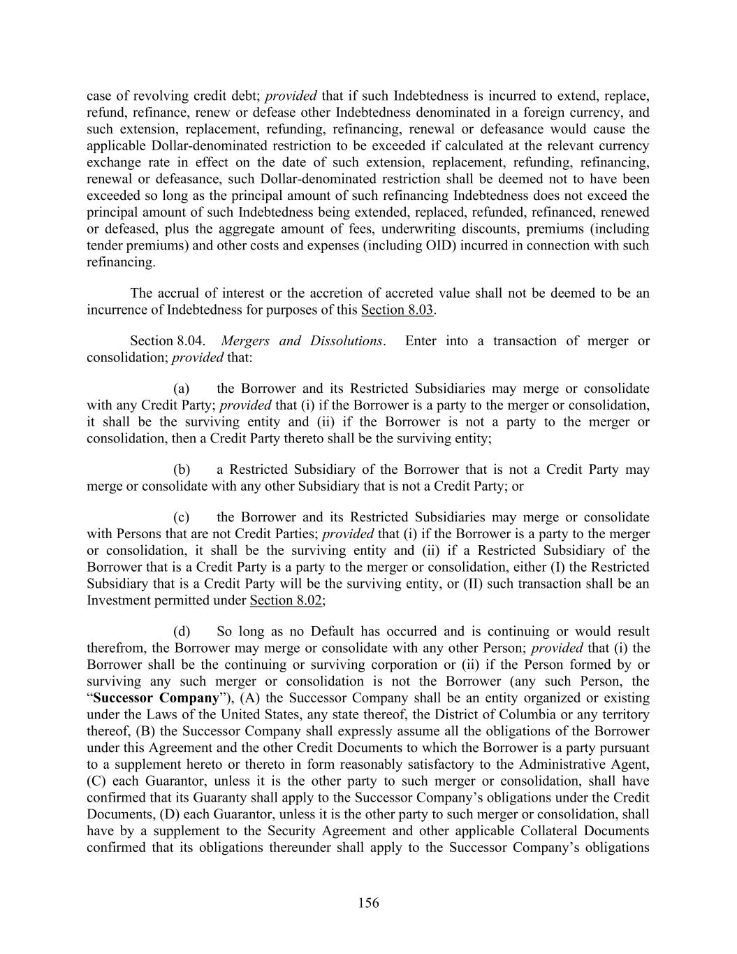 156 case of revolving credit debt; provided that if such Indebtedness is incurred to extend, replace, refund, refinance, renew or defease other Indebtedness denominated in a foreign currency, and such extension, replacement, refunding, refinancing, renewal or defeasance would cause the applicable Dollar-denominated restriction to be exceeded if calculated at the relevant currency exchange rate in effect on the date of such extension, replacement, refunding, refinancing, renewal or defeasance, such Dollar-denominated restriction shall be deemed not to have been exceeded so long as the principal amount of such refinancing Indebtedness does not exceed the principal amount of such Indebtedness being extended, replaced, refunded, refinanced, renewed or defeased, plus the aggregate amount of fees, underwriting discounts, premiums (including tender premiums) and other costs and expenses (including OID) incurred in connection with such refinancing. The accrual of interest or the accretion of accreted value shall not be deemed to be an incurrence of Indebtedness for purposes of this Section 8.03. Section 8.04. Mergers and Dissolutions. Enter into a transaction of merger or consolidation; provided that: (a) the Borrower and its Restricted Subsidiaries may merge or consolidate with any Credit Party; provided that (i) if the Borrower is a party to the merger or consolidation, it shall be the surviving entity and (ii) if the Borrower is not a party to the merger or consolidation, then a Credit Party thereto shall be the surviving entity; (b) a Restricted Subsidiary of the Borrower that is not a Credit Party may merge or consolidate with any other Subsidiary that is not a Credit Party; or (c) the Borrower and its Restricted Subsidiaries may merge or consolidate with Persons that are not Credit Parties; provided that (i) if the Borrower is a party to the merger or consolidation, it shall be the surviving entity and (ii) if a Restricted Subsidiary of the Borrower that is a Credit Party is a party to the merger or consolidation, either (I) the Restricted Subsidiary that is a Credit Party will be the surviving entity, or (II) such transaction shall be an Investment permitted under Section 8.02; (d) So long as no Default has occurred and is continuing or would result therefrom, the Borrower may merge or consolidate with any other Person; provided that (i) the Borrower shall be the continuing or surviving corporation or (ii) if the Person formed by or surviving any such merger or consolidation is not the Borrower (any such Person, the “Successor Company”), (A) the Successor Company shall be an entity organized or existing under the Laws of the United States, any state thereof, the District of Columbia or any territory thereof, (B) the Successor Company shall expressly assume all the obligations of the Borrower under this Agreement and the other Credit Documents to which the Borrower is a party pursuant to a supplement hereto or thereto in form reasonably satisfactory to the Administrative Agent, (C) each Guarantor, unless it is the other party to such merger or consolidation, shall have confirmed that its Guaranty shall apply to the Successor Company’s obligations under the Credit Documents, (D) each Guarantor, unless it is the other party to such merger or consolidation, shall have by a supplement to the Security Agreement and other applicable Collateral Documents confirmed that its obligations thereunder shall apply to the Successor Company’s obligations