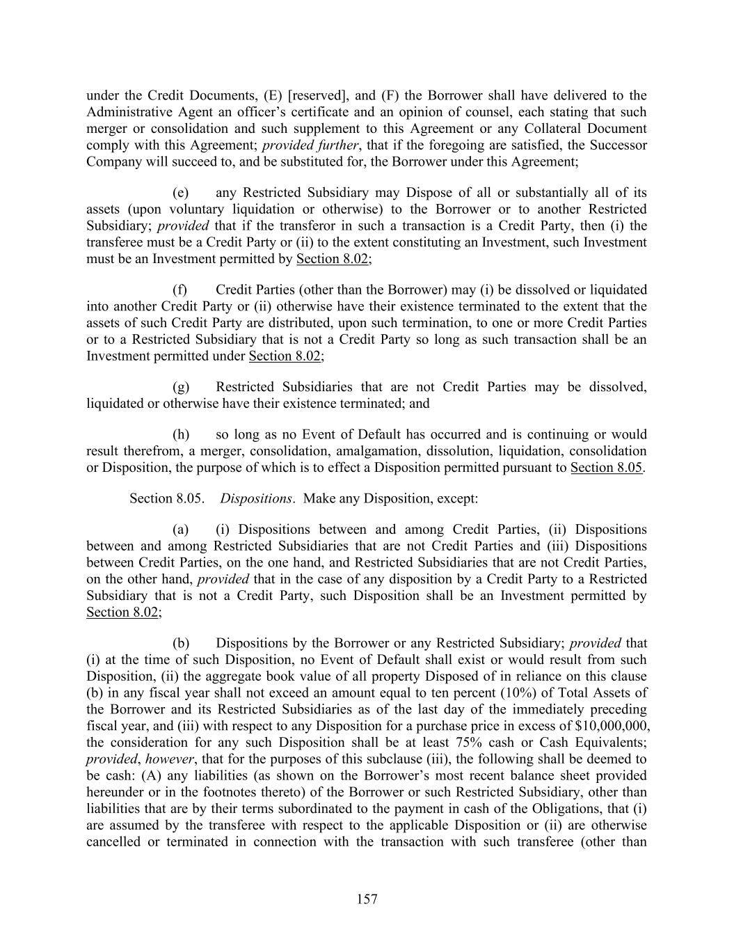 157 under the Credit Documents, (E) [reserved], and (F) the Borrower shall have delivered to the Administrative Agent an officer’s certificate and an opinion of counsel, each stating that such merger or consolidation and such supplement to this Agreement or any Collateral Document comply with this Agreement; provided further, that if the foregoing are satisfied, the Successor Company will succeed to, and be substituted for, the Borrower under this Agreement; (e) any Restricted Subsidiary may Dispose of all or substantially all of its assets (upon voluntary liquidation or otherwise) to the Borrower or to another Restricted Subsidiary; provided that if the transferor in such a transaction is a Credit Party, then (i) the transferee must be a Credit Party or (ii) to the extent constituting an Investment, such Investment must be an Investment permitted by Section 8.02; (f) Credit Parties (other than the Borrower) may (i) be dissolved or liquidated into another Credit Party or (ii) otherwise have their existence terminated to the extent that the assets of such Credit Party are distributed, upon such termination, to one or more Credit Parties or to a Restricted Subsidiary that is not a Credit Party so long as such transaction shall be an Investment permitted under Section 8.02; (g) Restricted Subsidiaries that are not Credit Parties may be dissolved, liquidated or otherwise have their existence terminated; and (h) so long as no Event of Default has occurred and is continuing or would result therefrom, a merger, consolidation, amalgamation, dissolution, liquidation, consolidation or Disposition, the purpose of which is to effect a Disposition permitted pursuant to Section 8.05. Section 8.05. Dispositions. Make any Disposition, except: (a) (i) Dispositions between and among Credit Parties, (ii) Dispositions between and among Restricted Subsidiaries that are not Credit Parties and (iii) Dispositions between Credit Parties, on the one hand, and Restricted Subsidiaries that are not Credit Parties, on the other hand, provided that in the case of any disposition by a Credit Party to a Restricted Subsidiary that is not a Credit Party, such Disposition shall be an Investment permitted by Section 8.02; (b) Dispositions by the Borrower or any Restricted Subsidiary; provided that (i) at the time of such Disposition, no Event of Default shall exist or would result from such Disposition, (ii) the aggregate book value of all property Disposed of in reliance on this clause (b) in any fiscal year shall not exceed an amount equal to ten percent (10%) of Total Assets of the Borrower and its Restricted Subsidiaries as of the last day of the immediately preceding fiscal year, and (iii) with respect to any Disposition for a purchase price in excess of $10,000,000, the consideration for any such Disposition shall be at least 75% cash or Cash Equivalents; provided, however, that for the purposes of this subclause (iii), the following shall be deemed to be cash: (A) any liabilities (as shown on the Borrower’s most recent balance sheet provided hereunder or in the footnotes thereto) of the Borrower or such Restricted Subsidiary, other than liabilities that are by their terms subordinated to the payment in cash of the Obligations, that (i) are assumed by the transferee with respect to the applicable Disposition or (ii) are otherwise cancelled or terminated in connection with the transaction with such transferee (other than
