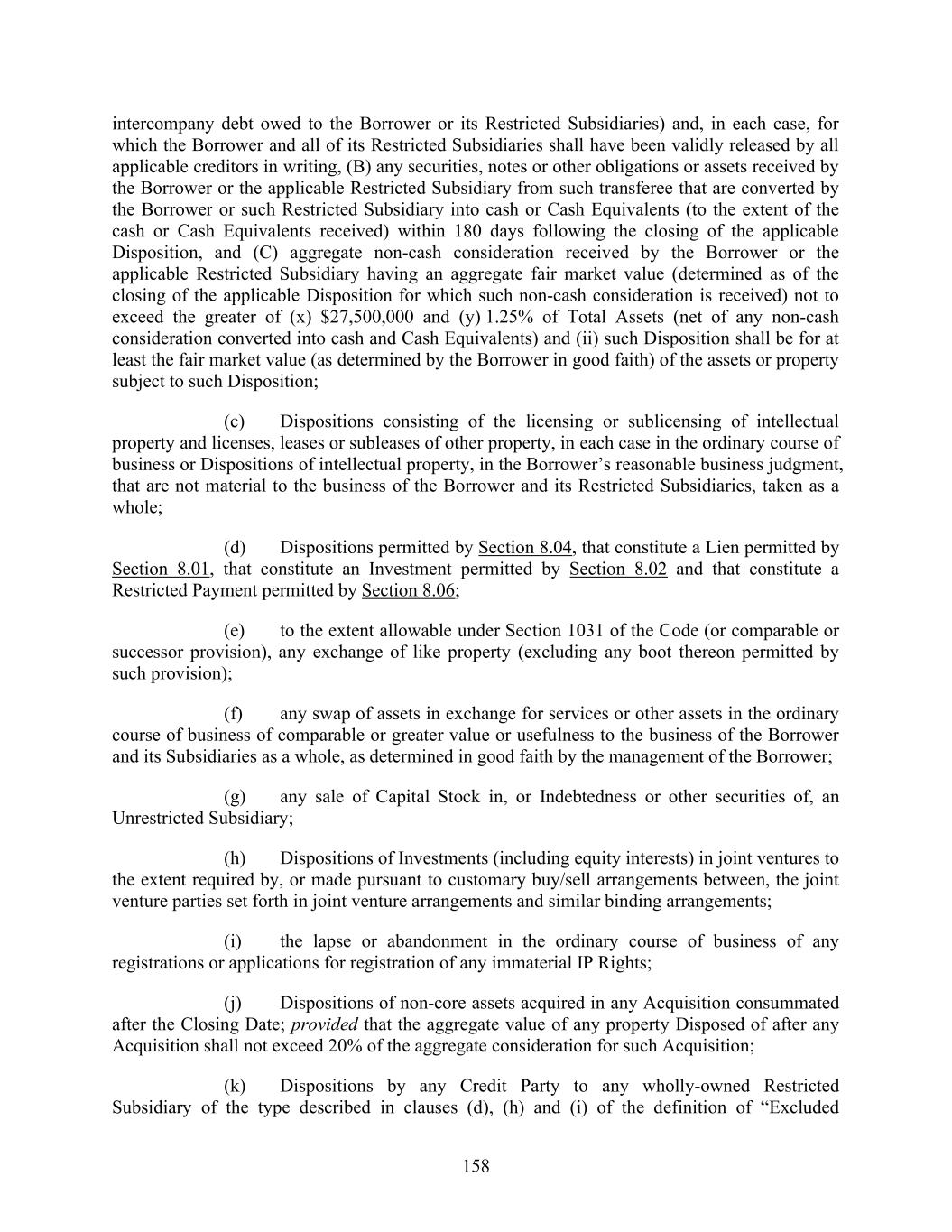 158 intercompany debt owed to the Borrower or its Restricted Subsidiaries) and, in each case, for which the Borrower and all of its Restricted Subsidiaries shall have been validly released by all applicable creditors in writing, (B) any securities, notes or other obligations or assets received by the Borrower or the applicable Restricted Subsidiary from such transferee that are converted by the Borrower or such Restricted Subsidiary into cash or Cash Equivalents (to the extent of the cash or Cash Equivalents received) within 180 days following the closing of the applicable Disposition, and (C) aggregate non-cash consideration received by the Borrower or the applicable Restricted Subsidiary having an aggregate fair market value (determined as of the closing of the applicable Disposition for which such non-cash consideration is received) not to exceed the greater of (x) $27,500,000 and (y) 1.25% of Total Assets (net of any non-cash consideration converted into cash and Cash Equivalents) and (ii) such Disposition shall be for at least the fair market value (as determined by the Borrower in good faith) of the assets or property subject to such Disposition; (c) Dispositions consisting of the licensing or sublicensing of intellectual property and licenses, leases or subleases of other property, in each case in the ordinary course of business or Dispositions of intellectual property, in the Borrower’s reasonable business judgment, that are not material to the business of the Borrower and its Restricted Subsidiaries, taken as a whole; (d) Dispositions permitted by Section 8.04, that constitute a Lien permitted by Section 8.01, that constitute an Investment permitted by Section 8.02 and that constitute a Restricted Payment permitted by Section 8.06; (e) to the extent allowable under Section 1031 of the Code (or comparable or successor provision), any exchange of like property (excluding any boot thereon permitted by such provision); (f) any swap of assets in exchange for services or other assets in the ordinary course of business of comparable or greater value or usefulness to the business of the Borrower and its Subsidiaries as a whole, as determined in good faith by the management of the Borrower; (g) any sale of Capital Stock in, or Indebtedness or other securities of, an Unrestricted Subsidiary; (h) Dispositions of Investments (including equity interests) in joint ventures to the extent required by, or made pursuant to customary buy/sell arrangements between, the joint venture parties set forth in joint venture arrangements and similar binding arrangements; (i) the lapse or abandonment in the ordinary course of business of any registrations or applications for registration of any immaterial IP Rights; (j) Dispositions of non-core assets acquired in any Acquisition consummated after the Closing Date; provided that the aggregate value of any property Disposed of after any Acquisition shall not exceed 20% of the aggregate consideration for such Acquisition; (k) Dispositions by any Credit Party to any wholly-owned Restricted Subsidiary of the type described in clauses (d), (h) and (i) of the definition of “Excluded
