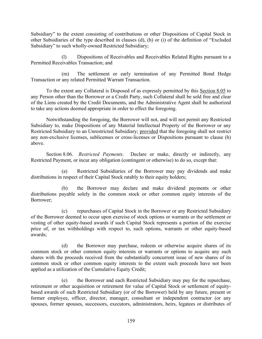 159 Subsidiary” to the extent consisting of contributions or other Dispositions of Capital Stock in other Subsidiaries of the type described in clauses (d), (h) or (i) of the definition of “Excluded Subsidiary” to such wholly-owned Restricted Subsidiary; (l) Dispositions of Receivables and Receivables Related Rights pursuant to a Permitted Receivables Transaction; and (m) The settlement or early termination of any Permitted Bond Hedge Transaction or any related Permitted Warrant Transaction. To the extent any Collateral is Disposed of as expressly permitted by this Section 8.05 to any Person other than the Borrower or a Credit Party, such Collateral shall be sold free and clear of the Liens created by the Credit Documents, and the Administrative Agent shall be authorized to take any actions deemed appropriate in order to effect the foregoing. Notwithstanding the foregoing, the Borrower will not, and will not permit any Restricted Subsidiary to, make Dispositions of any Material Intellectual Property of the Borrower or any Restricted Subsidiary to an Unrestricted Subsidiary; provided that the foregoing shall not restrict any non-exclusive licenses, sublicenses or cross-licenses or Dispositions pursuant to clause (h) above. Section 8.06. Restricted Payments. Declare or make, directly or indirectly, any Restricted Payment, or incur any obligation (contingent or otherwise) to do so, except that: (a) Restricted Subsidiaries of the Borrower may pay dividends and make distributions in respect of their Capital Stock ratably to their equity holders; (b) the Borrower may declare and make dividend payments or other distributions payable solely in the common stock or other common equity interests of the Borrower; (c) repurchases of Capital Stock in the Borrower or any Restricted Subsidiary of the Borrower deemed to occur upon exercise of stock options or warrants or the settlement or vesting of other equity-based awards if such Capital Stock represents a portion of the exercise price of, or tax withholdings with respect to, such options, warrants or other equity-based awards; (d) the Borrower may purchase, redeem or otherwise acquire shares of its common stock or other common equity interests or warrants or options to acquire any such shares with the proceeds received from the substantially concurrent issue of new shares of its common stock or other common equity interests to the extent such proceeds have not been applied as a utilization of the Cumulative Equity Credit; (e) the Borrower and each Restricted Subsidiary may pay for the repurchase, retirement or other acquisition or retirement for value of Capital Stock or settlement of equity- based awards of such Restricted Subsidiary (or of the Borrower) held by any future, present or former employee, officer, director, manager, consultant or independent contractor (or any spouses, former spouses, successors, executors, administrators, heirs, legatees or distributes of