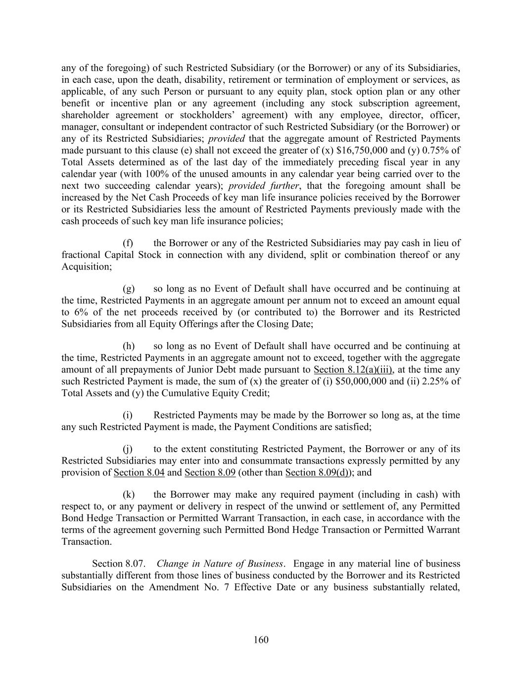 160 any of the foregoing) of such Restricted Subsidiary (or the Borrower) or any of its Subsidiaries, in each case, upon the death, disability, retirement or termination of employment or services, as applicable, of any such Person or pursuant to any equity plan, stock option plan or any other benefit or incentive plan or any agreement (including any stock subscription agreement, shareholder agreement or stockholders’ agreement) with any employee, director, officer, manager, consultant or independent contractor of such Restricted Subsidiary (or the Borrower) or any of its Restricted Subsidiaries; provided that the aggregate amount of Restricted Payments made pursuant to this clause (e) shall not exceed the greater of (x) $16,750,000 and (y) 0.75% of Total Assets determined as of the last day of the immediately preceding fiscal year in any calendar year (with 100% of the unused amounts in any calendar year being carried over to the next two succeeding calendar years); provided further, that the foregoing amount shall be increased by the Net Cash Proceeds of key man life insurance policies received by the Borrower or its Restricted Subsidiaries less the amount of Restricted Payments previously made with the cash proceeds of such key man life insurance policies; (f) the Borrower or any of the Restricted Subsidiaries may pay cash in lieu of fractional Capital Stock in connection with any dividend, split or combination thereof or any Acquisition; (g) so long as no Event of Default shall have occurred and be continuing at the time, Restricted Payments in an aggregate amount per annum not to exceed an amount equal to 6% of the net proceeds received by (or contributed to) the Borrower and its Restricted Subsidiaries from all Equity Offerings after the Closing Date; (h) so long as no Event of Default shall have occurred and be continuing at the time, Restricted Payments in an aggregate amount not to exceed, together with the aggregate amount of all prepayments of Junior Debt made pursuant to Section 8.12(a)(iii), at the time any such Restricted Payment is made, the sum of (x) the greater of (i) $50,000,000 and (ii) 2.25% of Total Assets and (y) the Cumulative Equity Credit; (i) Restricted Payments may be made by the Borrower so long as, at the time any such Restricted Payment is made, the Payment Conditions are satisfied; (j) to the extent constituting Restricted Payment, the Borrower or any of its Restricted Subsidiaries may enter into and consummate transactions expressly permitted by any provision of Section 8.04 and Section 8.09 (other than Section 8.09(d)); and (k) the Borrower may make any required payment (including in cash) with respect to, or any payment or delivery in respect of the unwind or settlement of, any Permitted Bond Hedge Transaction or Permitted Warrant Transaction, in each case, in accordance with the terms of the agreement governing such Permitted Bond Hedge Transaction or Permitted Warrant Transaction. Section 8.07. Change in Nature of Business. Engage in any material line of business substantially different from those lines of business conducted by the Borrower and its Restricted Subsidiaries on the Amendment No. 7 Effective Date or any business substantially related,