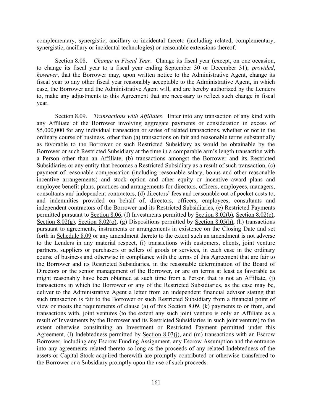 161 complementary, synergistic, ancillary or incidental thereto (including related, complementary, synergistic, ancillary or incidental technologies) or reasonable extensions thereof. Section 8.08. Change in Fiscal Year. Change its fiscal year (except, on one occasion, to change its fiscal year to a fiscal year ending September 30 or December 31); provided, however, that the Borrower may, upon written notice to the Administrative Agent, change its fiscal year to any other fiscal year reasonably acceptable to the Administrative Agent, in which case, the Borrower and the Administrative Agent will, and are hereby authorized by the Lenders to, make any adjustments to this Agreement that are necessary to reflect such change in fiscal year. Section 8.09. Transactions with Affiliates. Enter into any transaction of any kind with any Affiliate of the Borrower involving aggregate payments or consideration in excess of $5,000,000 for any individual transaction or series of related transactions, whether or not in the ordinary course of business, other than (a) transactions on fair and reasonable terms substantially as favorable to the Borrower or such Restricted Subsidiary as would be obtainable by the Borrower or such Restricted Subsidiary at the time in a comparable arm’s length transaction with a Person other than an Affiliate, (b) transactions amongst the Borrower and its Restricted Subsidiaries or any entity that becomes a Restricted Subsidiary as a result of such transaction, (c) payment of reasonable compensation (including reasonable salary, bonus and other reasonable incentive arrangements) and stock option and other equity or incentive award plans and employee benefit plans, practices and arrangements for directors, officers, employees, managers, consultants and independent contractors, (d) directors’ fees and reasonable out of pocket costs to, and indemnities provided on behalf of, directors, officers, employees, consultants and independent contractors of the Borrower and its Restricted Subsidiaries, (e) Restricted Payments permitted pursuant to Section 8.06, (f) Investments permitted by Section 8.02(b), Section 8.02(c), Section 8.02(g), Section 8.02(o), (g) Dispositions permitted by Section 8.05(h), (h) transactions pursuant to agreements, instruments or arrangements in existence on the Closing Date and set forth in Schedule 8.09 or any amendment thereto to the extent such an amendment is not adverse to the Lenders in any material respect, (i) transactions with customers, clients, joint venture partners, suppliers or purchasers or sellers of goods or services, in each case in the ordinary course of business and otherwise in compliance with the terms of this Agreement that are fair to the Borrower and its Restricted Subsidiaries, in the reasonable determination of the Board of Directors or the senior management of the Borrower, or are on terms at least as favorable as might reasonably have been obtained at such time from a Person that is not an Affiliate, (j) transactions in which the Borrower or any of the Restricted Subsidiaries, as the case may be, deliver to the Administrative Agent a letter from an independent financial advisor stating that such transaction is fair to the Borrower or such Restricted Subsidiary from a financial point of view or meets the requirements of clause (a) of this Section 8.09, (k) payments to or from, and transactions with, joint ventures (to the extent any such joint venture is only an Affiliate as a result of Investments by the Borrower and its Restricted Subsidiaries in such joint venture) to the extent otherwise constituting an Investment or Restricted Payment permitted under this Agreement, (l) Indebtedness permitted by Section 8.03(j), and (m) transactions with an Escrow Borrower, including any Escrow Funding Assignment, any Escrow Assumption and the entrance into any agreements related thereto so long as the proceeds of any related Indebtedness of the assets or Capital Stock acquired therewith are promptly contributed or otherwise transferred to the Borrower or a Subsidiary promptly upon the use of such proceeds.